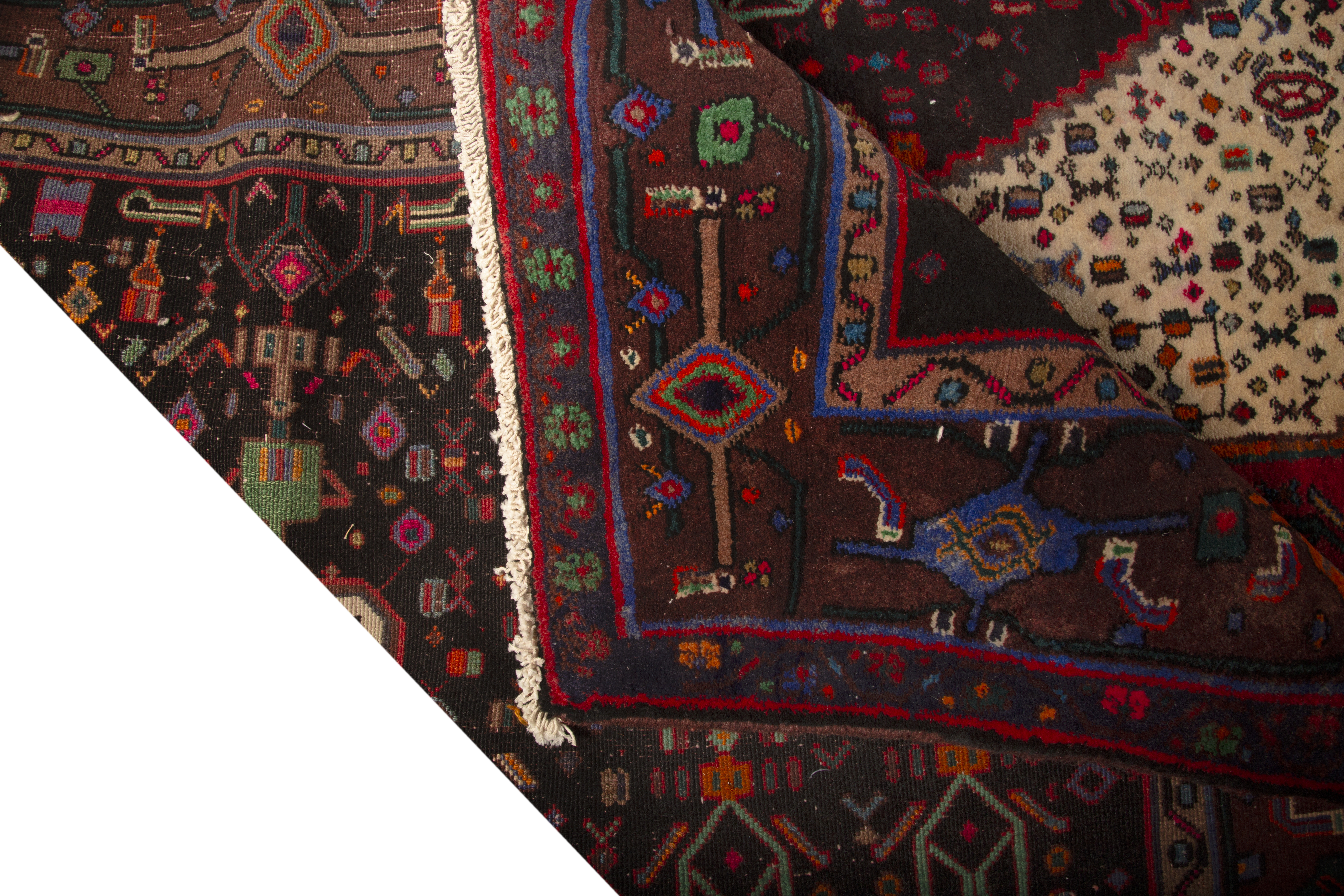 The central medallion, known as Toranj, represents the cosmic center and divine protection in Persian symbolism, while the surrounding Herati pattern tells stories of fish swimming around diamonds, symbolizing abundance and prosperity. The sophisticated interplay of dark red borders with brown and black geometric guards creates a formal framework that elevates this piece from mere floor covering to a work of art that speaks to centuries of cultural heritage.