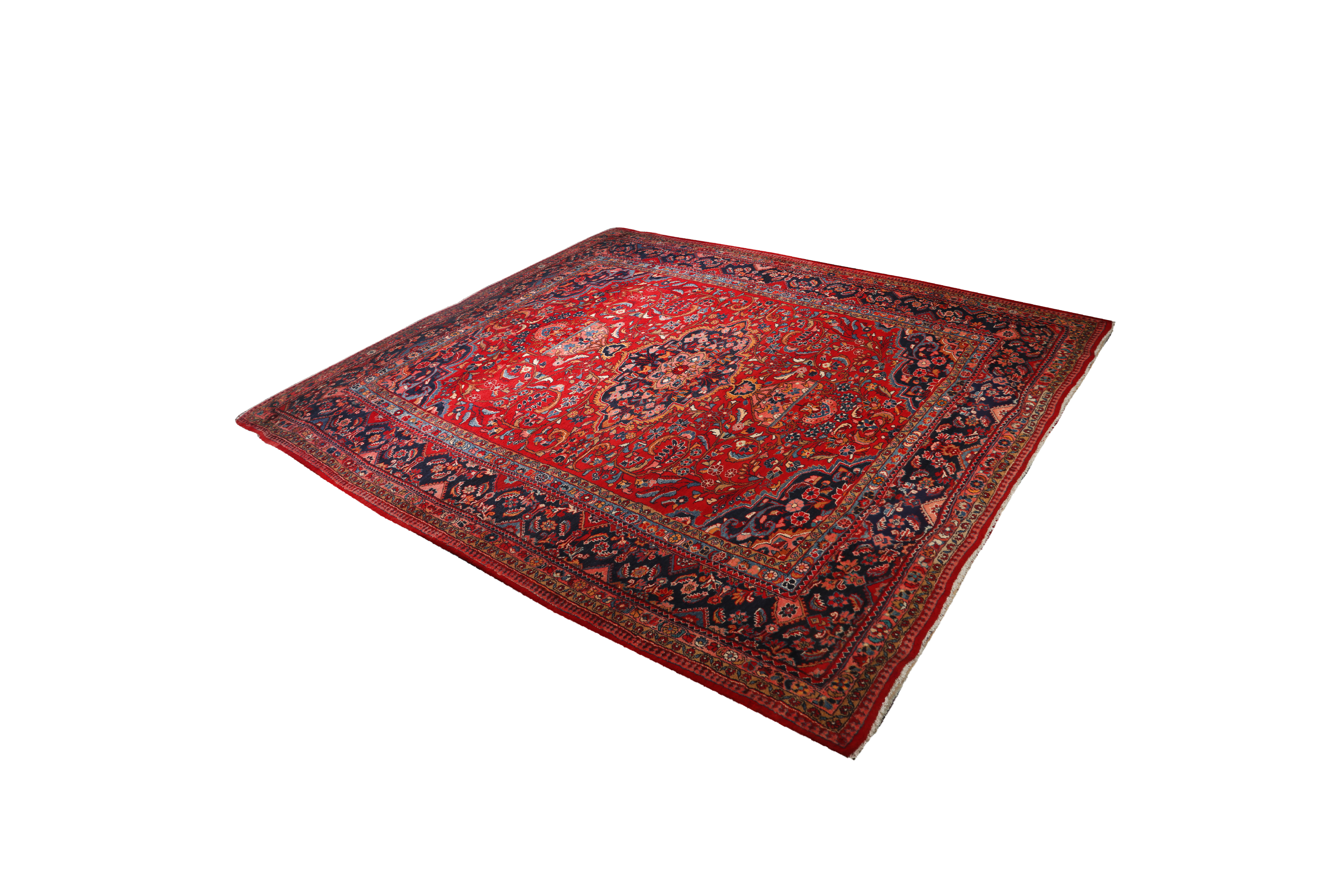 With its Geometric design in Red, Navy Blue and its generous 14x10 ft format, this Semi Antique Lilihan rug represents the authentic weaving heritage of Markazi, where rugs of this quality have been hand-knotted for generations.