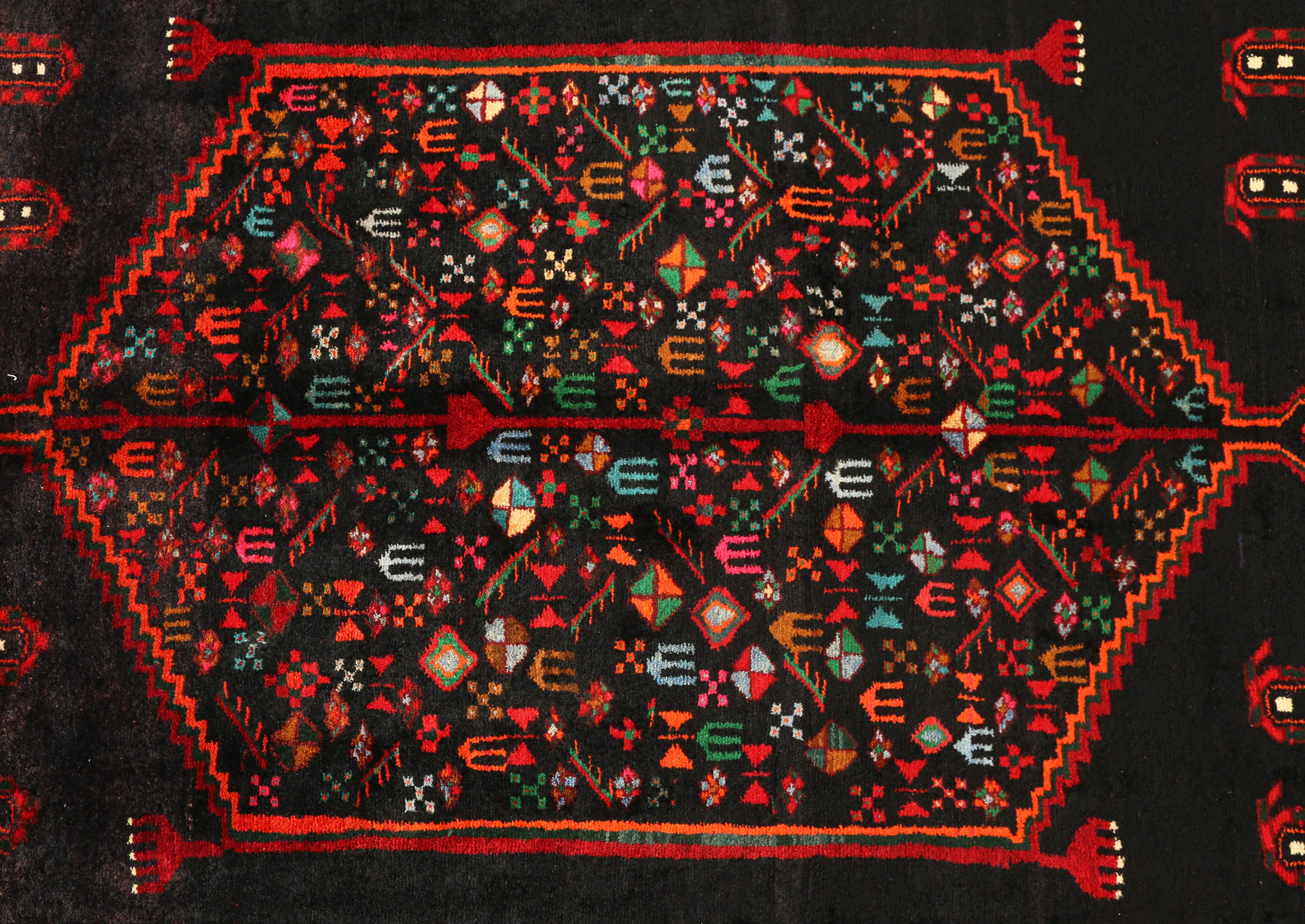 The rich color harmony of crimson, burgundy, and navy creates depth and sophistication that complements both traditional and contemporary interiors. This one-of-a-kind hand-knotted masterpiece elevates any space with its commanding presence and timeless elegance, particularly stunning when placed in spaces where its full length can be appreciated. The ivory accents provide luminous contrast that brightens the overall composition, while the black outlines define each motif with crisp precision.
