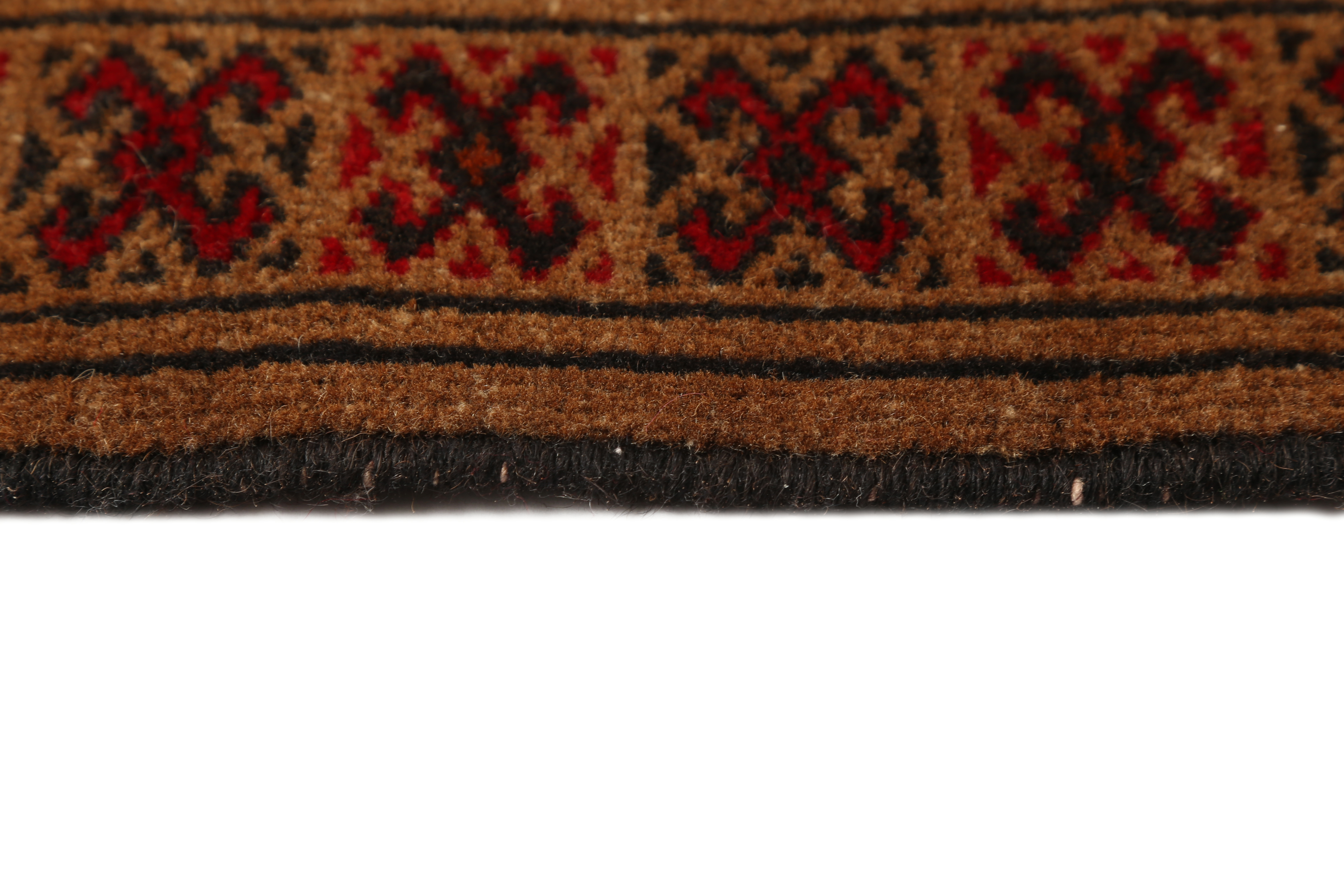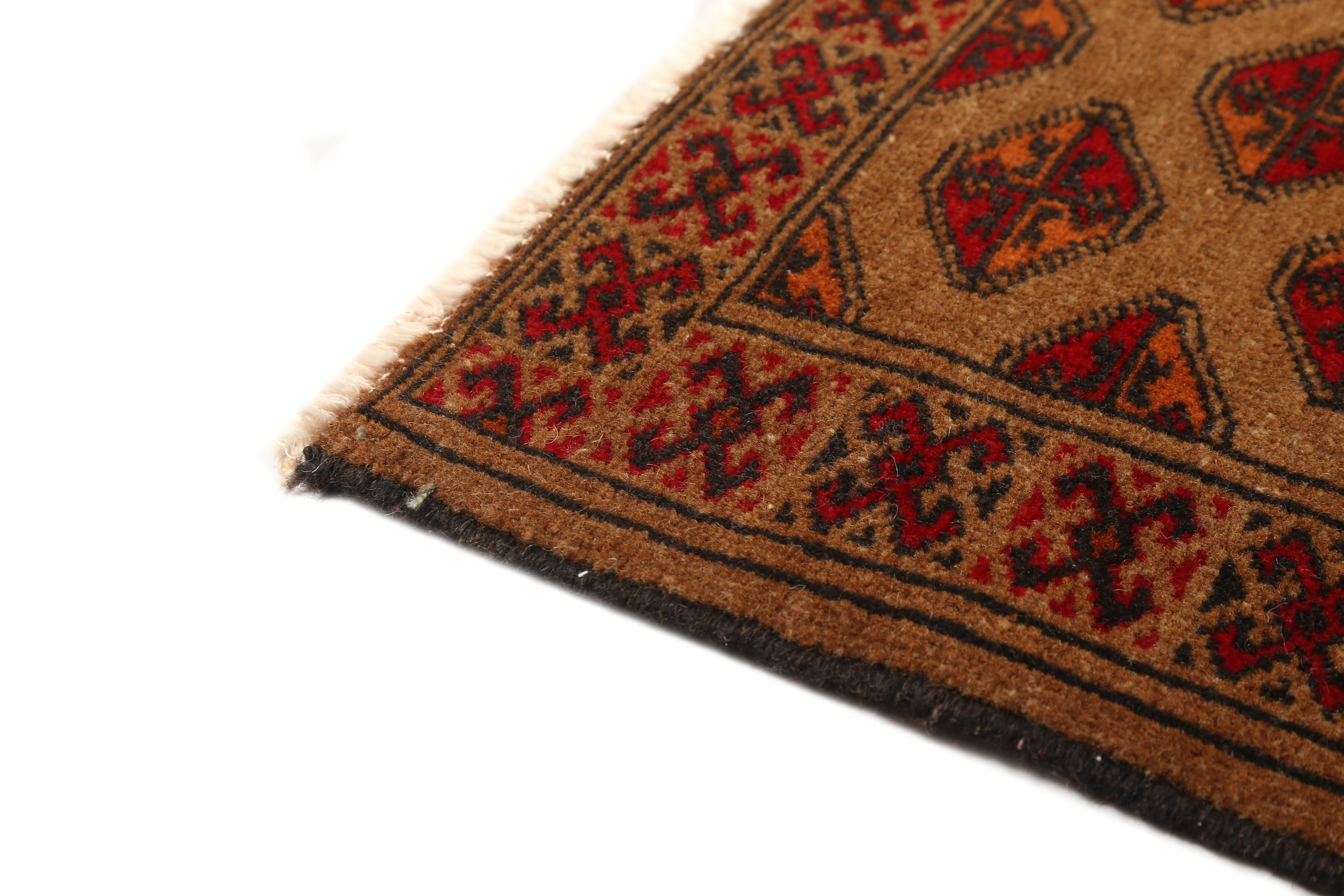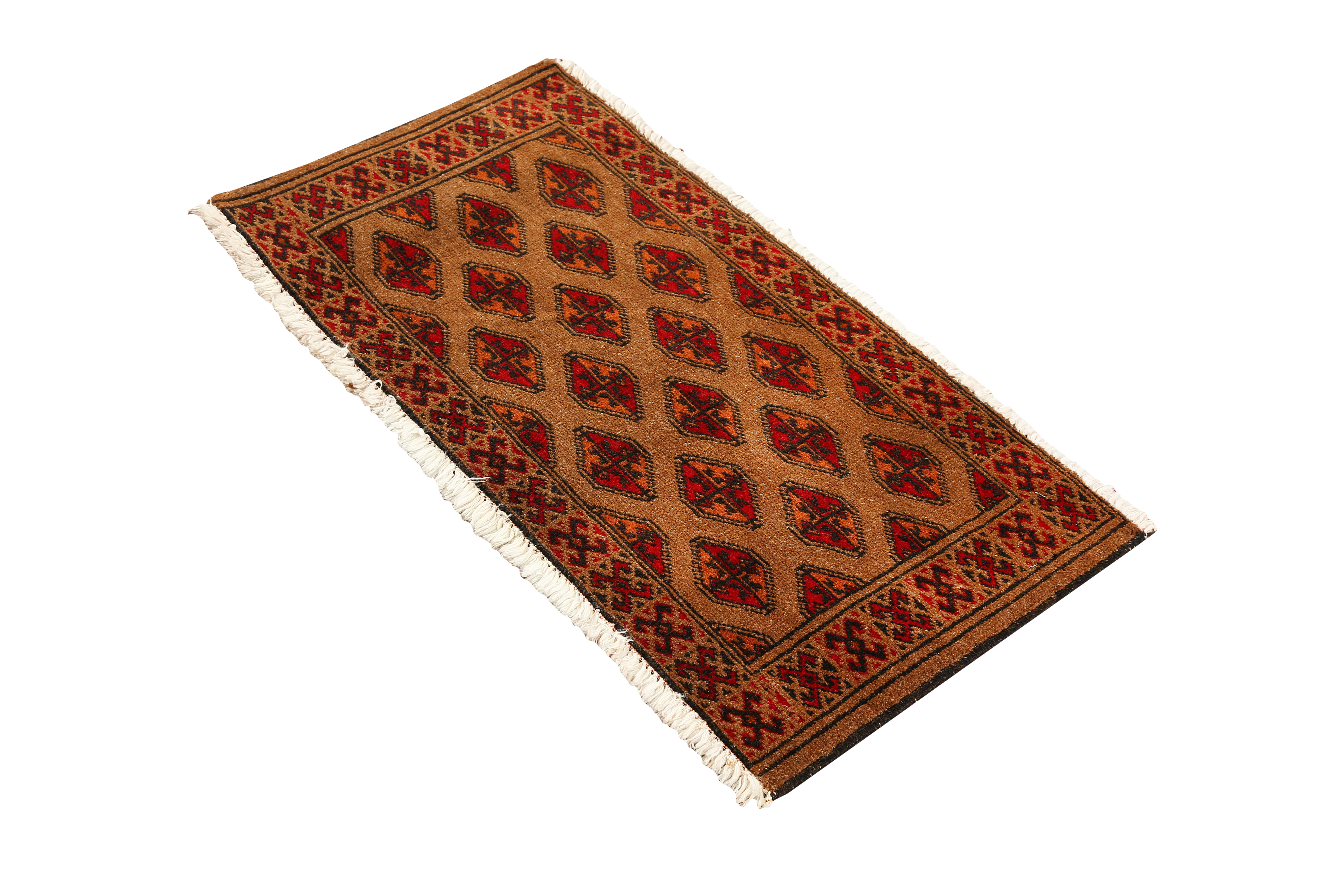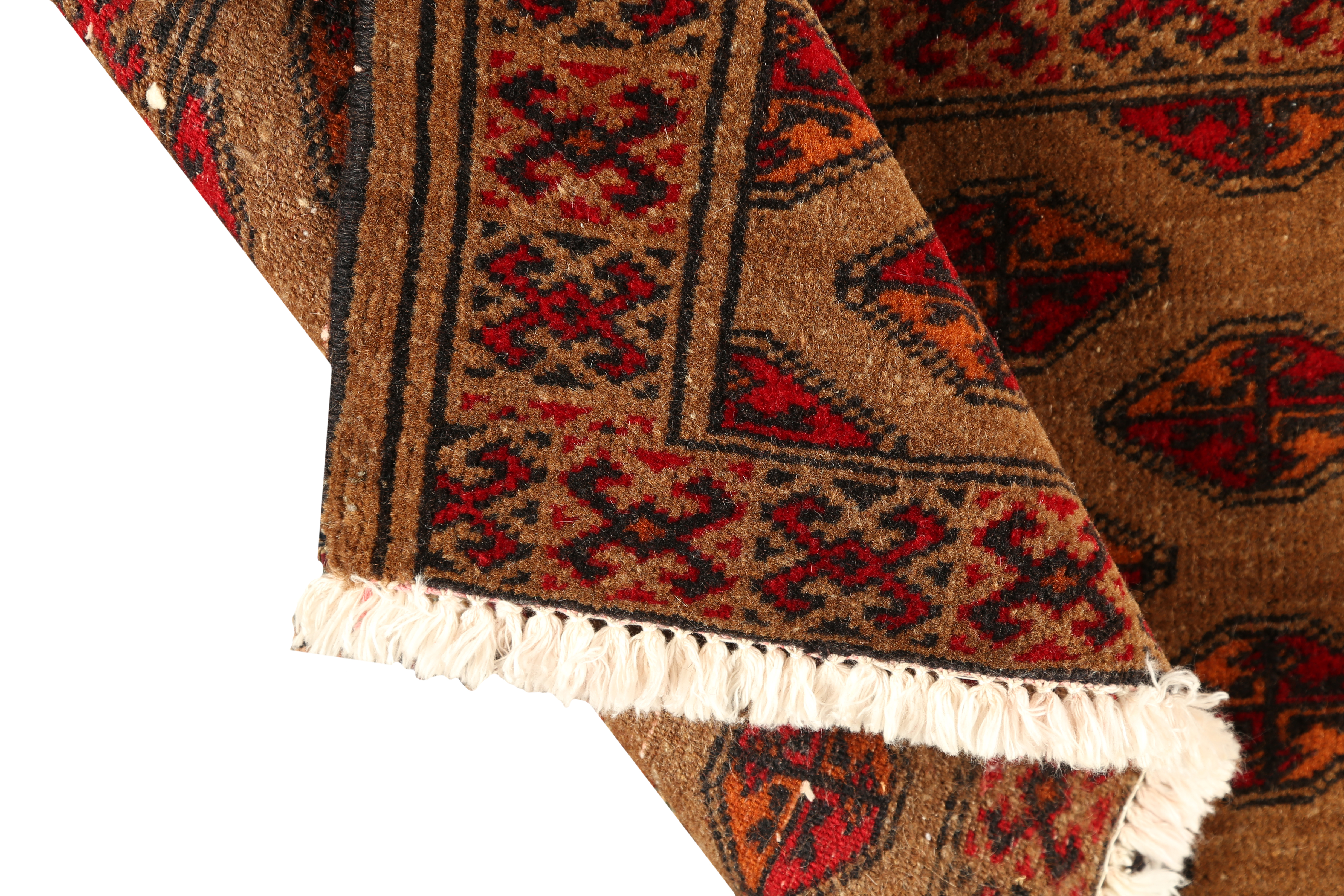 A superb example of Turkmen weaving heritage, this 2x1 ft Semi Antique rug showcases the celebrated Geometric design of Golestan, Khorasan, rendered here in rich tones of Crimson, Navy Blue with the authority of long tradition.