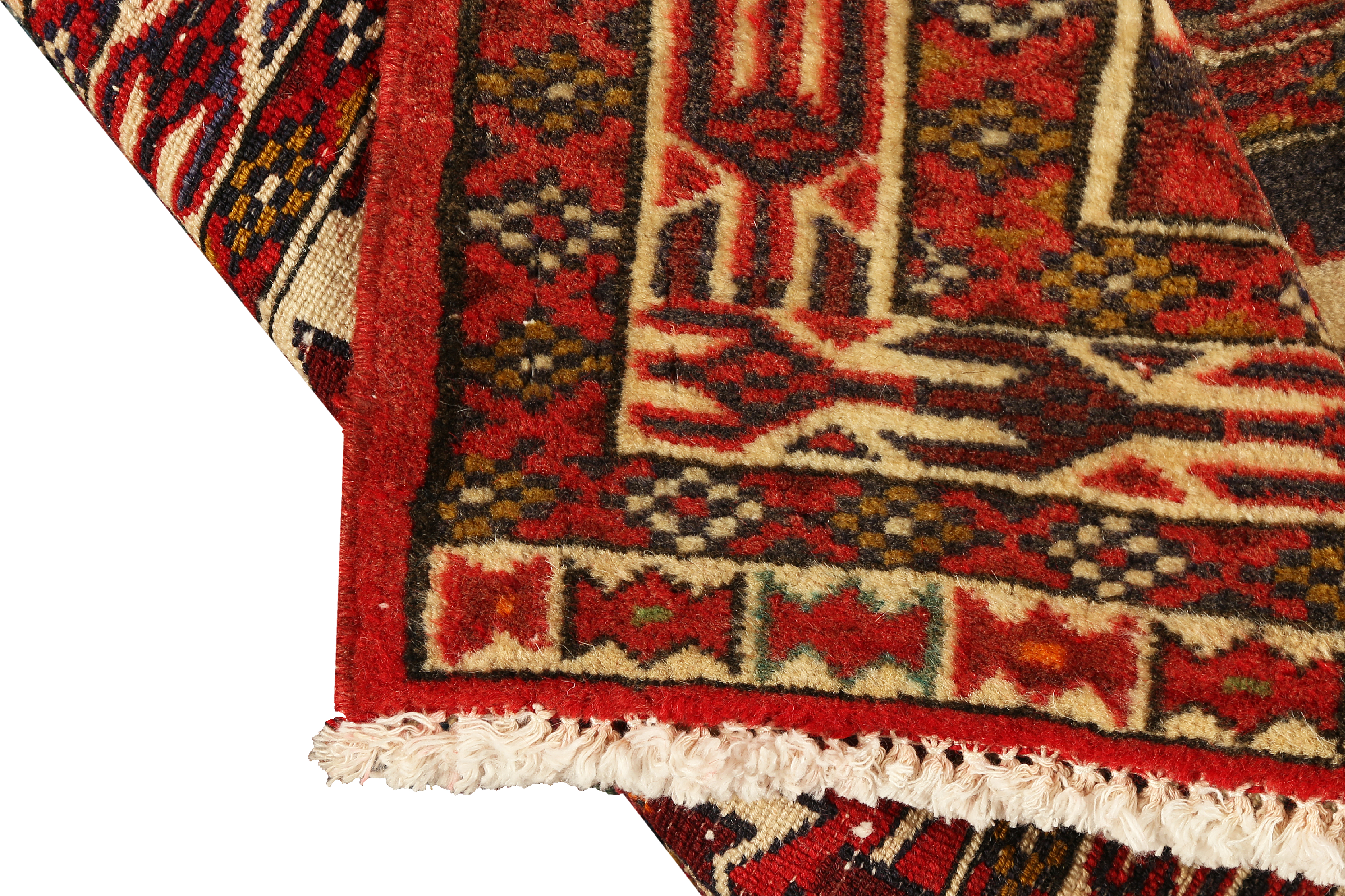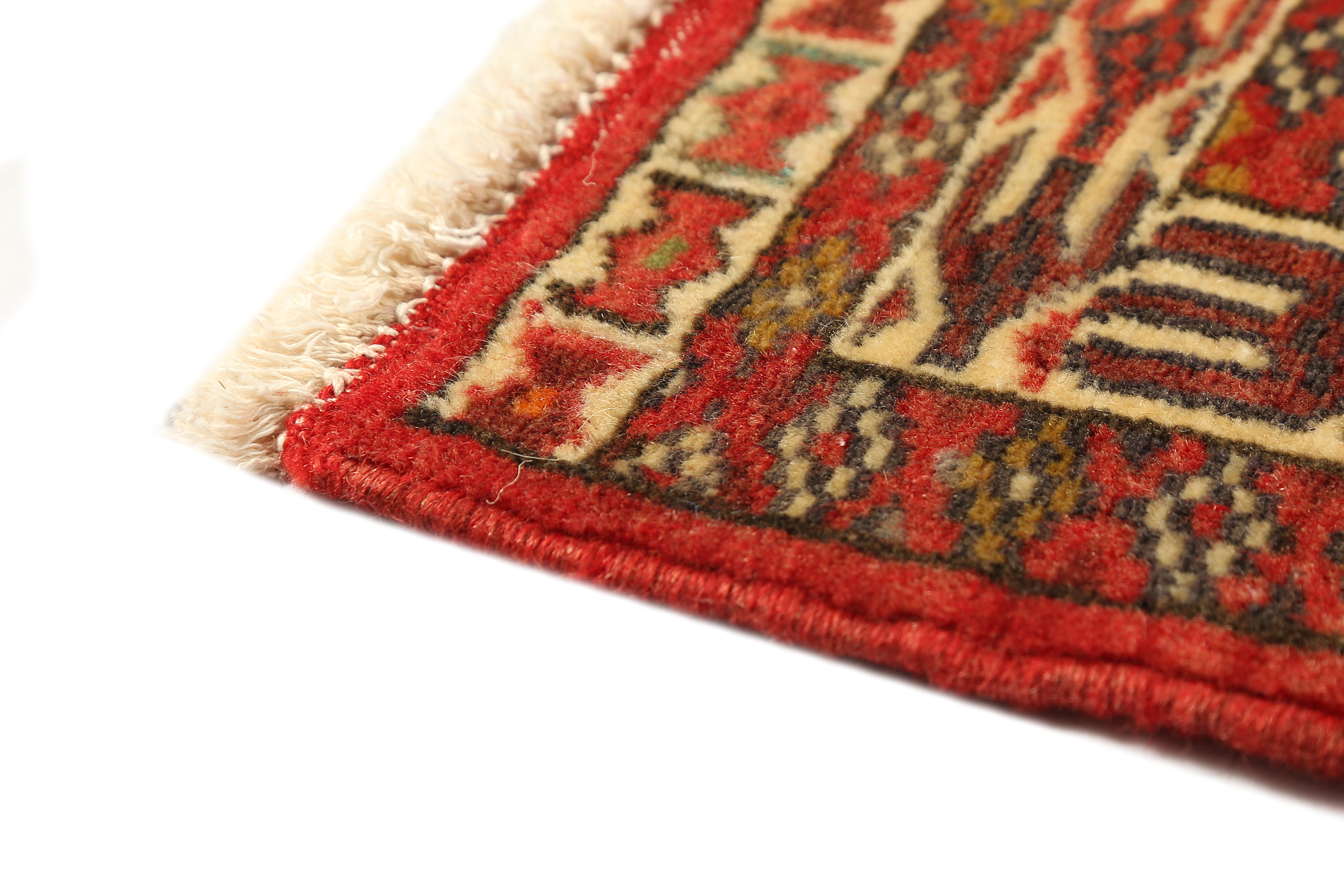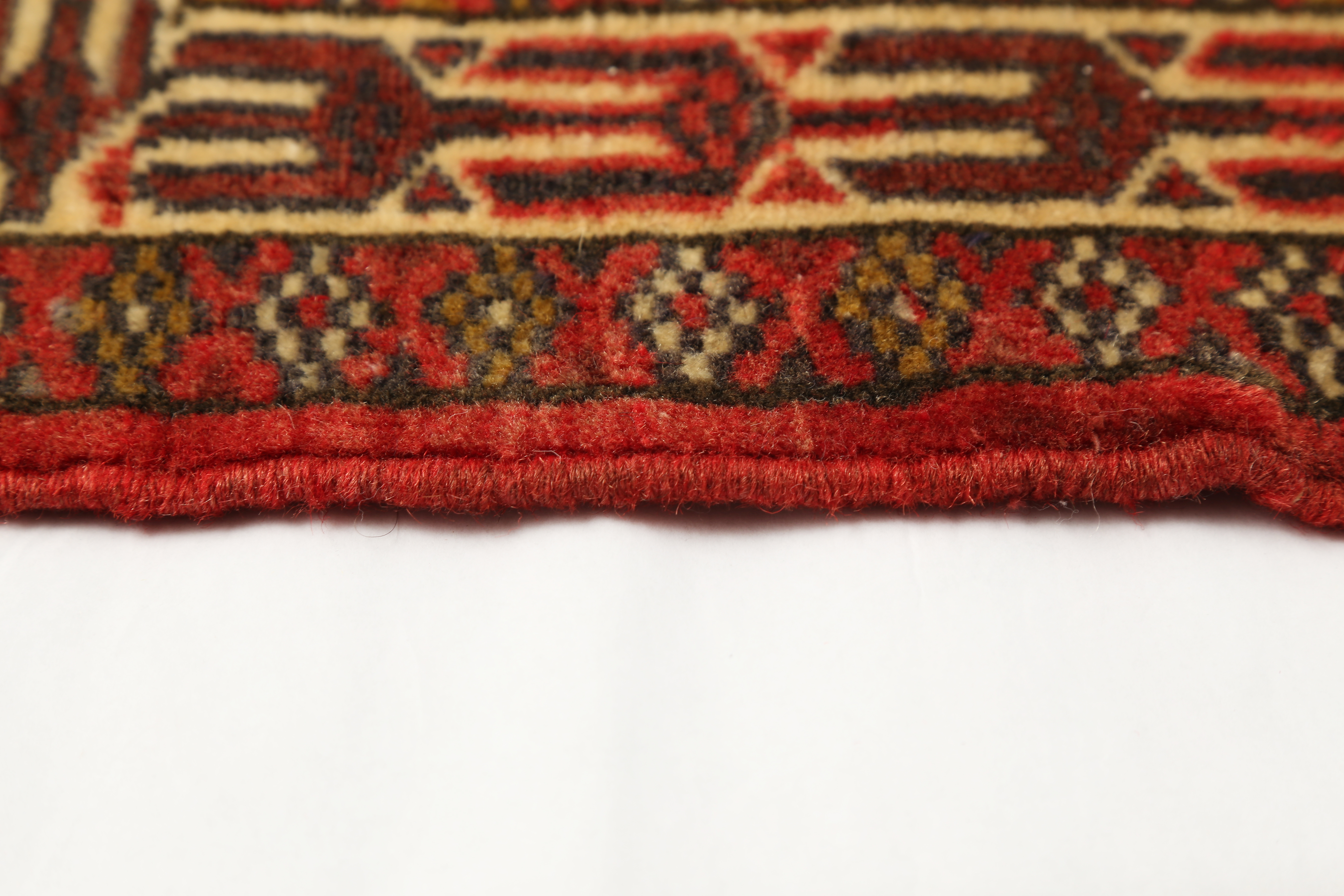 Measuring 2x1 ft and featuring a Geometric design in Crimson, Navy Blue, this Semi Antique Turkmen rug embodies the weaving culture of Golestan, Khorasan - a tradition of exceptional artistry and enduring craft excellence. The construction of Turkmen rugs is unique in the Persian weaving world: woven entirely in wool - pile, warp, and weft - using the Persian asymmetrical knot at high densities on portable horizontal looms, these rugs achieve a silky-smooth pile surface of extraordinary refinement. The all-wool construction gives Turkmen rugs a flexibility and warmth unlike the stiffer cotton-foundation rugs of city and village weaving centers, with a pile that seems almost liquid in its smoothness.