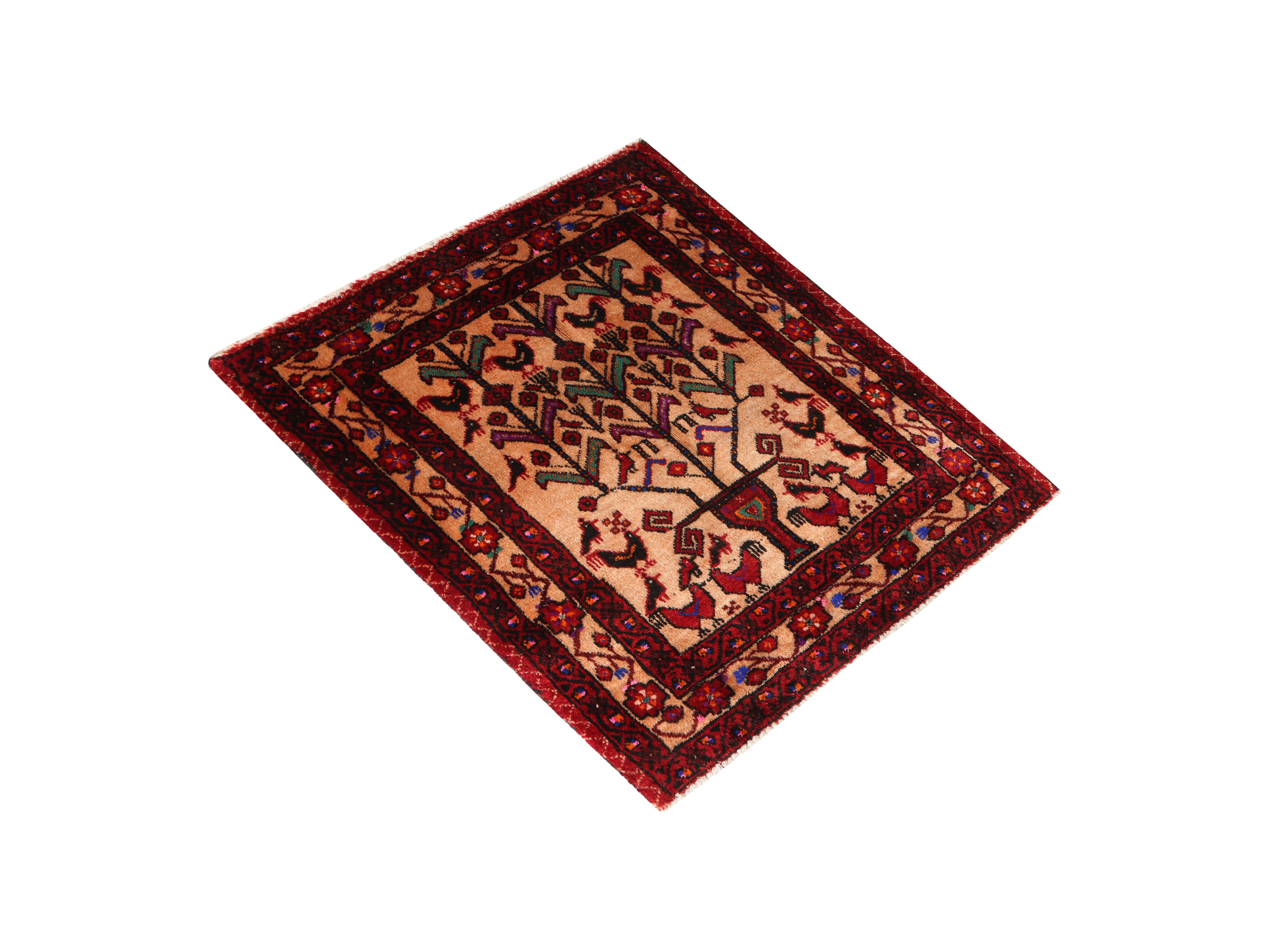 This intimate 2'7" x 2'7" Baluch Persian rug captures the essence of nomadic artistry with its profound Tree of Life motif rendered in a palette of madder red, camel, and burgundy. Woven by skilled Persian artisans between 40-60 years ago, this semi antique treasure exemplifies the spiritual symbolism deeply embedded in Baluch weaving traditions, where the Tree of Life represents the connection between earth and heaven, mortality and eternity.