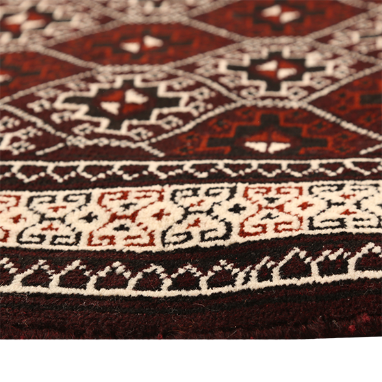 The construction of Turkmen rugs is unique in the Persian weaving world: woven entirely in wool - pile, warp, and weft - using the Persian asymmetrical knot at high densities on portable horizontal looms, these rugs achieve a