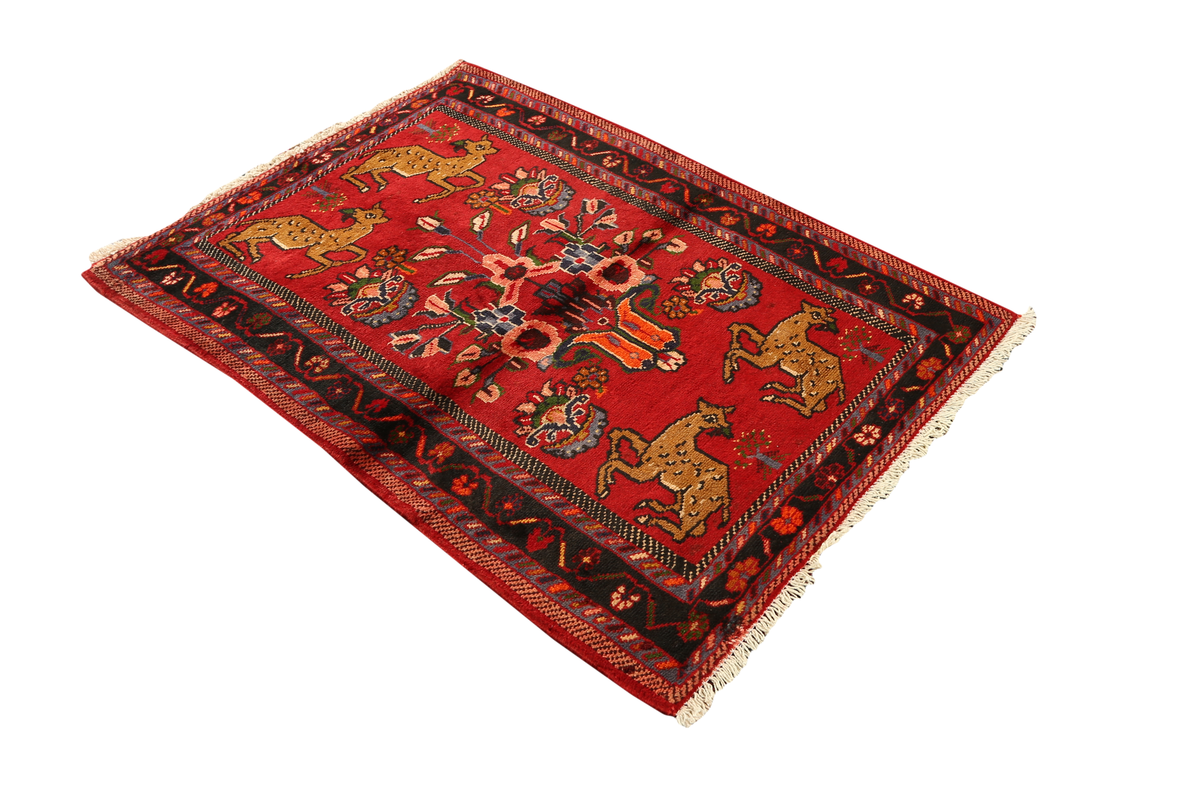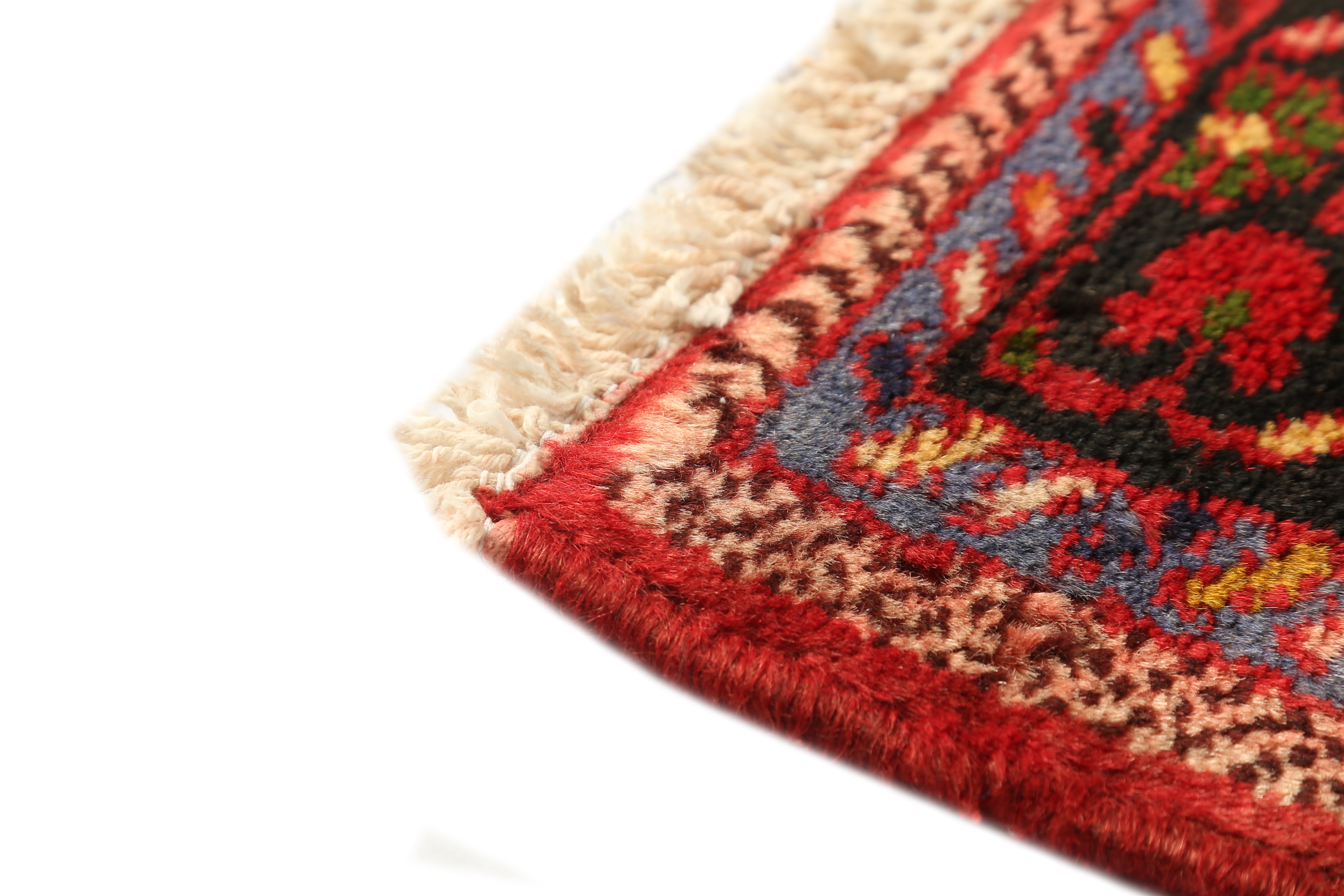 This Hamadan rug was woven using the symmetrical Turkish knot, also known as the Ghiordes knot. In this technique, the pile yarn is looped symmetrically around two adjacent warp threads, producing a more robust and raised pile than the asymmetrical Persian knot. This knotting technique is characteristic of some Kurdish, Caucasian, and tribal Persian weaving traditions.