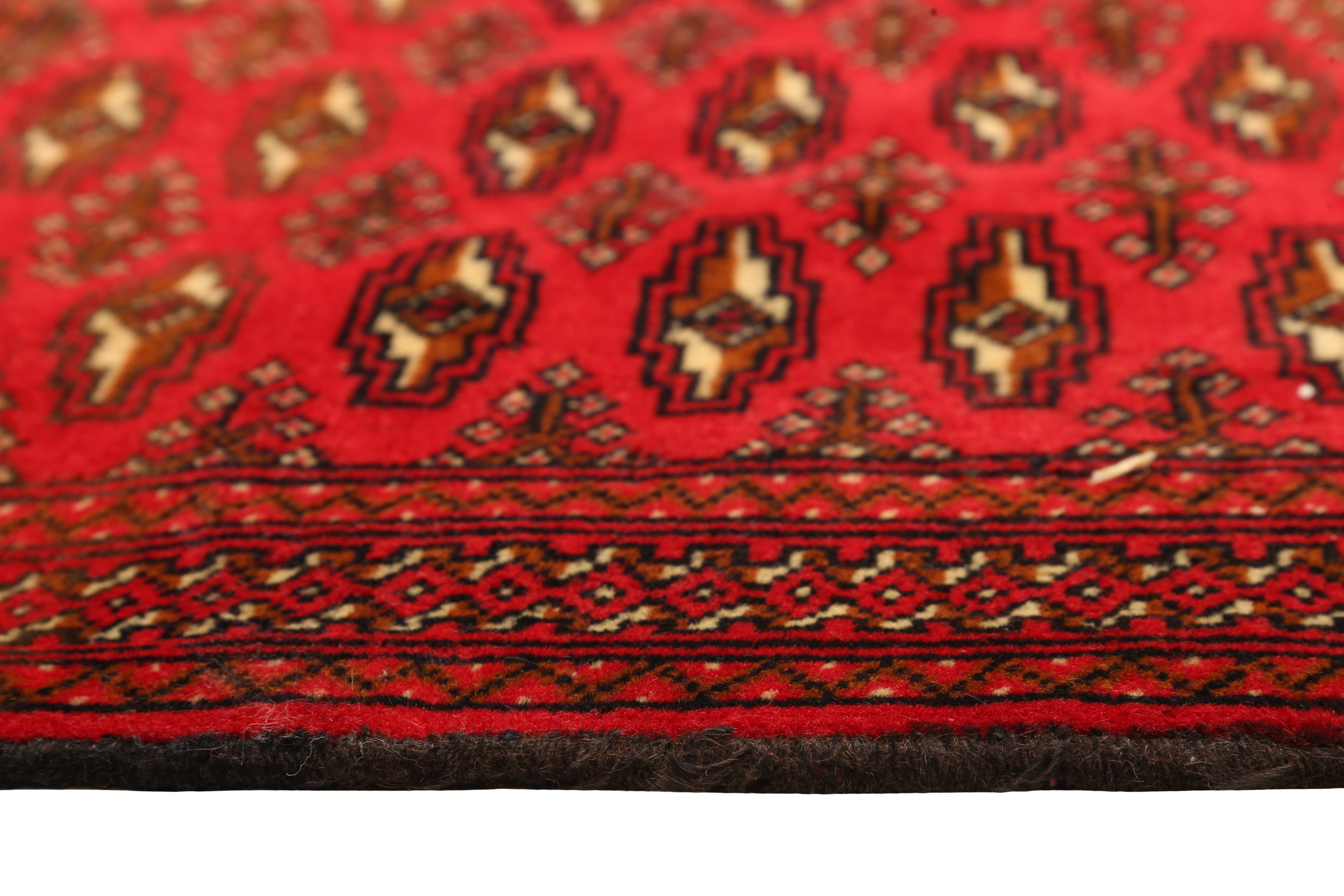 With its Geometric design in Crimson, Navy Blue and its generous 3x1 ft format, this Semi Antique Turkmen rug represents the authentic weaving heritage of Golestan, Khorasan, where rugs of this quality have been hand-knotted for generations. The color palette of Turkmen rugs is the most restricted and most immediately recognizable in all of Persian weaving. The characteristic deep, warm burgundy red - achieved with madder and pomegranate dyes processed by techniques developed over centuries - covers the majority of the field, contrasted with near-black secondary elements, dark blue accents, and the warm ivory of undyed wool. This palette reflects not commercial calculation but genuine cultural identity, the natural expression of a tribal aesthetic developed in the landscapes of Central Asia.