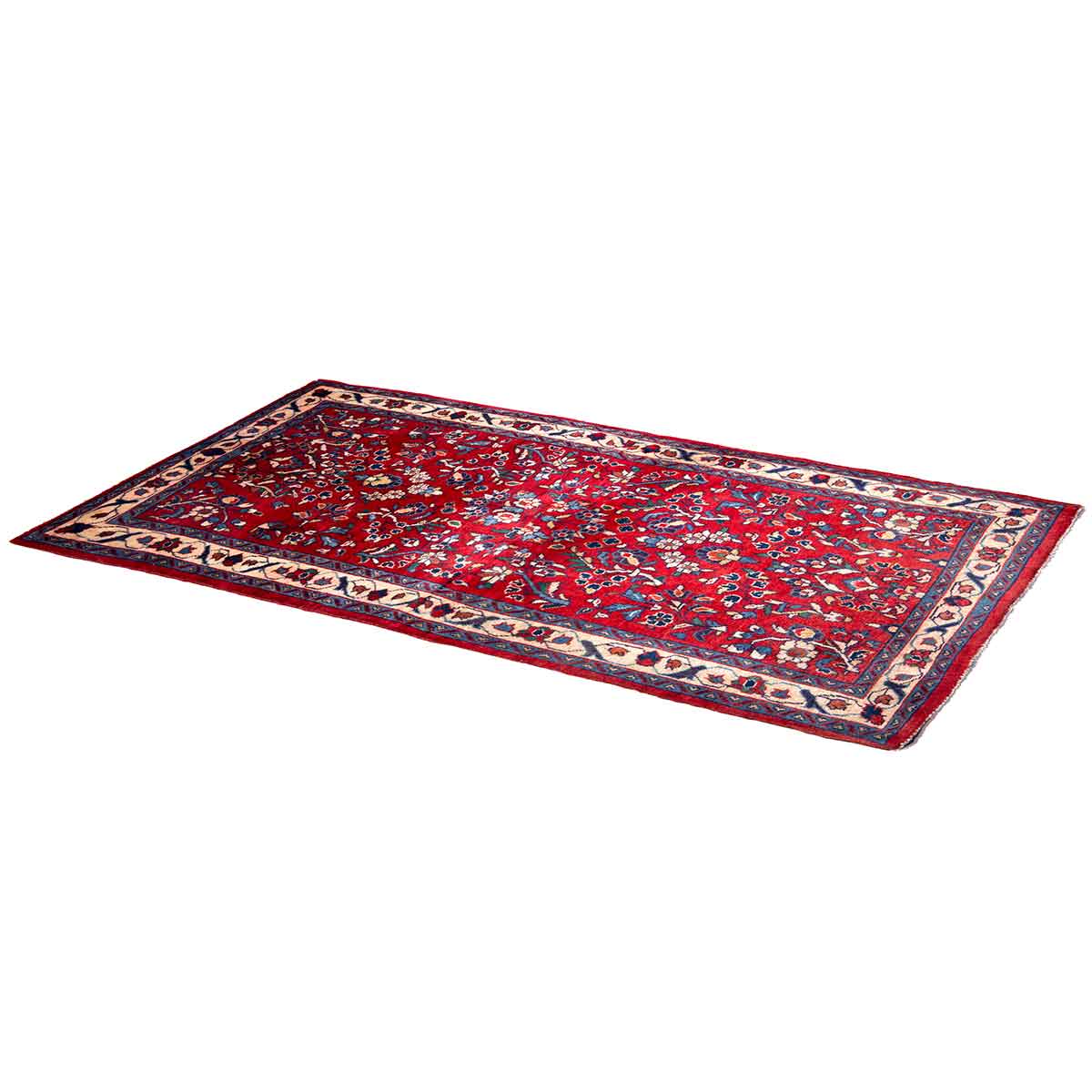 This remarkable semi antique Sarouk Persian runner presents an extraordinary meditation on compact elegance, measuring a precise 4'3" x 1'12" and showcasing the exquisite medallion artistry that has defined Persian weaving for centuries. The luminous madder red field creates a dramatic foundation, while the intricate central toranj medallion blooms in cream and navy blue, surrounded by delicate Shah Abbasi palmettes and traditional Herati motifs that speak to the masterful hands of Markazi province artisans.