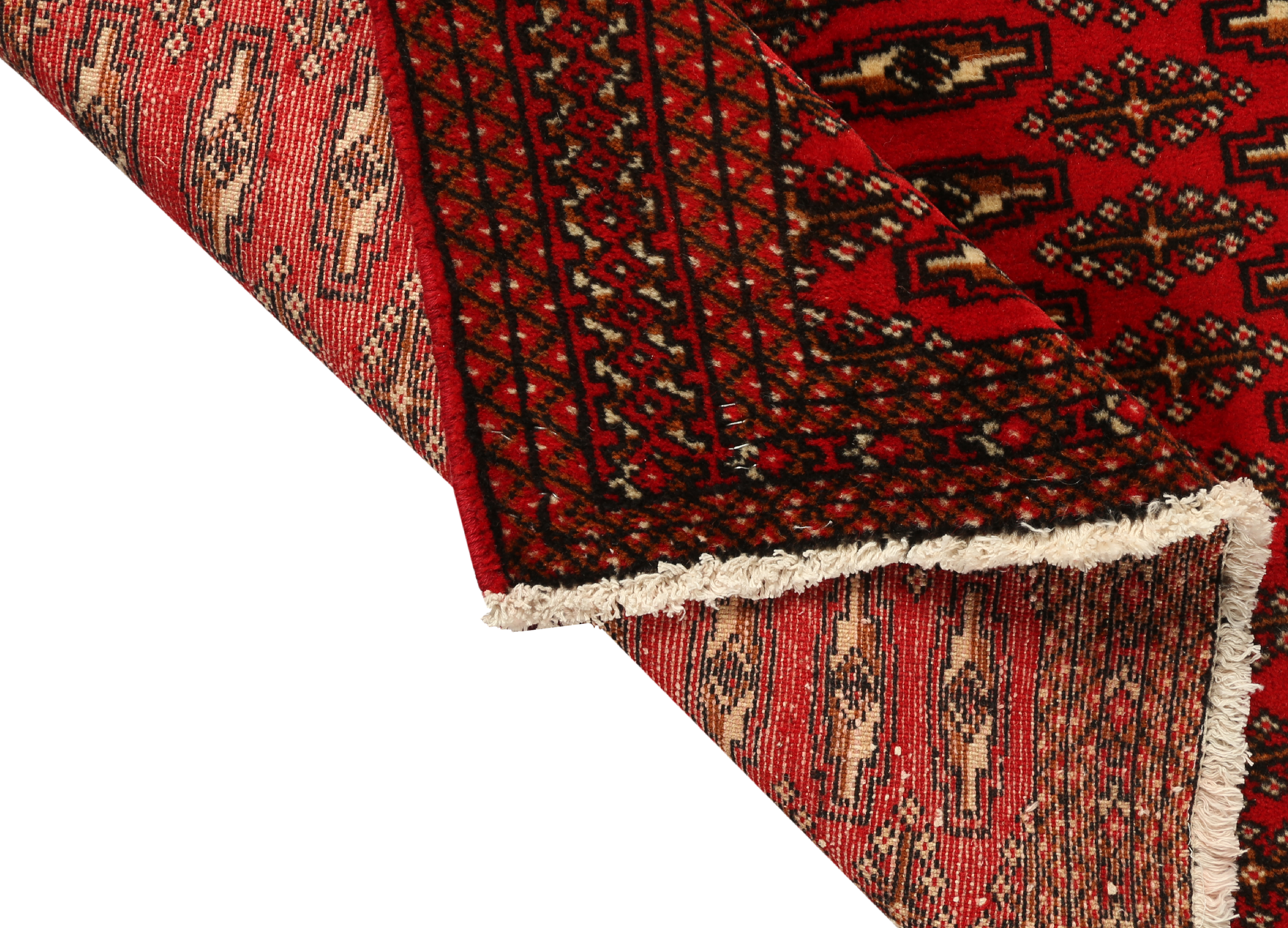 The construction of Turkmen rugs is unique in the Persian weaving world: woven entirely in wool - pile, warp, and weft - using the Persian asymmetrical knot at high densities on portable horizontal looms, these rugs achieve a silky-smooth pile surface of extraordinary refinement. The all-wool construction gives Turkmen rugs a flexibility and warmth unlike the stiffer cotton-foundation rugs of city and village weaving centers, with a pile that seems almost liquid in its smoothness.