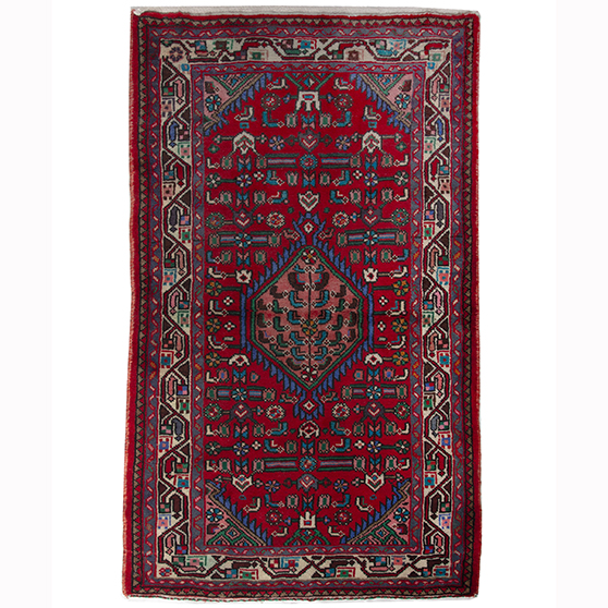 This hand-knotted Semi Antique Hamadan rug from Hamadan - 4x2 ft - presents a compelling Herati composition woven in Red, Blue, a living record of one of Persia's great regional weaving traditions. Village weavers across the