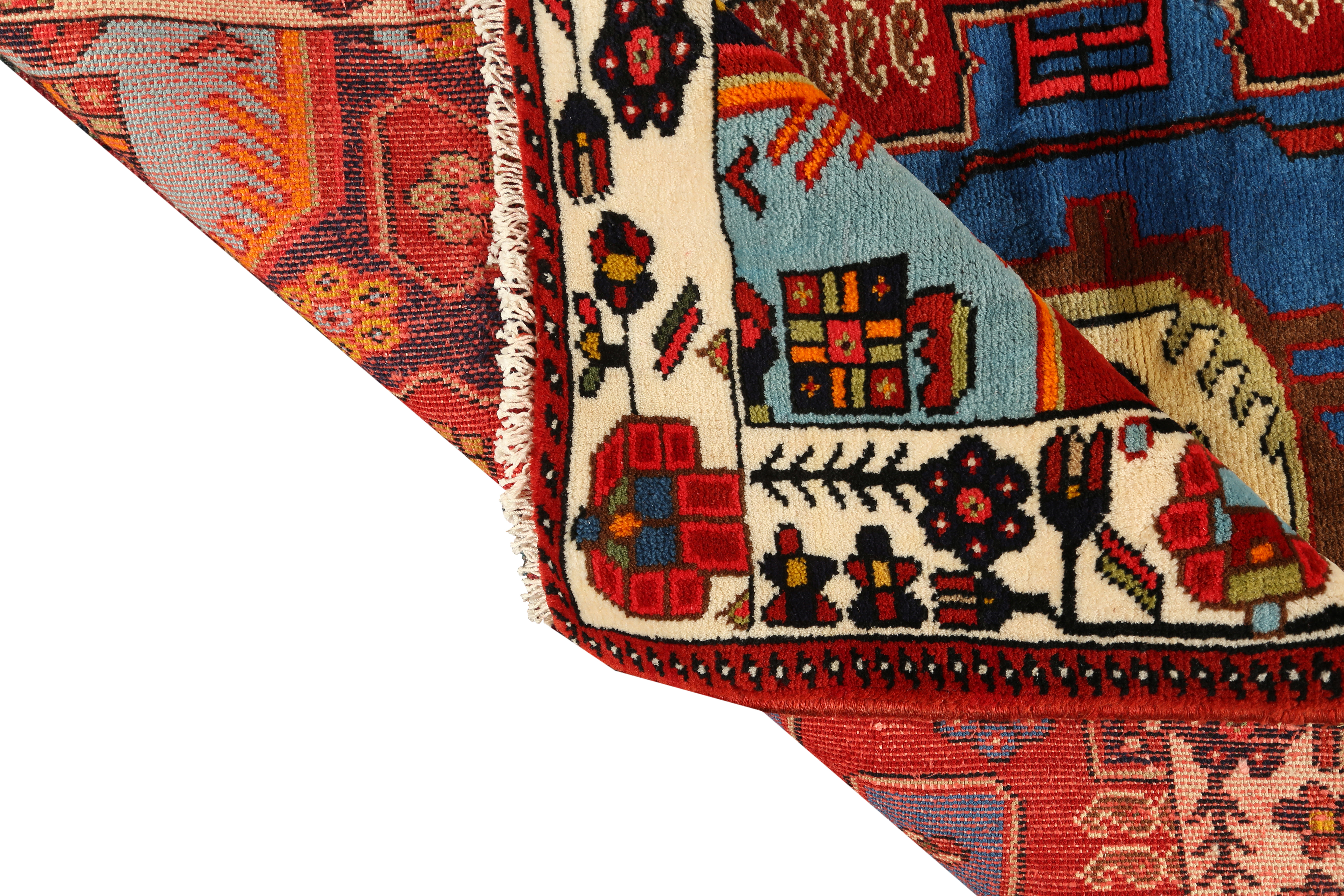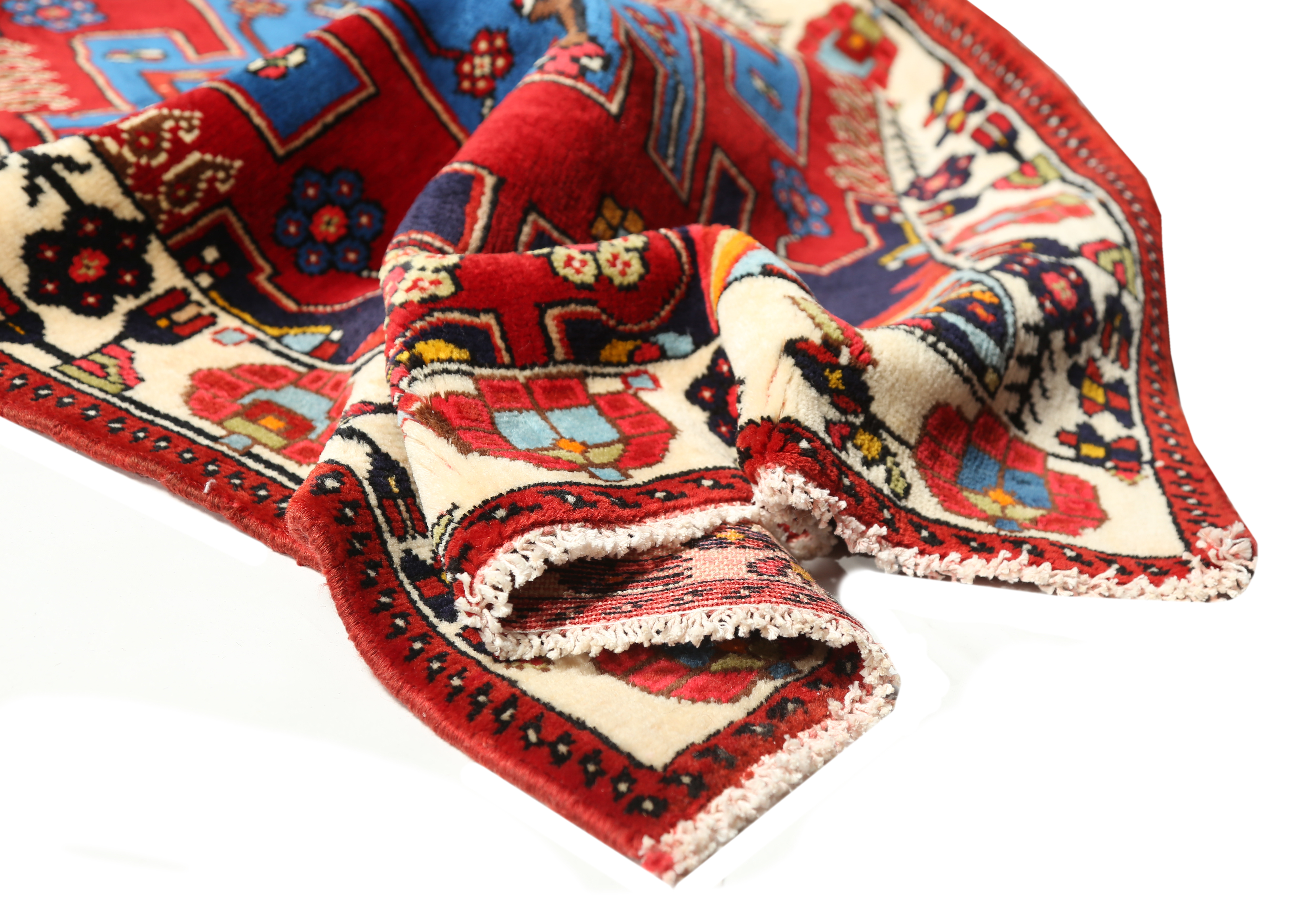 Madder red, the dominant color, symbolizes passion and vitality in Persian culture, while the complementary blues represent wisdom and tranquility. The cream tones provide luminous balance, creating a triadic harmony that has captivated collectors for generations. Los Angeles Home of Rugs presents this exceptional piece as a testament to the enduring appeal of authentic Persian craftsmanship.