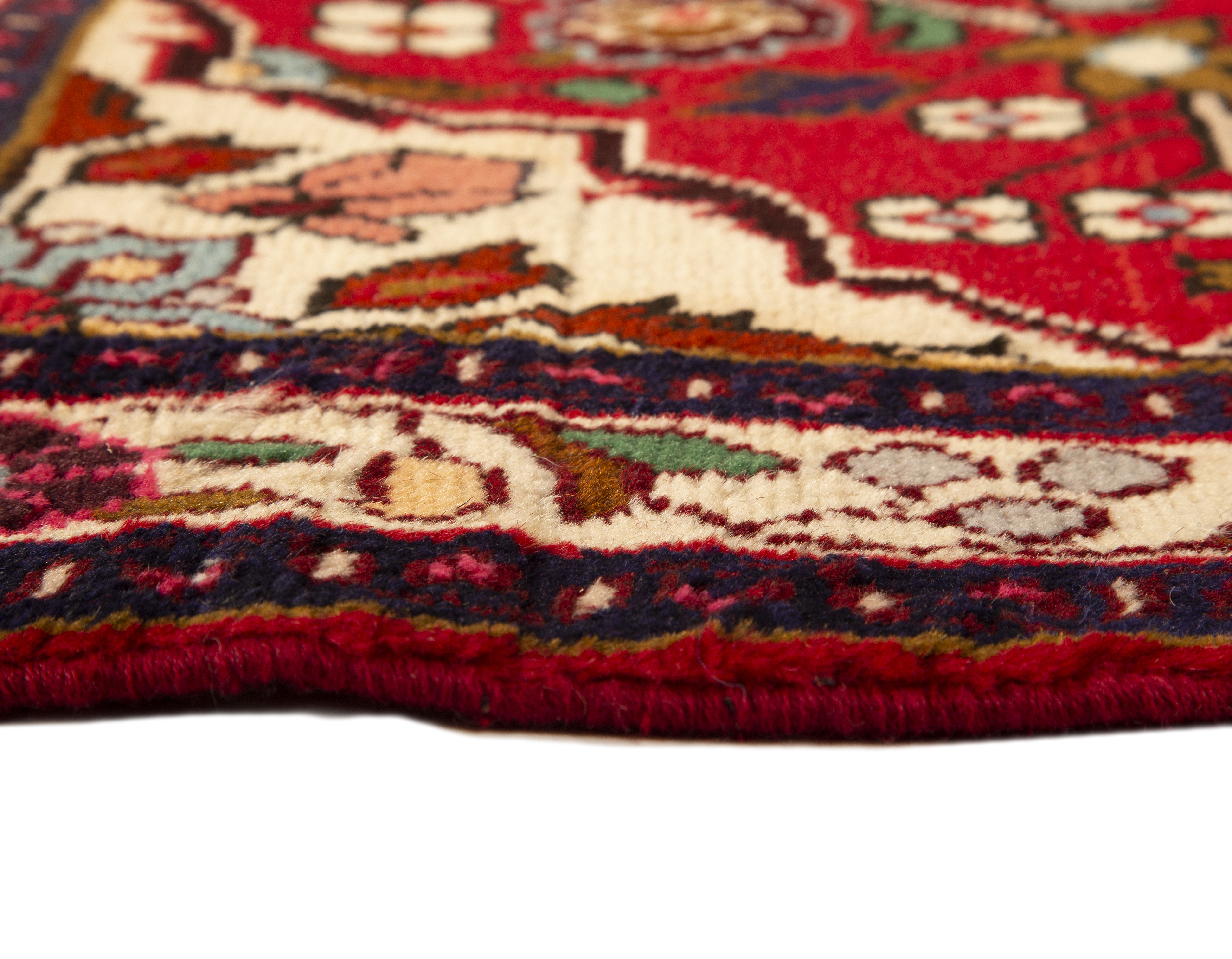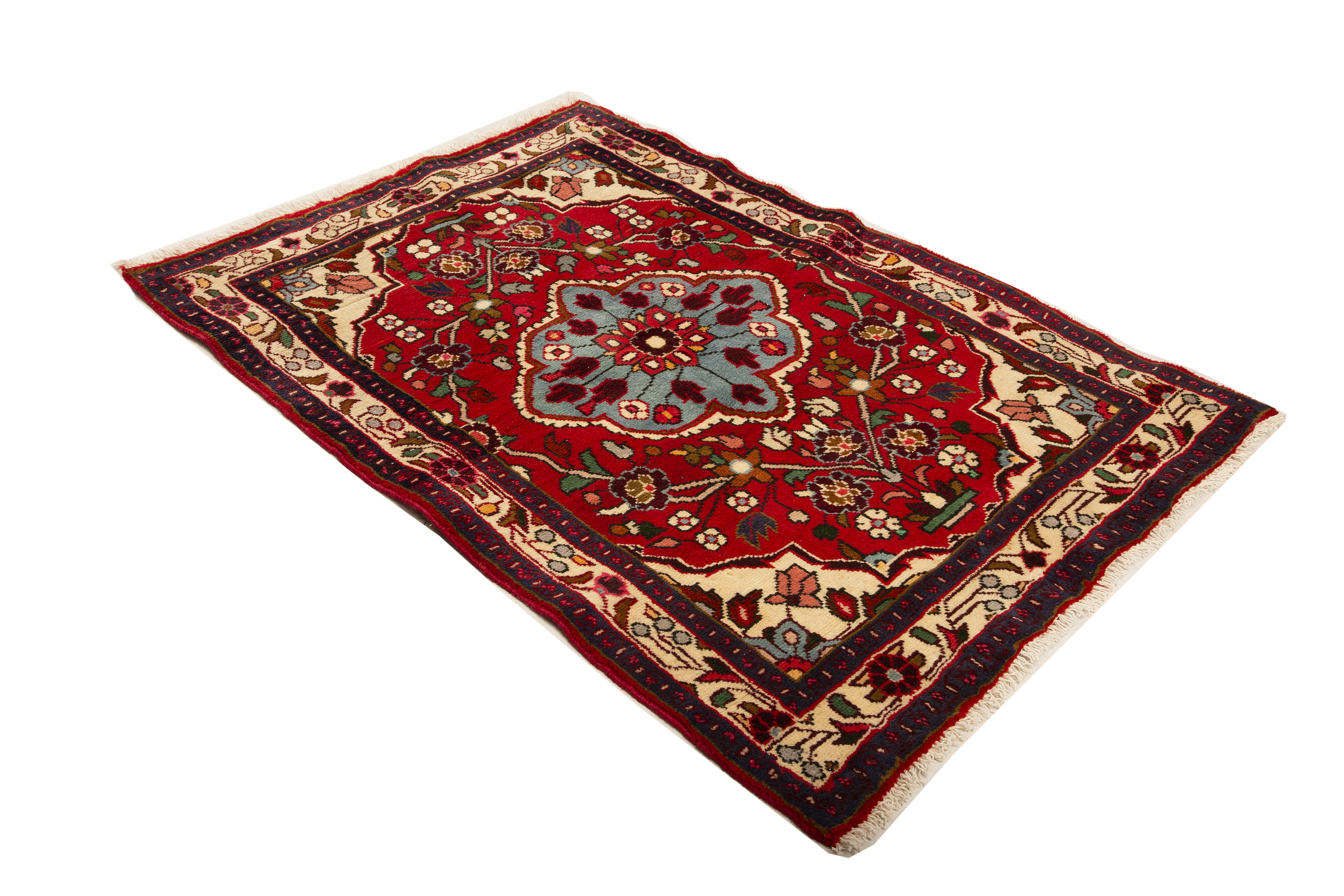 This exquisite semi-antique Hamadan Persian rug measuring 4'5" x 3'1" presents the timeless elegance of the Shah Abbasi medallion design in a perfect compact size for intimate spaces. The rich madder red field creates a striking foundation that beautifully contrasts with cream, navy blue, and sage green accents, while rust red, ivory, dark red, and ochre tones add depth and warmth to this exceptional piece.