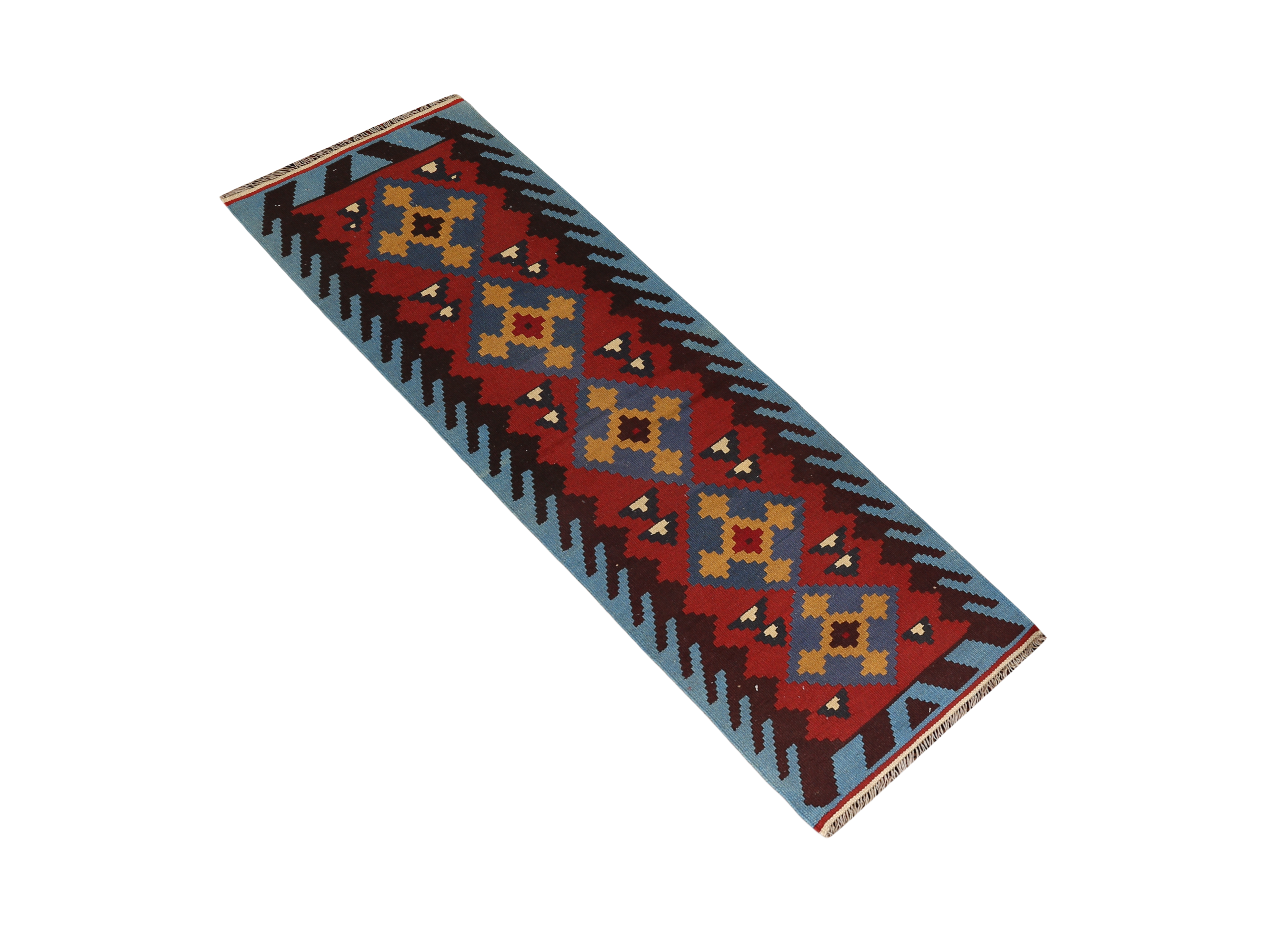 This remarkable semi antique Shiraz Persian rug at 6'11" x 1'12" showcases the bold geometric artistry that has defined the Fars province for centuries. The vibrant madder red field provides a striking canvas for intricate tribal motifs rendered in deep navy blue, warm ochre, crisp black, and cream accents. This narrow format makes it an exceptional choice for hallways, entryways, or as a distinctive accent piece that commands attention without overwhelming smaller spaces.
