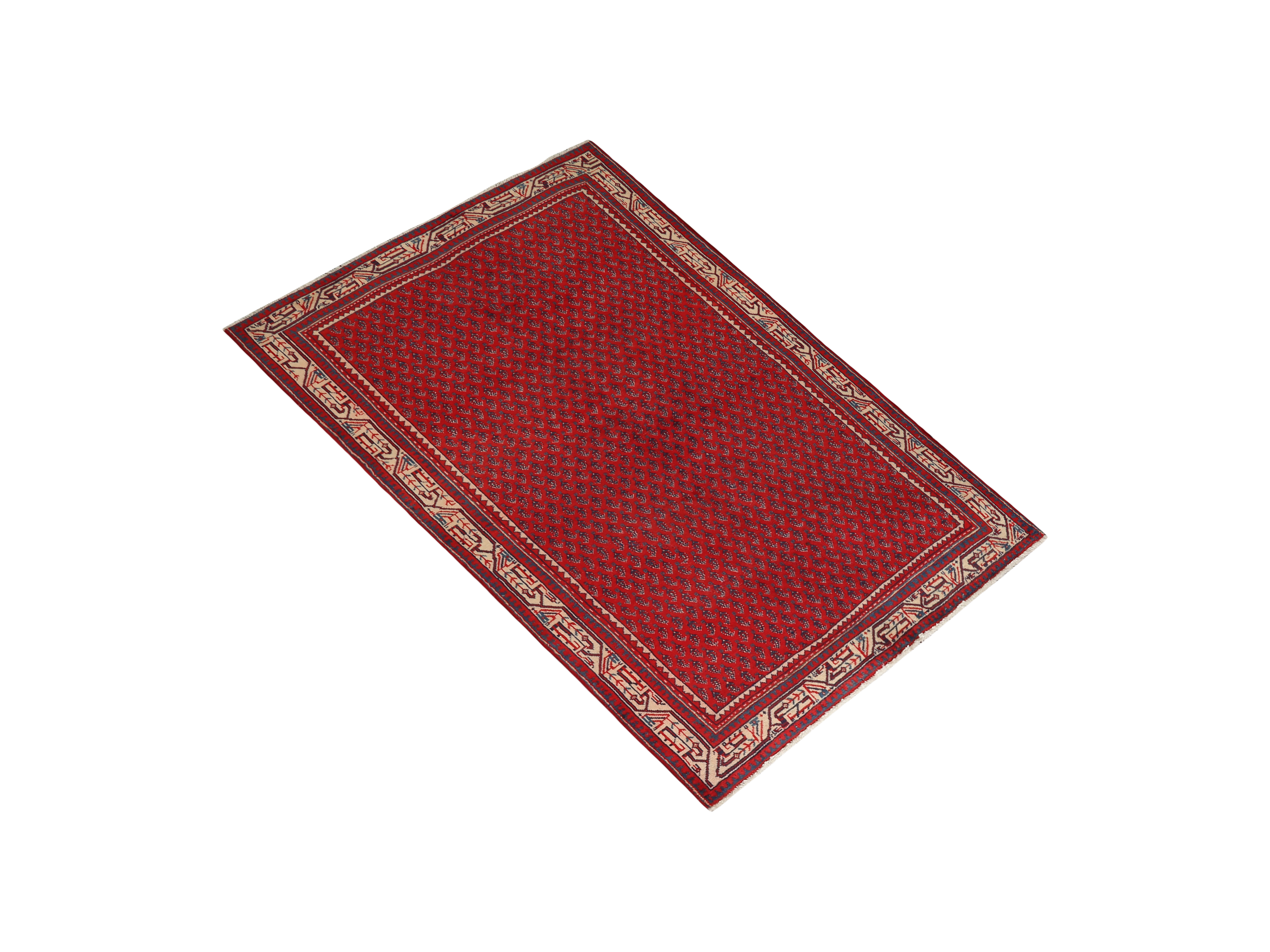 This exquisite 6'11" x 4'1" semi antique Boteh Persian rug showcases the timeless elegance of the Herati pattern, also known as the Mahi design, woven in a captivating palette of madder red, navy blue, cream, burgundy, and ivory. Dating from 40-60 years ago, this exceptional piece demonstrates the masterful artistry of Persian weavers from the renowned Arak region, where centuries of textile tradition have produced some of the world's most sought-after decorative carpets.