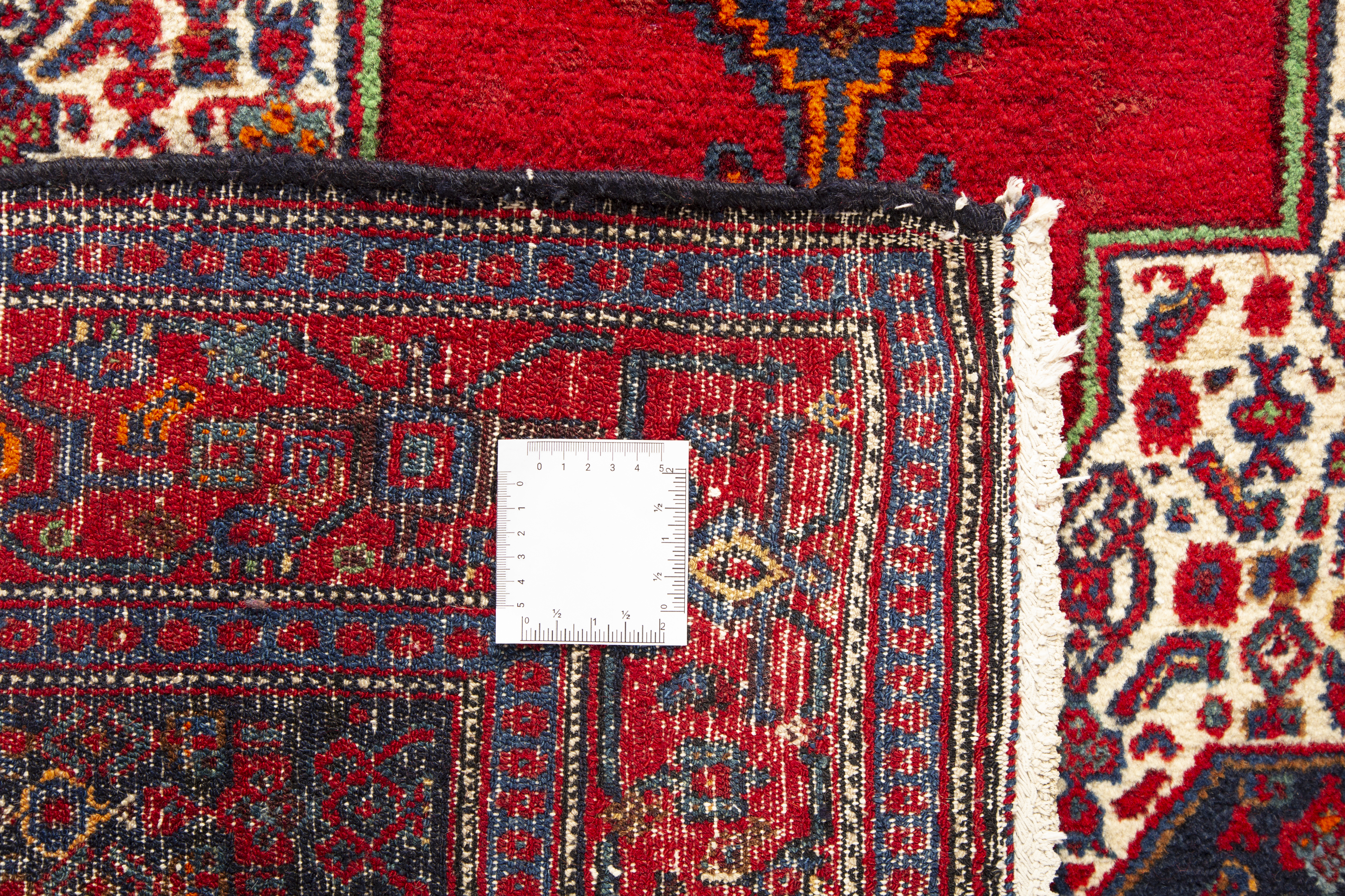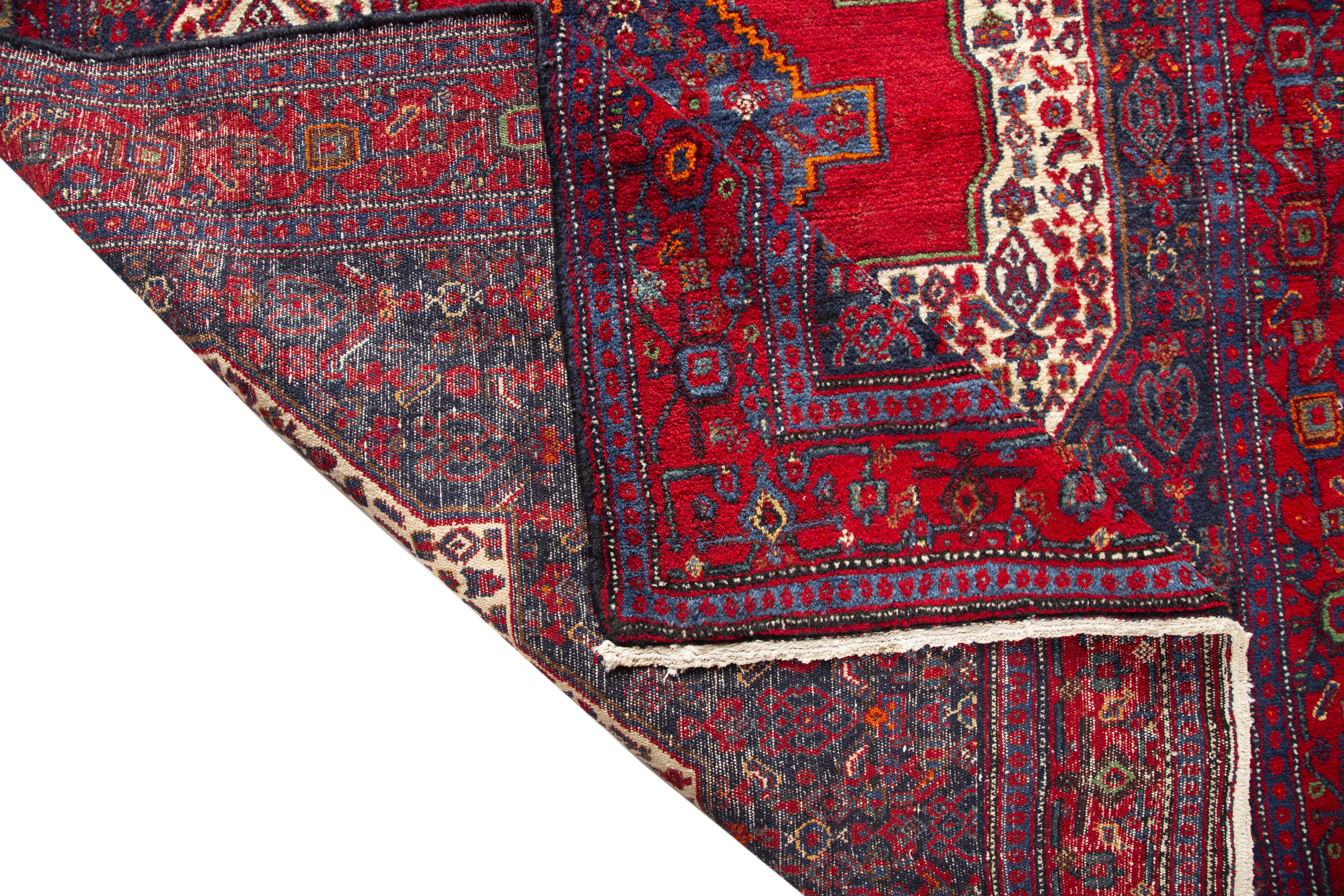 This exquisite semi antique Senneh Persian rug, measuring 6'3" x 4'2", showcases the refined artistry of Kurdistan's master weavers through its stunning medallion design rendered in rich crimson, navy blue, and ivory tones. The sophisticated color palette, enhanced by touches of gold, forest green, burgundy, royal blue, and ochre, creates a harmonious composition that speaks to the weaver's exceptional skill in balancing traditional Persian aesthetics with timeless elegance.
