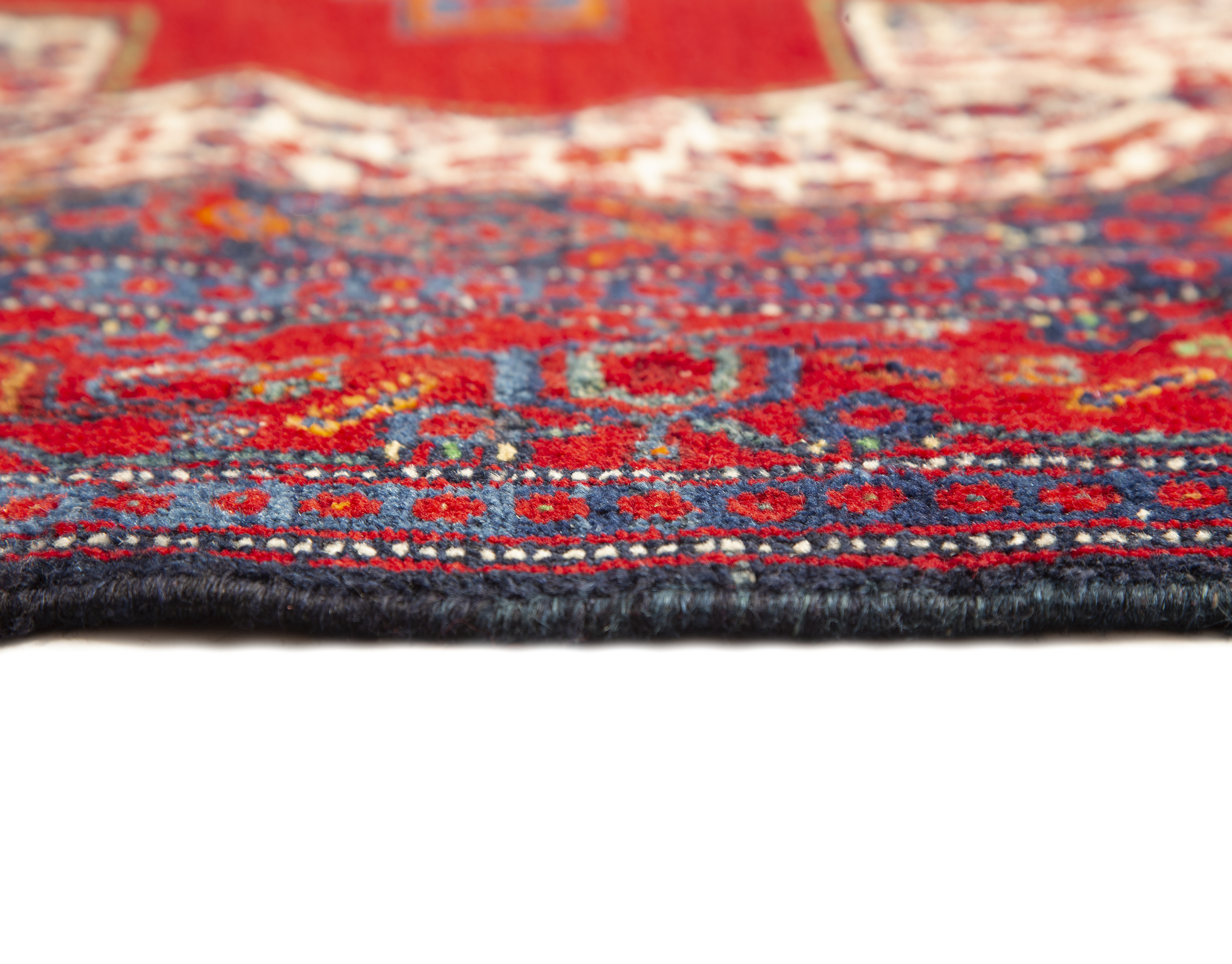 pile rugs is remarkable by any standard. Weavers work with extremely fine yarns, tying individual Persian asymmetrical knots at very high densities to produce a smooth, compact pile surface of great detail and visual clarity.