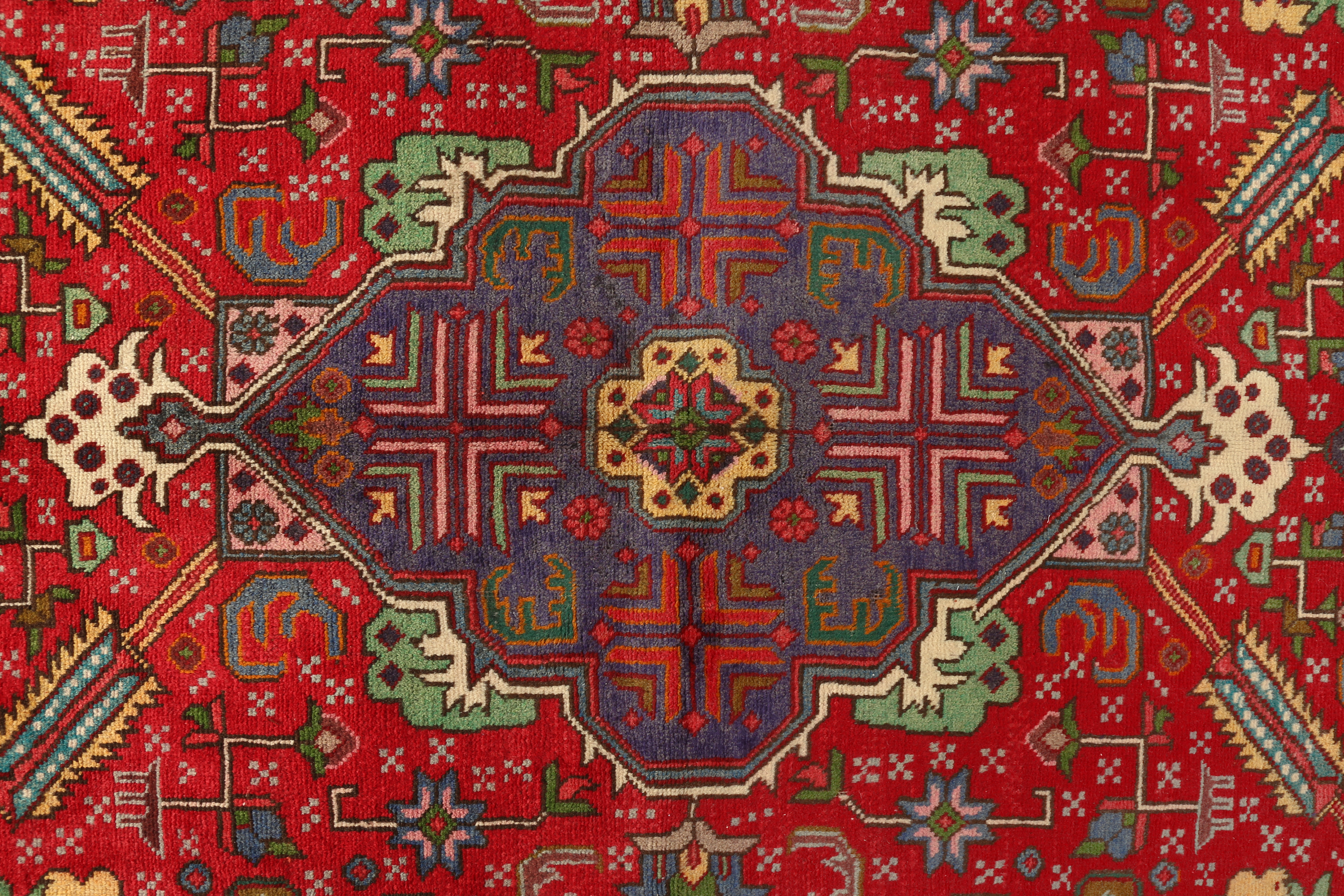 This Semi Antique Tabriz rug, measuring 6x4 ft, presents a distinguished Medallion composition in Red, Cream - hallmark characteristics of the Azerbaijan weaving tradition at its finest. Tabriz weavers command an extraordinary range of compositional approaches: grand medallion compositions with intricate arabesque fields dense with Shah Abbasi palmettes and cloud bands; detailed hunting scenes animated with galloping horsemen and magnificent birds of prey; paradise garden patterns organizing the field into an architectural vision of the enclosed Persian garden; and elaborate vase carpet designs of breathtaking complexity. No other weaving center in the world approaches this breadth of design mastery.