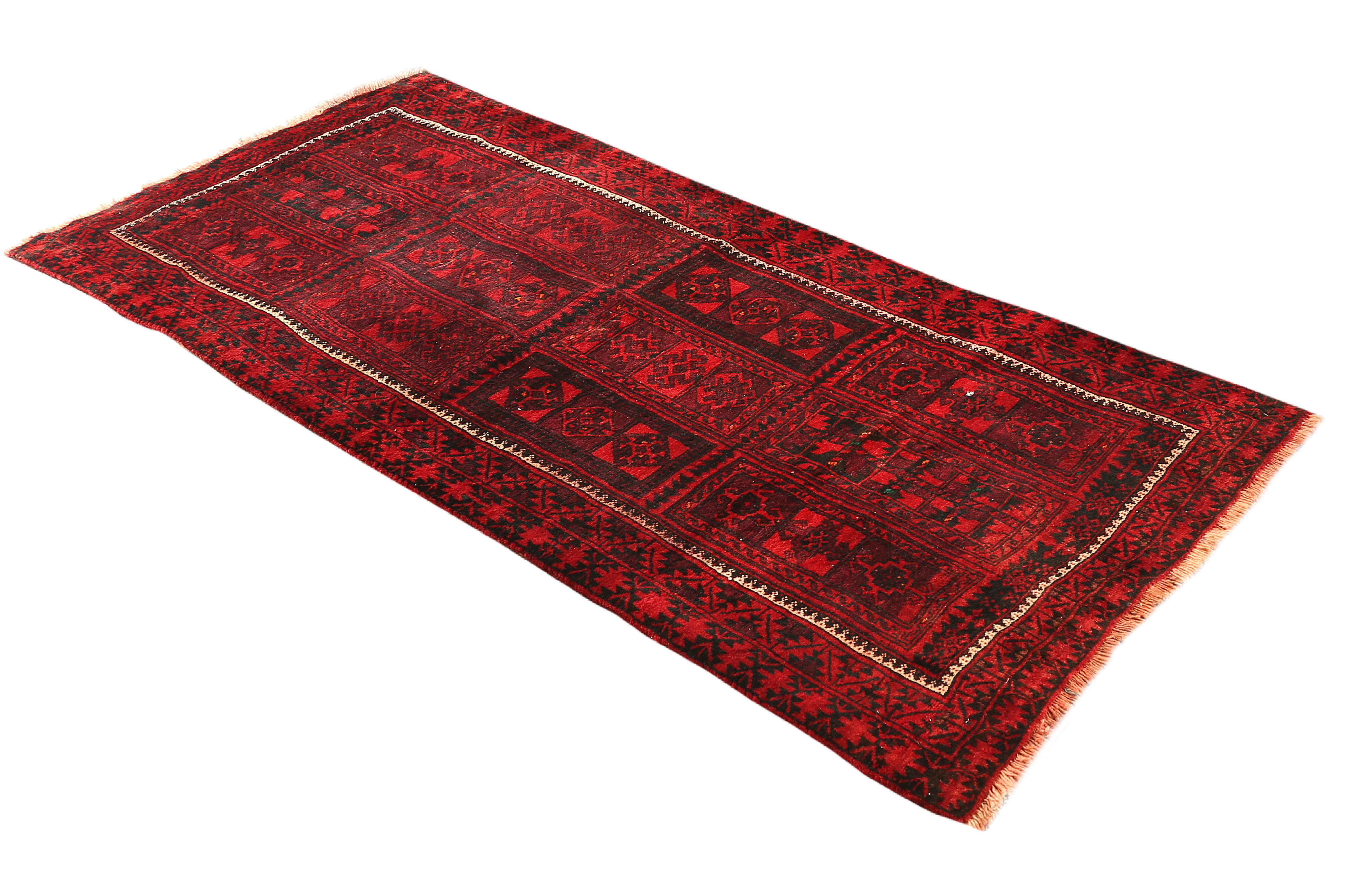 The sophisticated color palette of this Baluch masterpiece demonstrates the weavers' mastery of natural dye techniques, where deep red madder root creates the dominant field color, complemented by rich black from iron-based dyes and soft cream from natural wool tones. The burgundy and ivory highlights add layers of complexity that shift beautifully in changing light, creating a dynamic visual experience that rewards close examination. This one-of-a-kind hand-knotted rug elevates any space with its authentic Persian heritage and timeless appeal.
