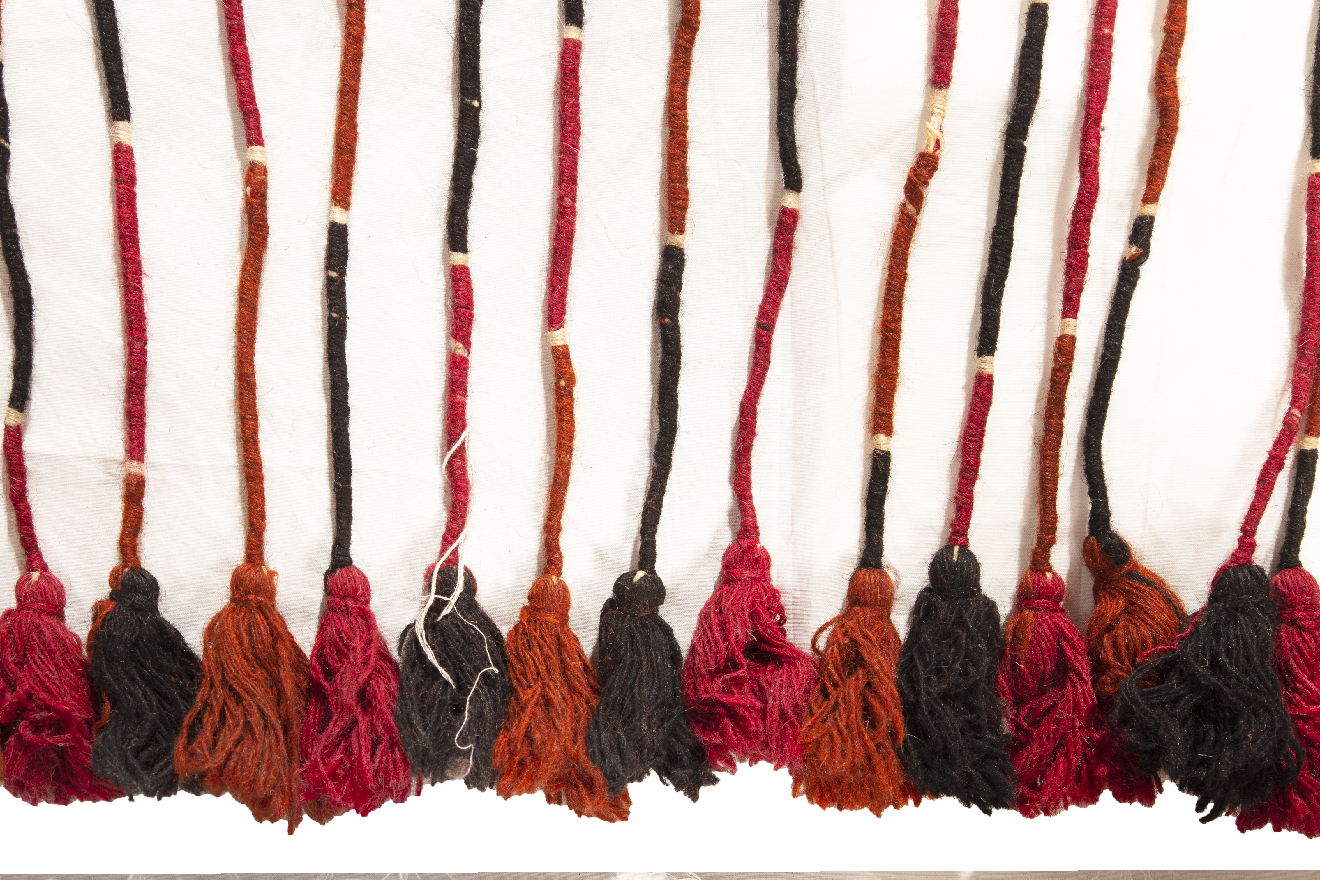 developed over centuries - covers the majority of the field, contrasted with near-black secondary elements, dark blue accents, and the warm ivory of undyed wool. This palette reflects not commercial calculation but genuine