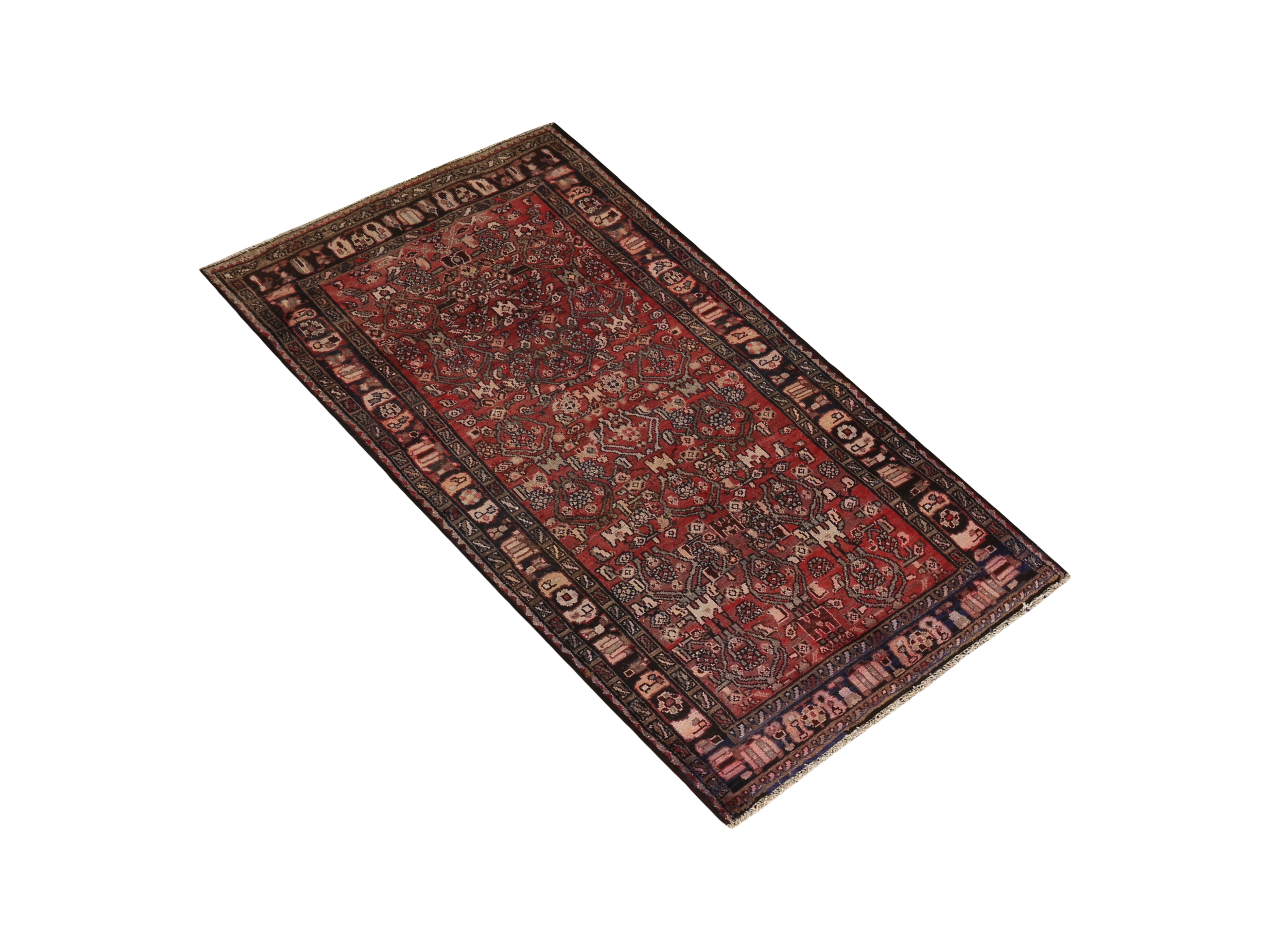 This exquisite semi antique Hamadan Persian rug measuring 6'7" x 3'8" presents a masterful display of the beloved Herati (Mahi) pattern interwoven with the classic Afshan all-over design. The rich madder red field creates a warm foundation that flows seamlessly with accents of dark red, navy blue, cream, beige, brown, and black, creating a sophisticated color palette that speaks to decades of Persian artisanship. Dating back 40-60 years, this wool treasure carries the authentic patina and character that only time can bestow upon a genuine hand-knotted masterpiece.