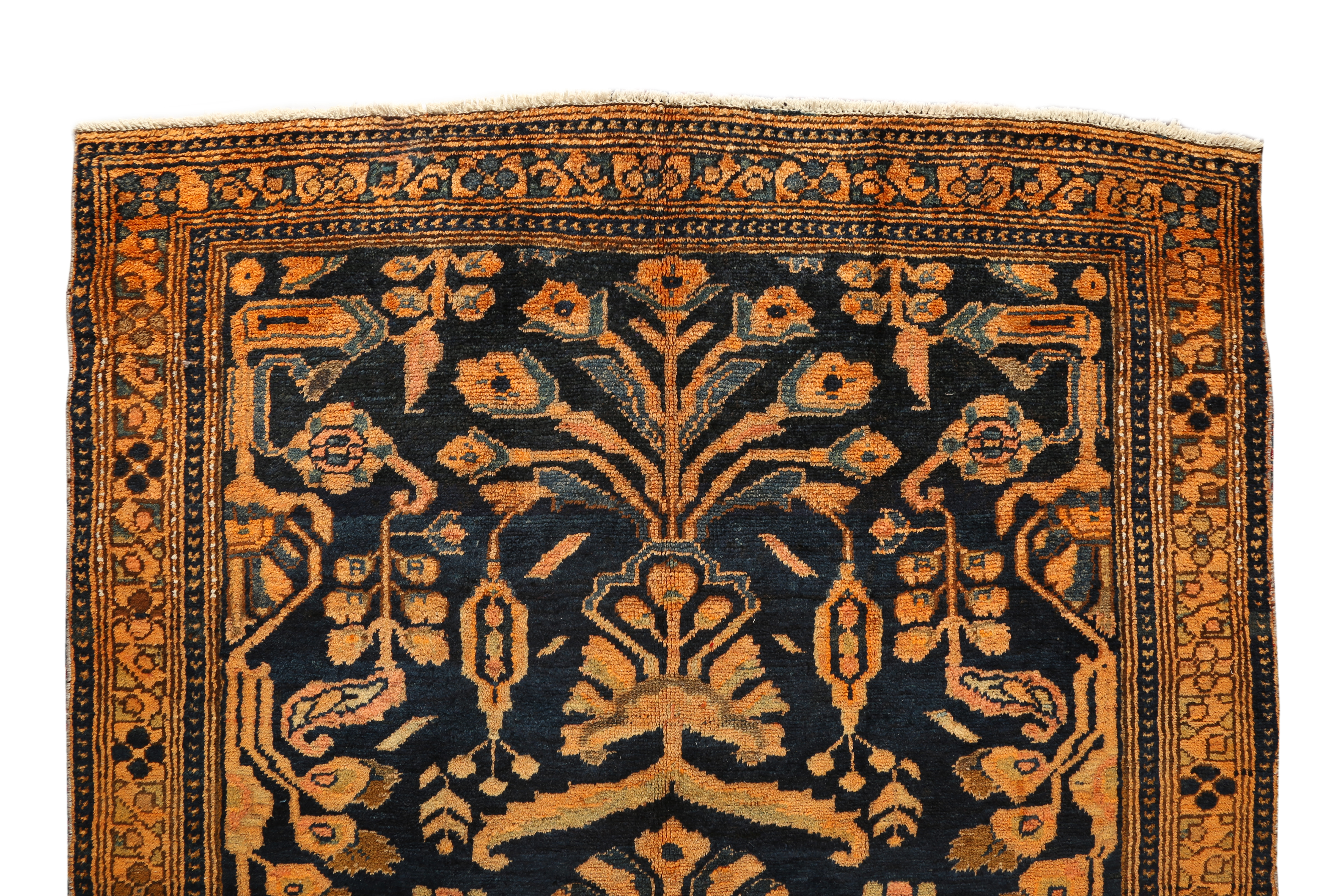chromatic vocabulary. Natural dyes sourced from local plants and minerals create colors of genuine luminous depth that age gracefully, developing the warm complex patina that distinguishes authentically aged Persian rugs.