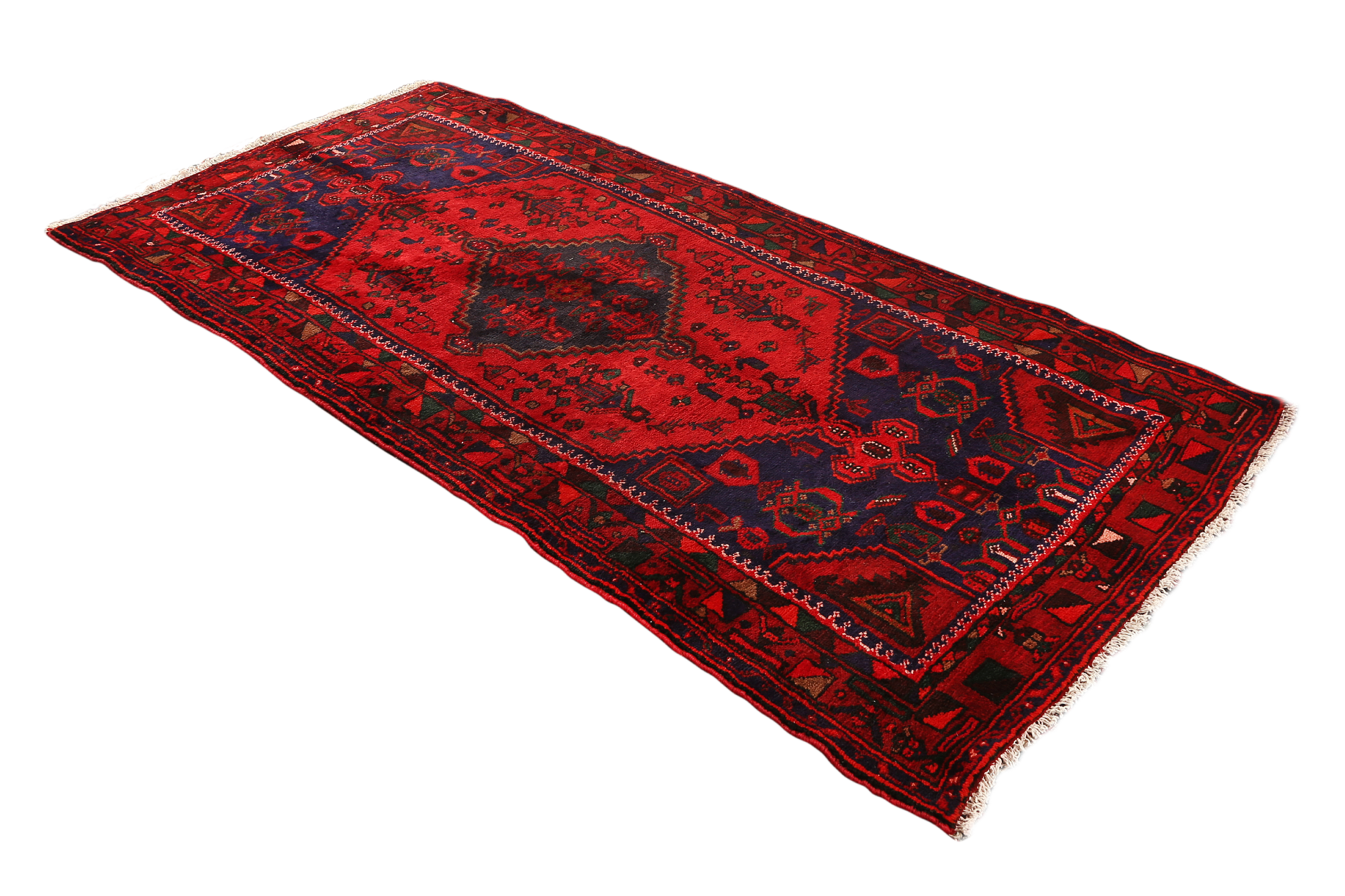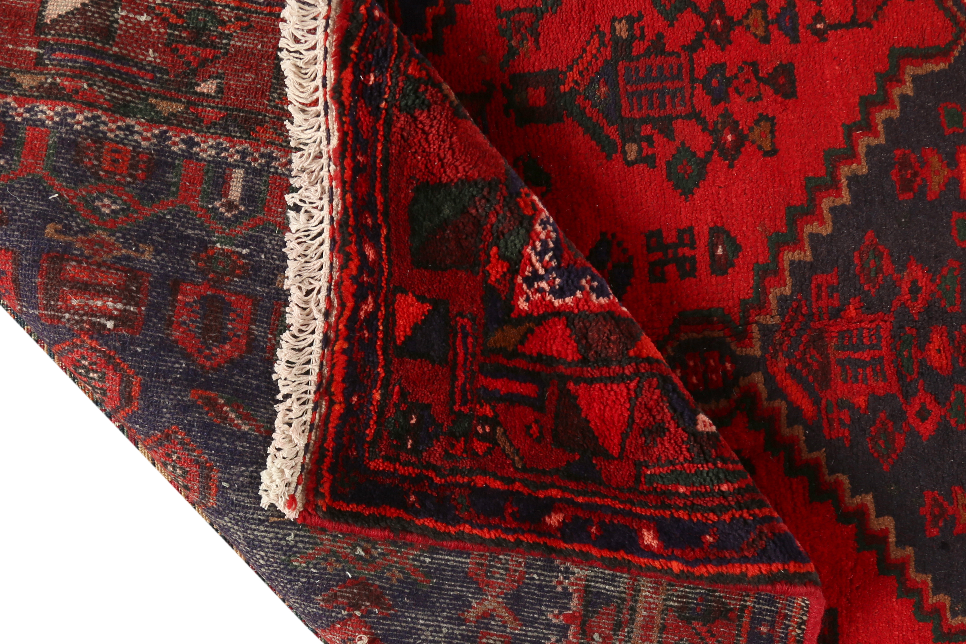 This exceptional semi antique Zanjan Persian rug at 7'1" x 3'5" presents a striking medallion design that embodies four decades of natural aging and character development. The rich crimson field provides a dramatic backdrop for the intricate navy blue central medallion, while accents of dark red, madder red, black, and burgundy create depth and visual complexity throughout the geometric patterns. The symmetrical Ghiordes knotting technique employed by master weavers ensures exceptional durability, making this a treasured addition to any discerning collection.