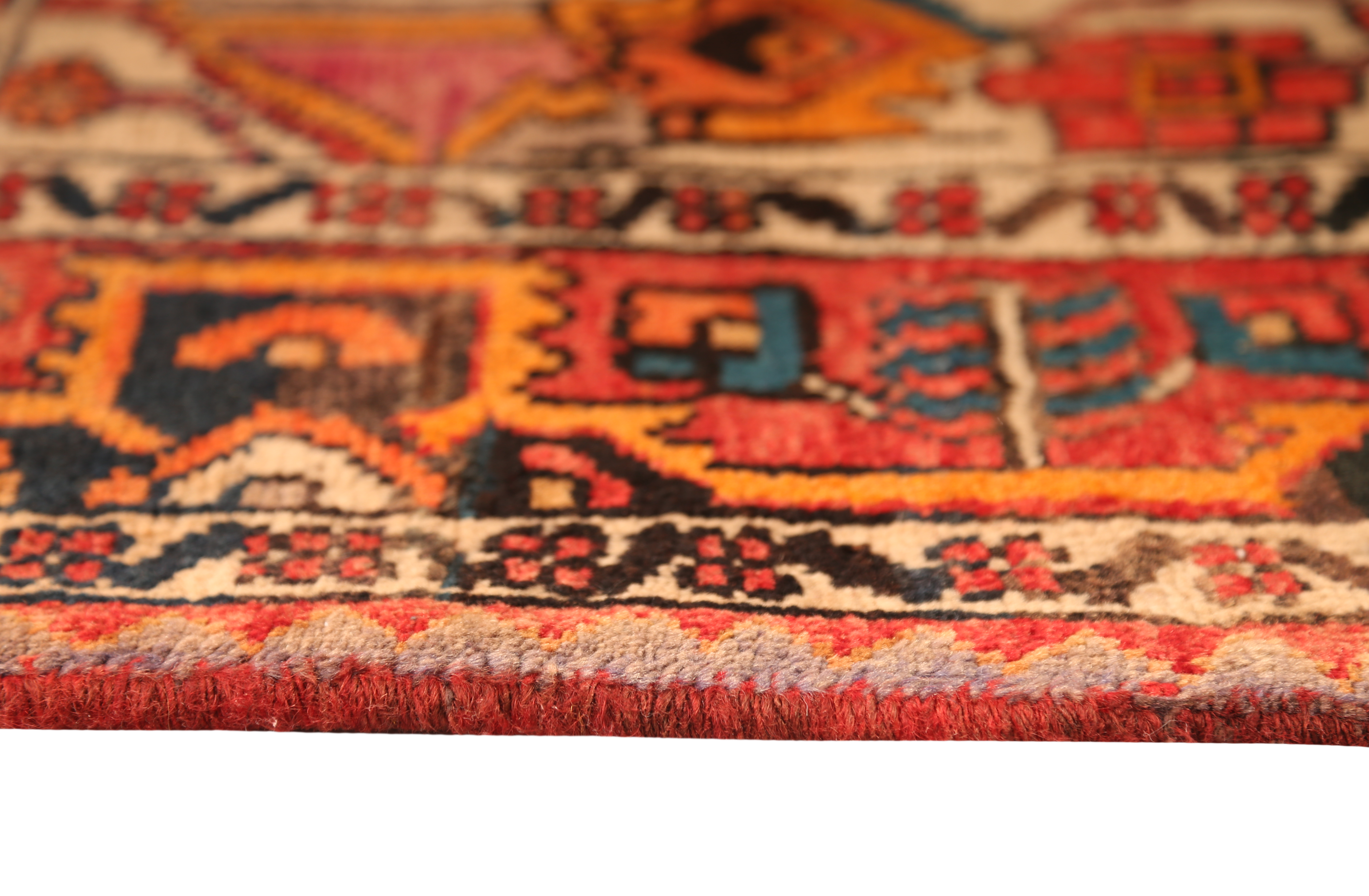 This magnificent semi-antique Bakhtiari Persian rug, measuring 7'1" x 5'5", presents a stunning medallion (toranj) centerpiece surrounded by intricate geometric borders that exemplify the masterful artistry of Persian tribal weavers. The rich palette of madder red and crimson creates a warm foundation, beautifully accented by cream, navy blue, and brown tones that dance throughout the Herati (mahi) motifs, while subtle touches of ivory, dark red, rust red, blue, ochre, and black add remarkable depth and sophistication to this exceptional piece.
