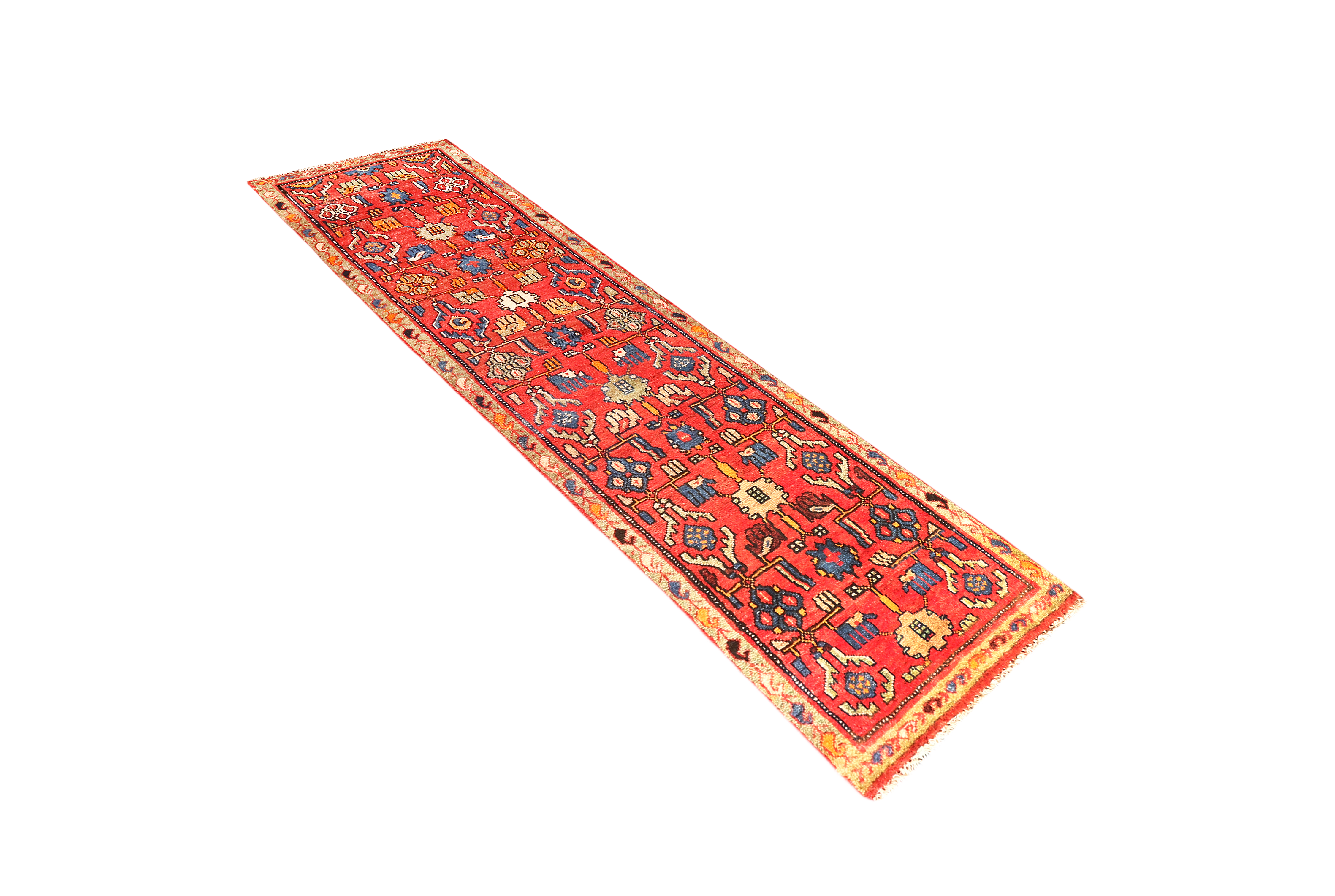 This magnificent semi antique Hamadan Persian rug, measuring 7'3" x 1'12", showcases the timeless artistry of Persian weavers through its intricate Herati (Mahi) and Afshan all-over patterns rendered in a stunning palette of madder red, navy blue, cream, and antique gold. The elongated proportions of this hand-knotted masterpiece make it an ideal runner for hallways, galley kitchens, or as an elegant accent piece alongside furniture, where its rich heritage can be fully appreciated.