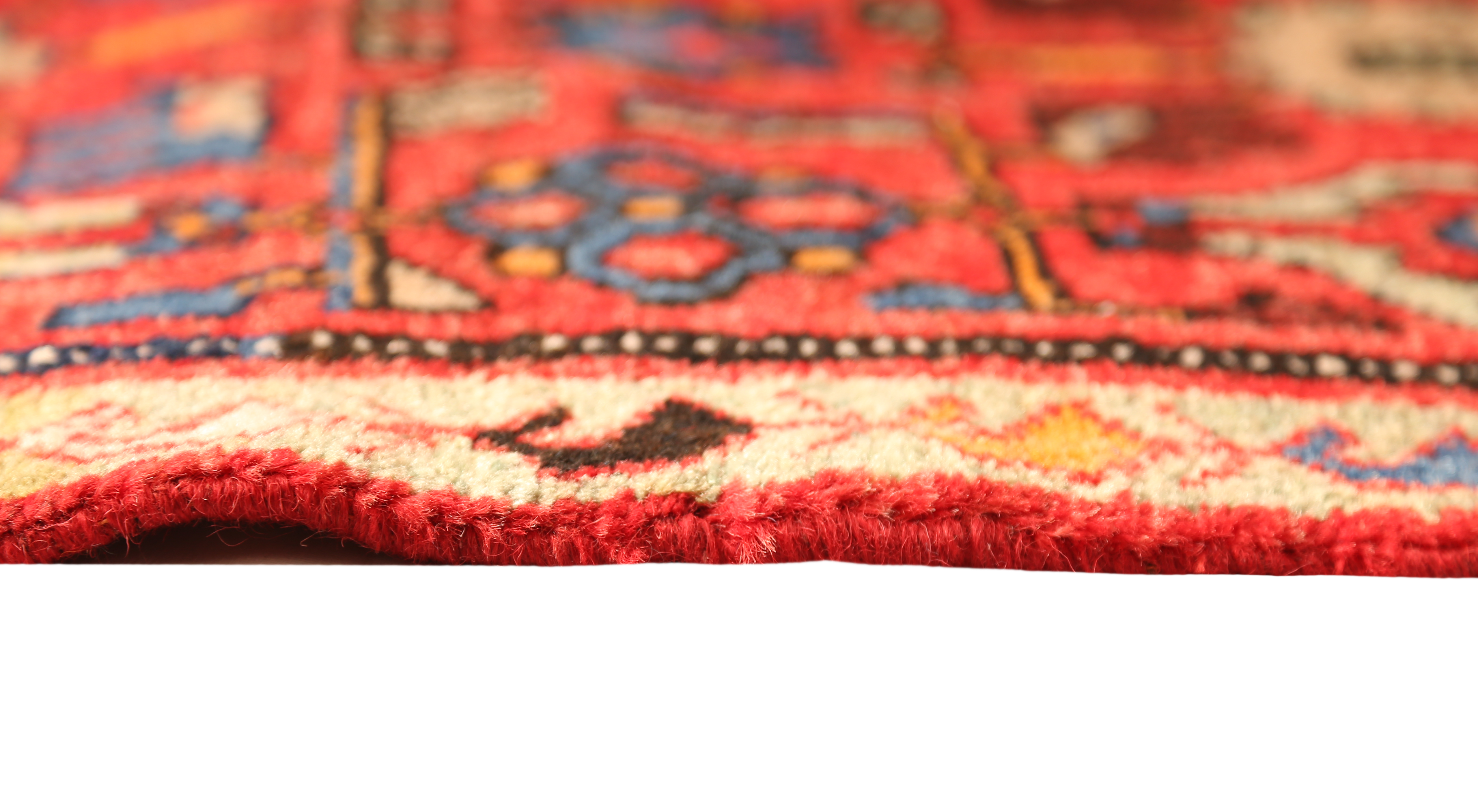 The sophisticated color harmony of rust red, ivory, ochre, and blue creates a warm yet refined atmosphere that complements both traditional and contemporary interiors, while the 40-60 year aging process has mellowed the natural wool to achieve the perfect patina that speaks of genuine antiquity. Los Angeles Home of Rugs is proud to offer this exceptional piece that represents not just a floor covering, but a tangible connection to the rich cultural heritage of Persian craftsmanship, complete with its original fringed edges that frame this artistic masterpiece with authentic detail.