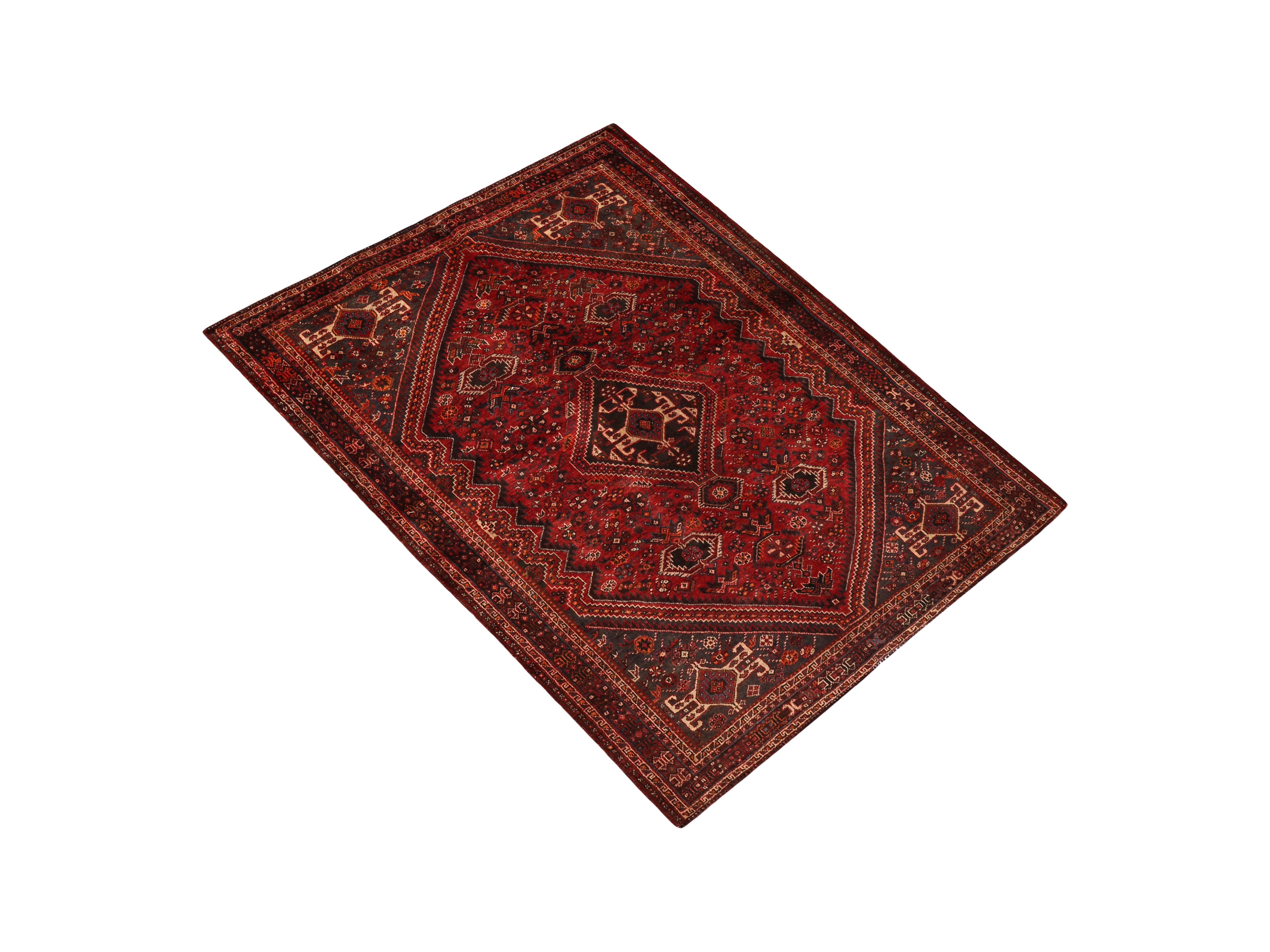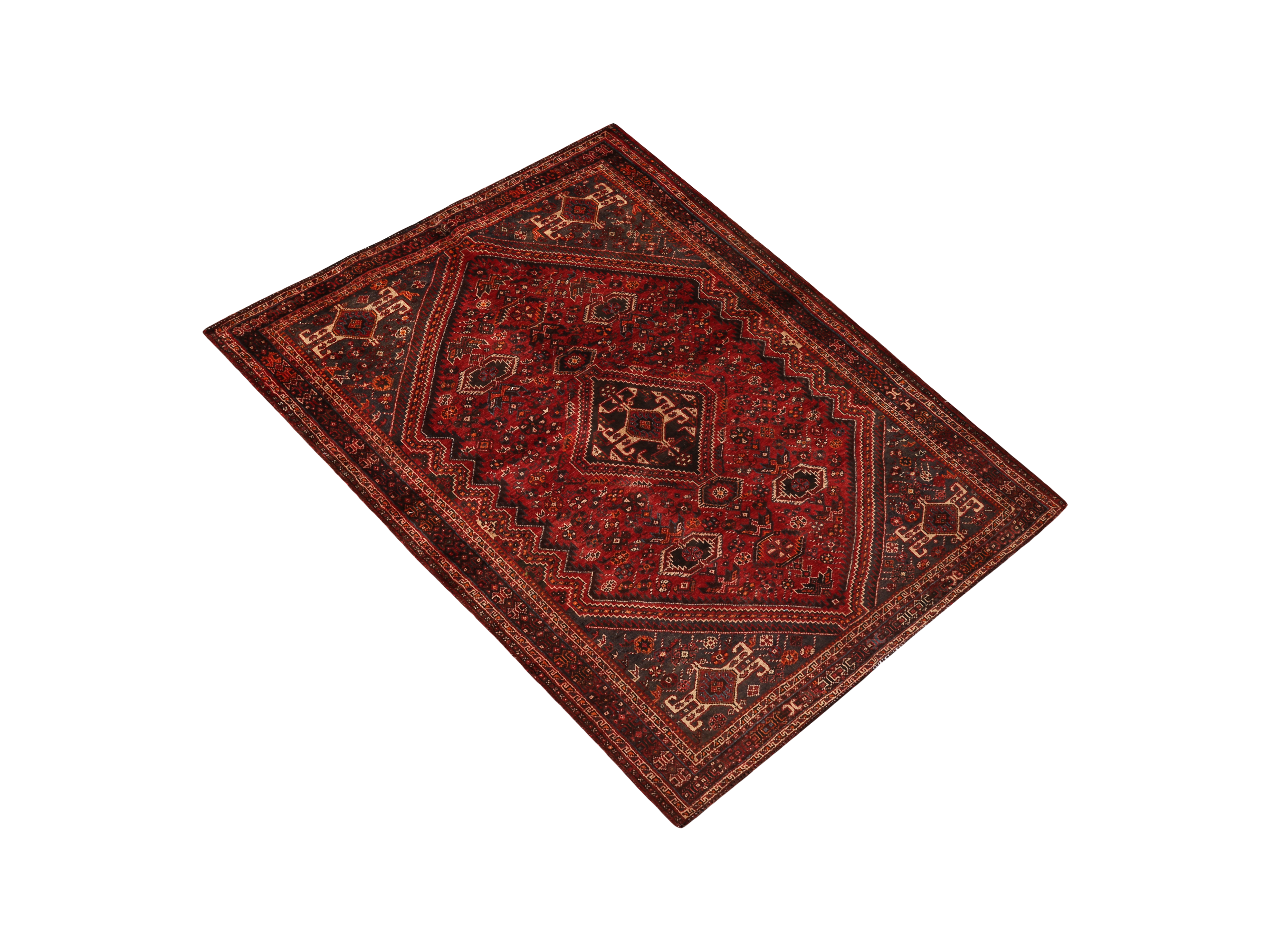 This magnificent 7'5" x 5'2" semi antique Shiraz Persian rug showcases the nomadic artistry of Fars province through its striking medallion toranj centerpiece surrounded by intricate geometric diamond lattice patterns. The rich madder red foundation harmonizes beautifully with deep burgundy and dark red accents, while navy blue, cream, and ivory details create sophisticated contrast against the warm brown undertones that define authentic Shiraz craftsmanship.