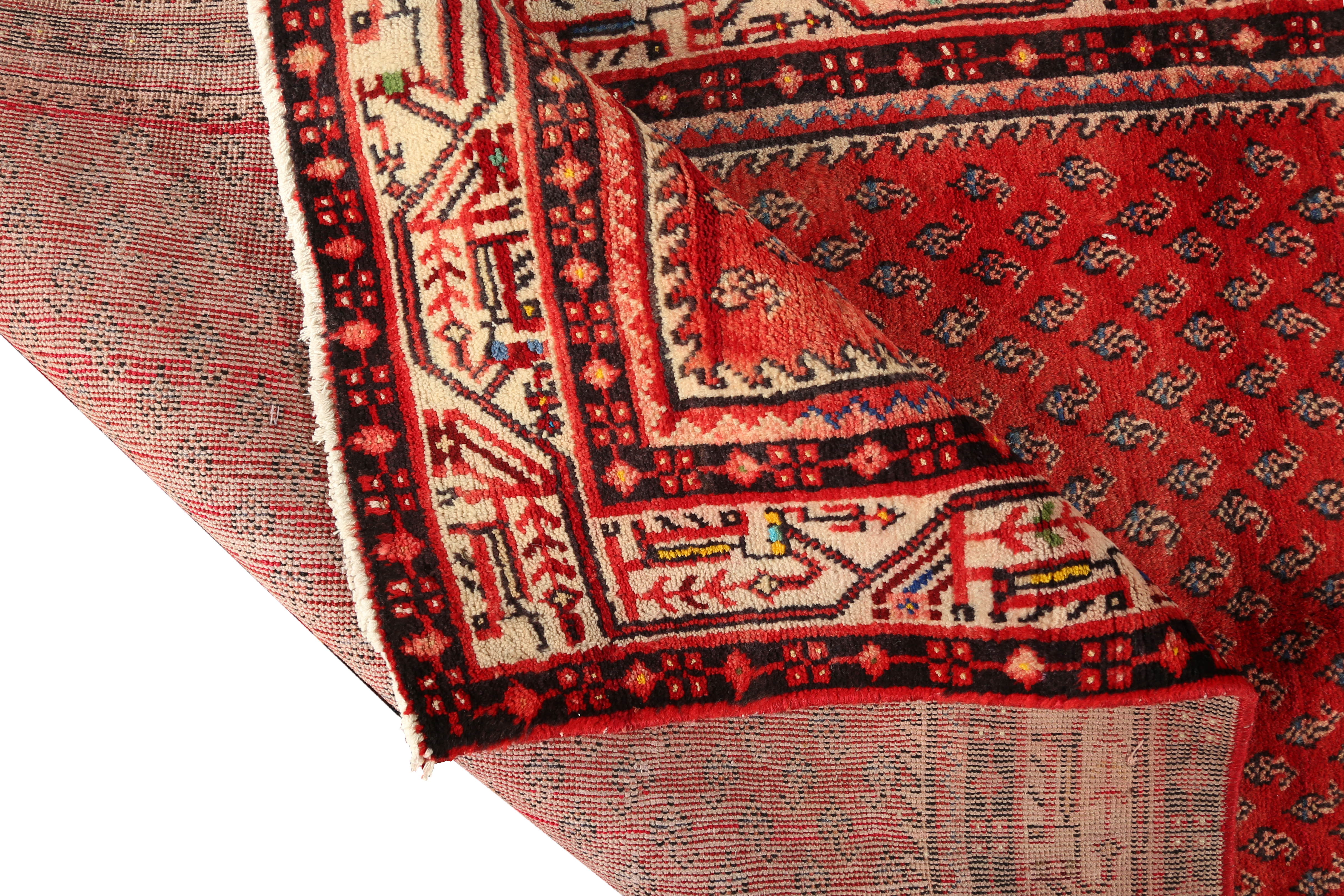This magnificent semi antique Arak Persian rug, measuring 7'9" x 3'6", presents a stunning interpretation of the beloved Herati pattern in a refined red, cream, and navy blue palette. The traditional Mahi motifs dance across the field with remarkable precision, each diamond-shaped medallion filled with intricate fish and rosette designs that speak to four decades of masterful Persian craftsmanship.