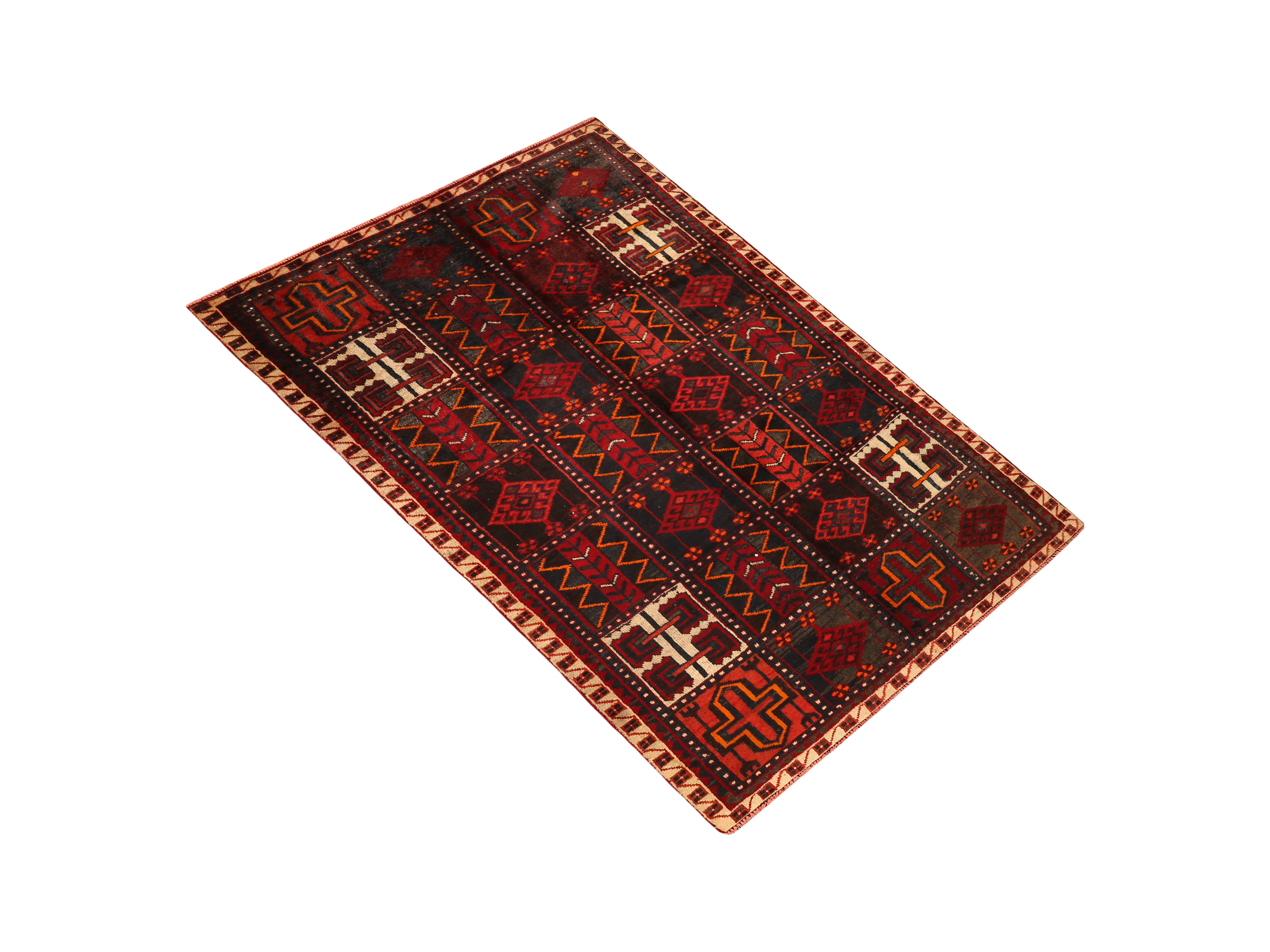 This hand-knotted Semi Antique Lori rug from Lorestan, Chaharmahal and Bakhtiari, Kohgiluyeh and Boyer-Ahmad, Fars, Isfahan, Markazi - 8x4 ft - presents a compelling Geometric composition woven in Red, Brown, a living record of