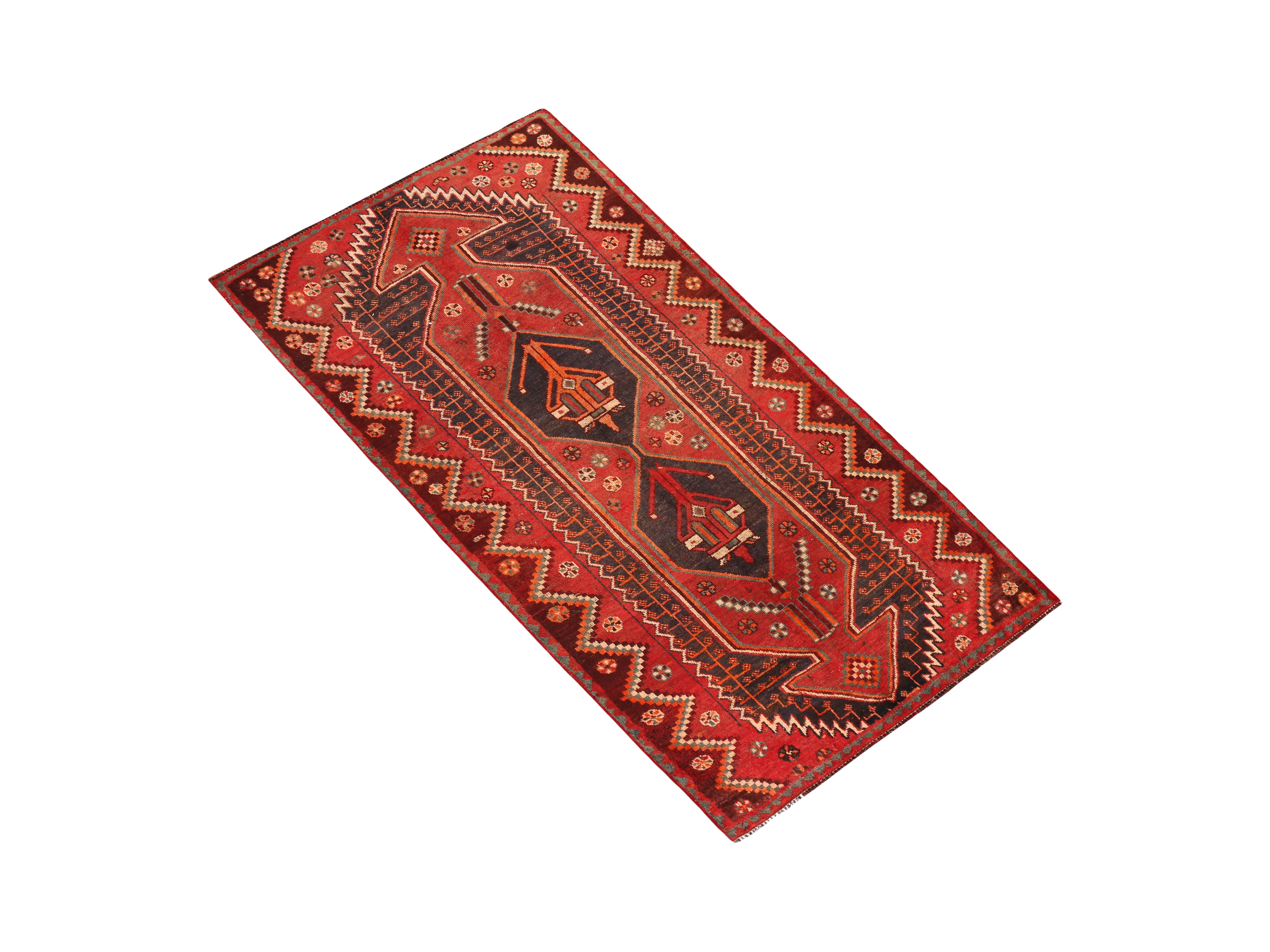 This exceptional semi antique Shiraz Persian rug measuring 8'10" x 4'0" embodies the sacred artistry of Persian prayer rugs through its distinctive mihrab motif rendered in a magnificent palette of red, madder red, and navy blue accented with cream, brown, yellow, and ochre details. Woven between 40 to 60 years ago in the Fars province, this geometric masterpiece represents the profound spiritual traditions of Shiraz weavers who created prayer rugs as bridges between earthly devotion and divine connection.