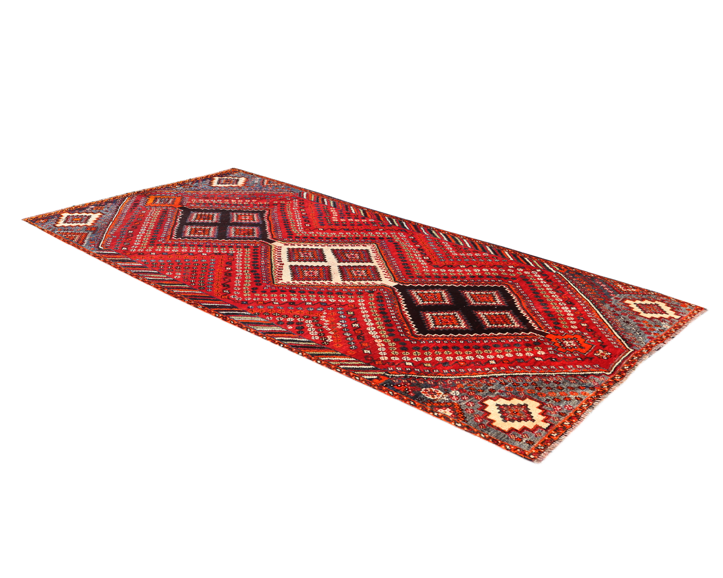 At 8'4" x 3'4", this Shiraz runner perfectly suits hallways, entryways, or as an elegant accent beneath a console table or along a kitchen island. The geometric diamond lattice pattern creates visual movement that draws the eye down the length of the rug, making narrow spaces appear more expansive while adding sophisticated Persian elegance to any interior design scheme. This one-of-a-kind hand-knotted treasure elevates any space with its authentic tribal character and masterful craftsmanship. Los Angeles Home of Rugs takes pride in offering such exceptional pieces that represent the finest traditions of Persian rug weaving, ensuring each collector receives a genuine work of art that will be treasured for generations to come.