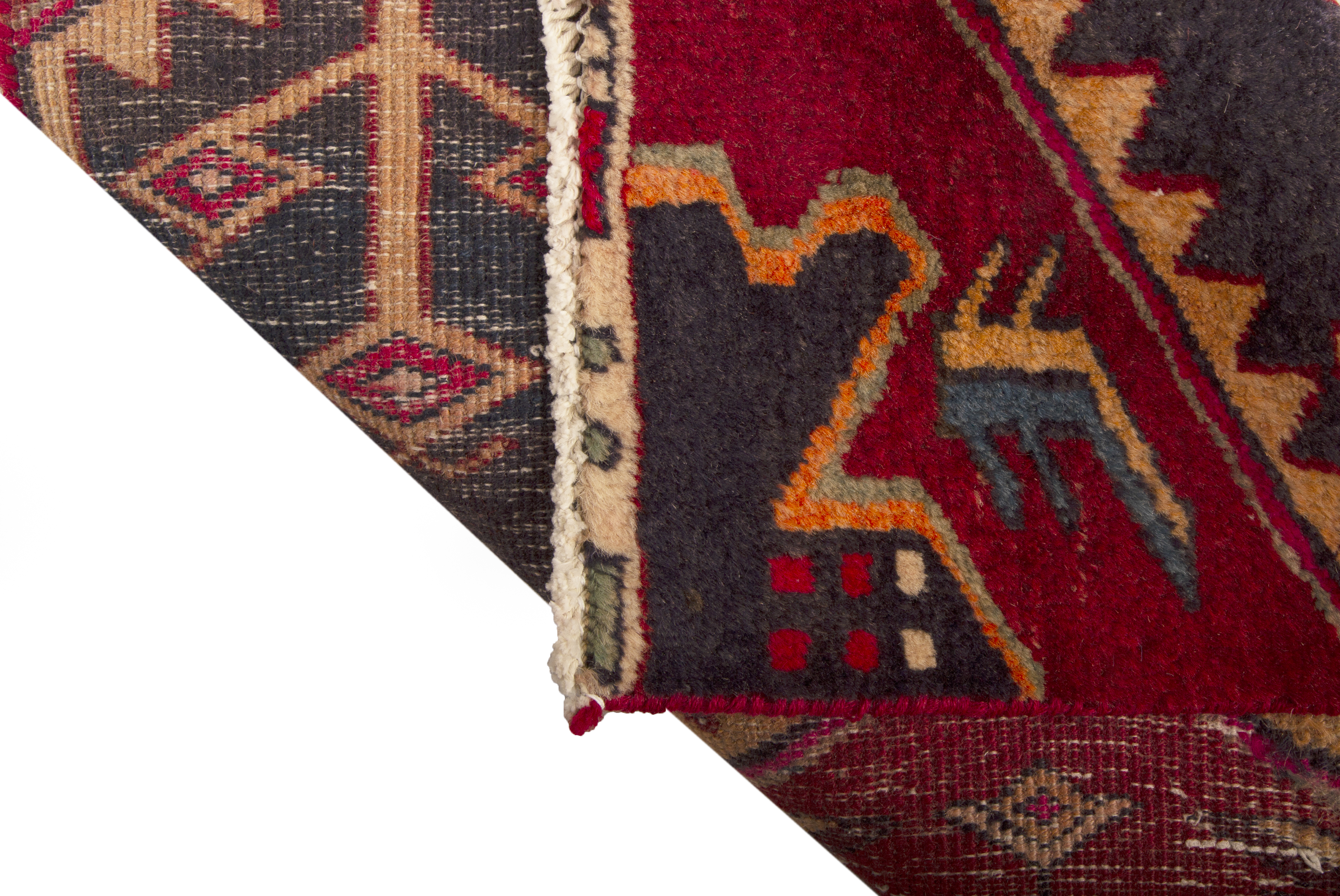 This captivating semi-antique Ardabil Persian runner, measuring 8'6" x 2'0", showcases the distinctive artistry of Persian nomadic weavers through its commanding dark red ground adorned with intricate medallion and geometric motifs. The harmonious interplay of navy blue, cream, burnt orange, turquoise, black, and ochre creates a sophisticated color palette that speaks to decades of natural aging and refinement. This one-of-a-kind hand-knotted masterpiece elevates any hallway, kitchen, or narrow space with its authentic Persian character and timeless appeal.
