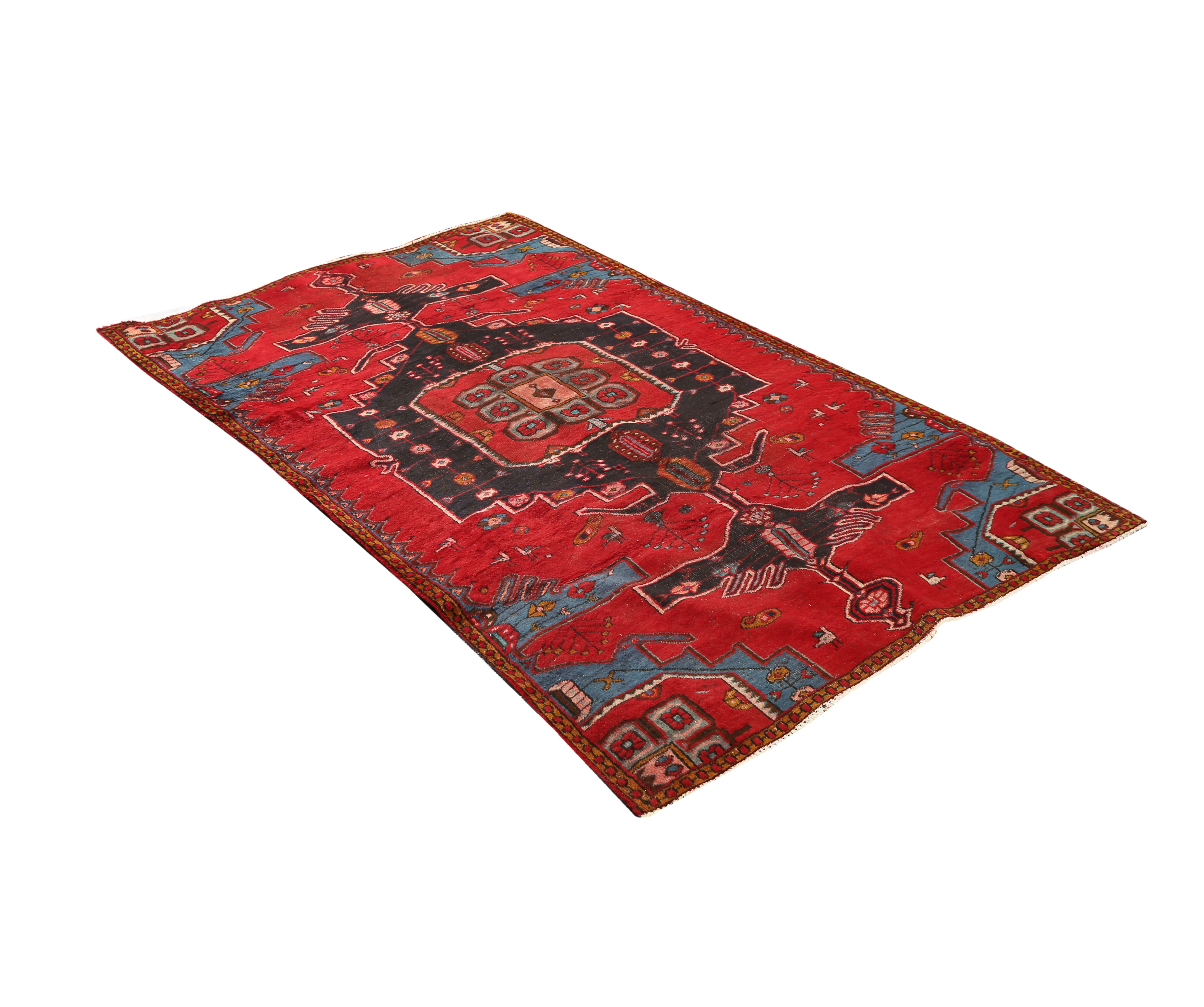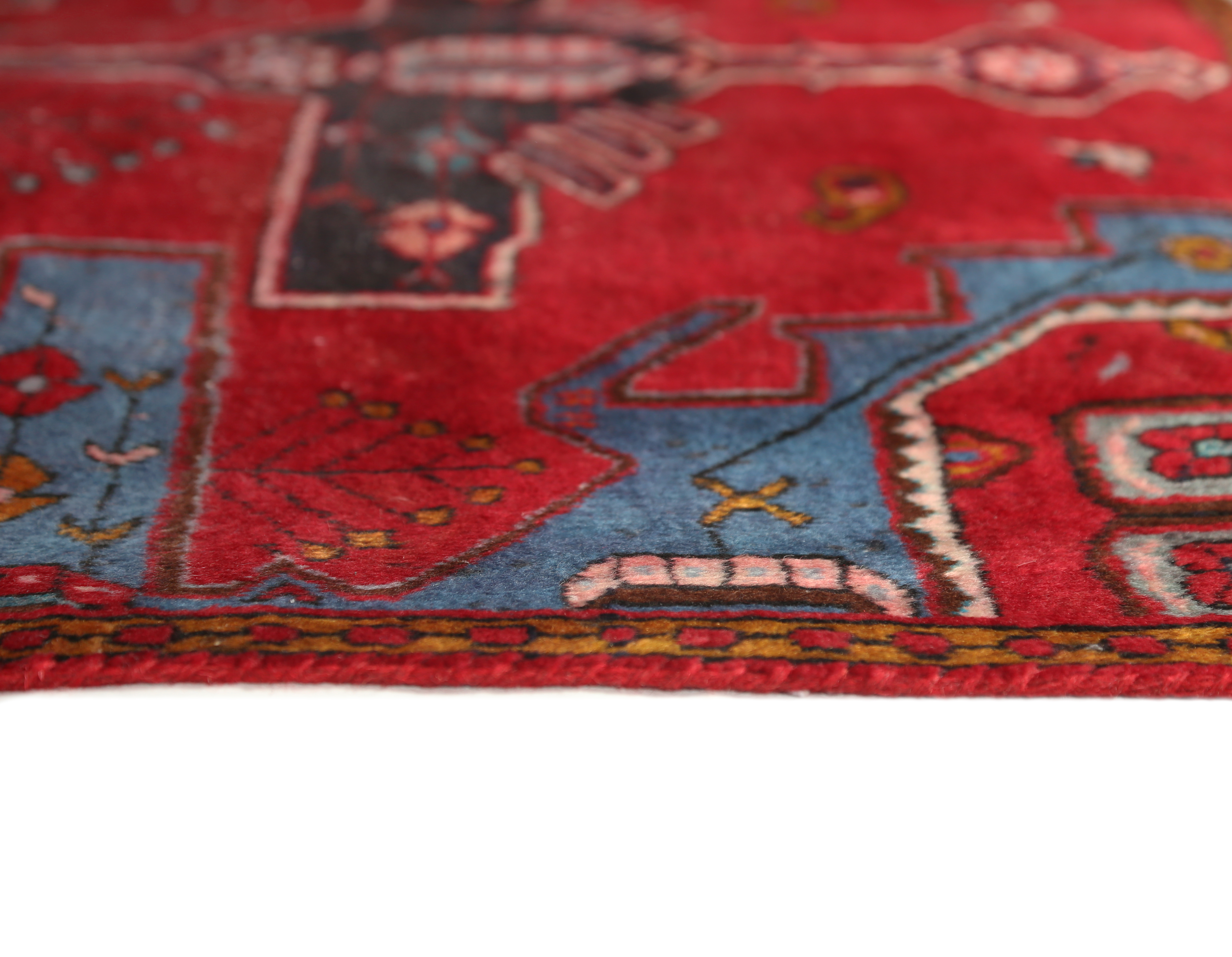 This hand-knotted Semi Antique Mahabad rug from Azerbaijan - 8x5 ft - presents a compelling Geometric composition woven in Red, Blue, a living record of one of Persia's great regional weaving traditions. Natural dyes - derived