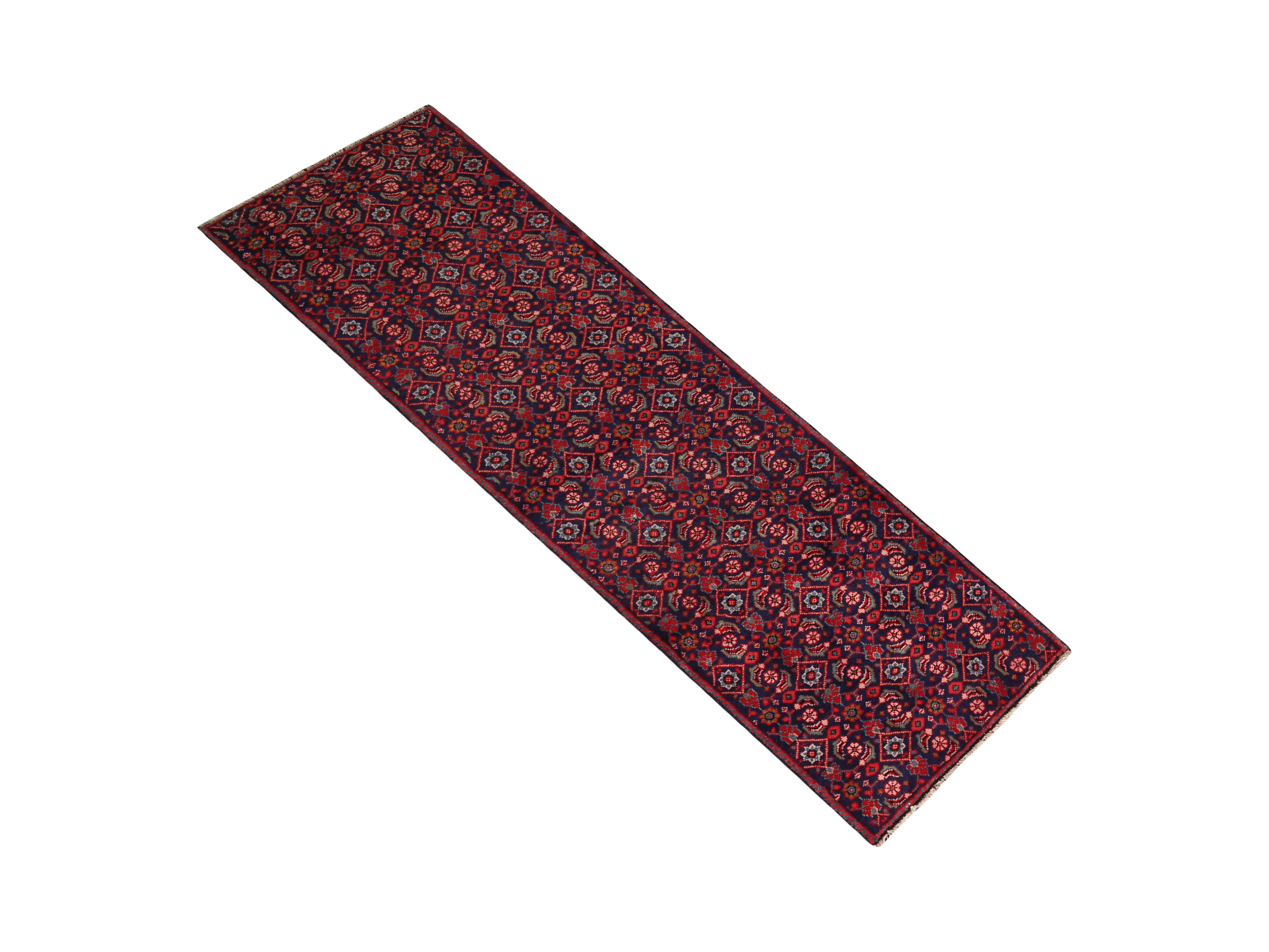 This distinguished semi-antique Mahal Persian rug measuring 9'10" x 2'9" showcases the enduring beauty of traditional Persian craftsmanship through its intricate Herati motif patterns. The rich burgundy foundation is elegantly complemented by navy blue, madder red, ivory, and dark red accents that have gracefully mellowed over its 40-60 years of age, creating a sophisticated color palette that speaks of authentic Persian heritage.
