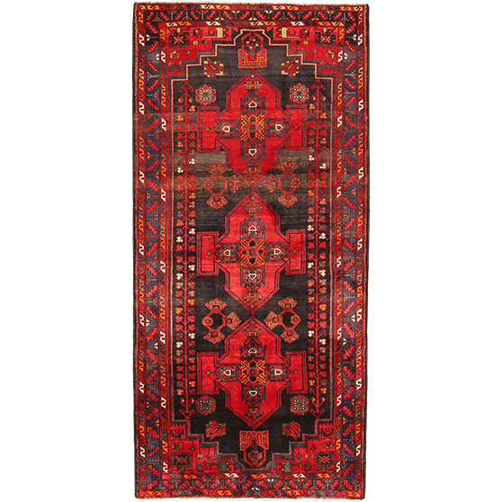 This exceptional semi antique Saveh Persian rug, measuring 9'10" x 4'6", showcases the masterful artistry of Markazi province weavers from four to six decades past. The rich madder red field creates a bold foundation for the intricate medallion (toranj) design, while deep navy blue and dark red accents dance throughout the geometric patterns in harmonious rhythm. This one-of-a-kind hand-knotted masterpiece elevates any space with its authentic tribal character and timeless Persian craftsmanship.