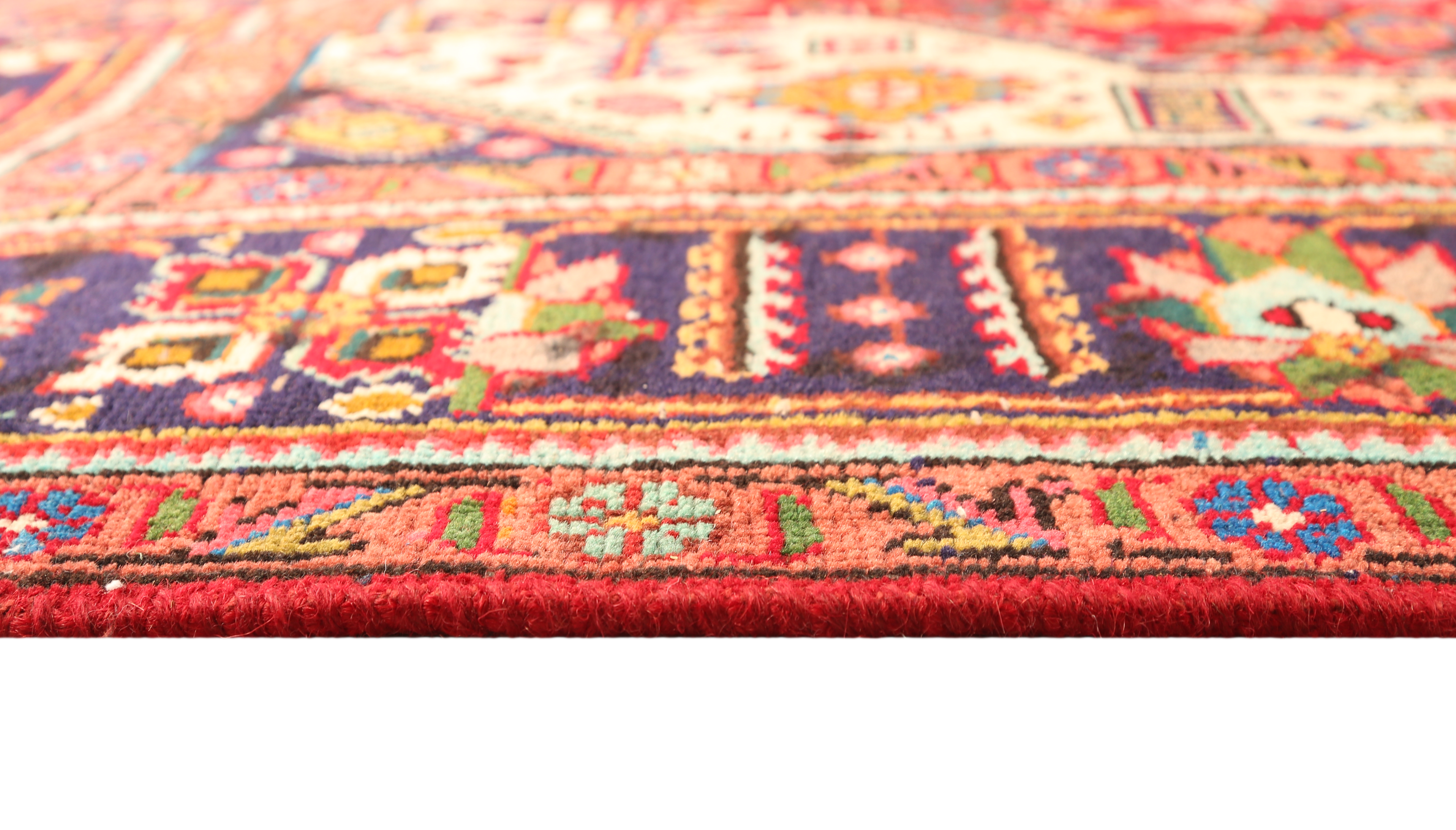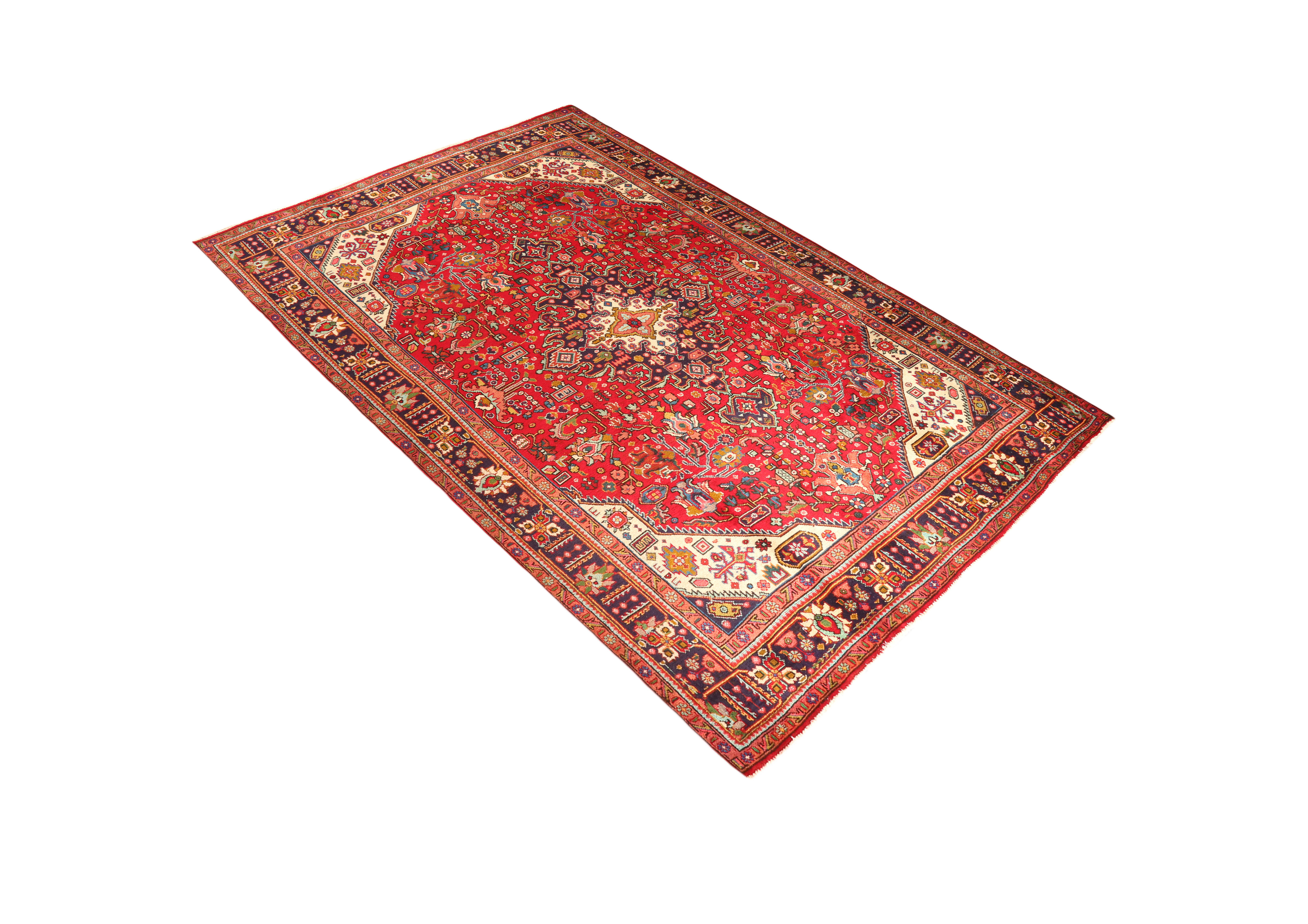 A superb example of Tabriz weaving heritage, this 9x6 ft Semi Antique rug showcases the celebrated Medallion design of Azerbaijan, rendered here in rich tones of Red, Cream with the authority of long tradition. Tabriz rugs