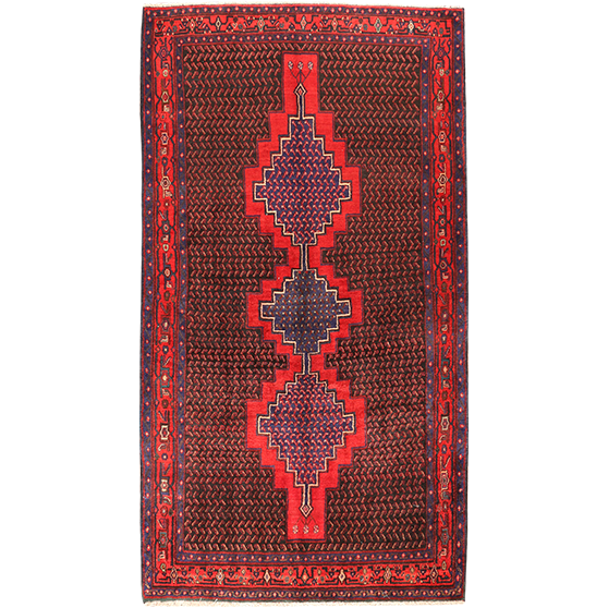 This magnificent semi-antique Senneh Persian rug at 9'12" x 5'1" presents a stunning medallion composition that transforms any living space with its timeless elegance. The deep crimson field serves as a dramatic canvas for the intricate central medallion, while dark red accents create visual depth throughout the design. Navy blue borders frame the composition beautifully, enhanced by delicate cream and ivory details that illuminate the traditional Herati motifs dancing across the field.