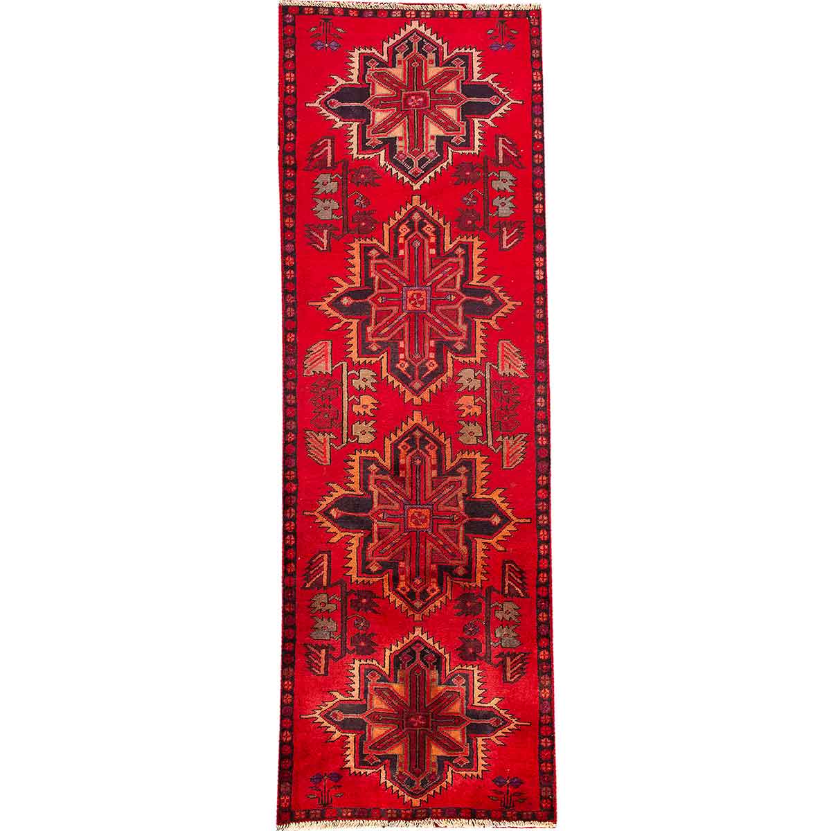 This distinguished semi antique Sarab Persian rug at 9'2" x 2'11" presents a magnificent medallion (toranj) design rendered in a sophisticated palette of red, crimson, navy blue, black, beige, brown, gold, and blue. Woven with symmetrical Ghiordes knots between 40-60 years ago, this authentic piece showcases the exceptional craftsmanship that has defined Sarab weavers in Azerbaijan for generations. The narrow runner proportions make it perfectly suited for hallways, galley kitchens, or as an elegant accent piece beneath console tables.