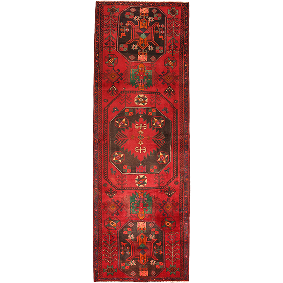This magnificent semi antique Ardabil Persian runner, measuring 9'4" x 2'11", showcases the timeless artistry of northwestern Persian weaving traditions dating back centuries. The striking madder red foundation creates a dramatic backdrop for the intricate medallion design, while deep navy blue and black accents provide sophisticated contrast against touches of cream, brown, green, and gold that dance throughout the geometric patterns.