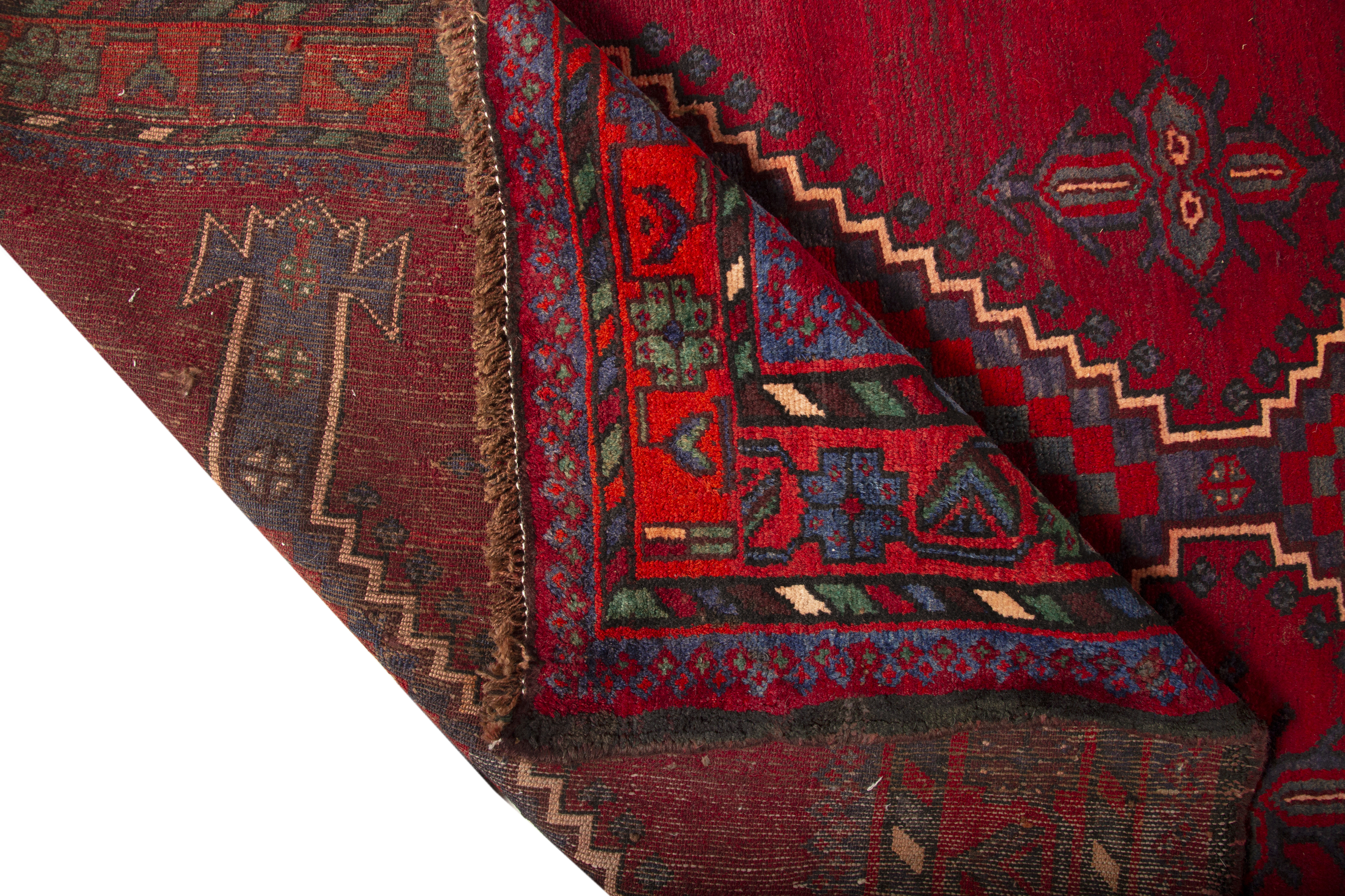 This exceptional semi-antique Garmsar Persian rug at 9'4" x 5'1" showcases the masterful artistry of Semnan province weavers from four to six decades past. The commanding medallion centerpiece draws the eye with its intricate geometric borders, while the rich madder red field creates a striking foundation enhanced by deep navy blue, warm ivory, black accents, golden ochre highlights, and forest green details that speak to the weaver's sophisticated color palette.
