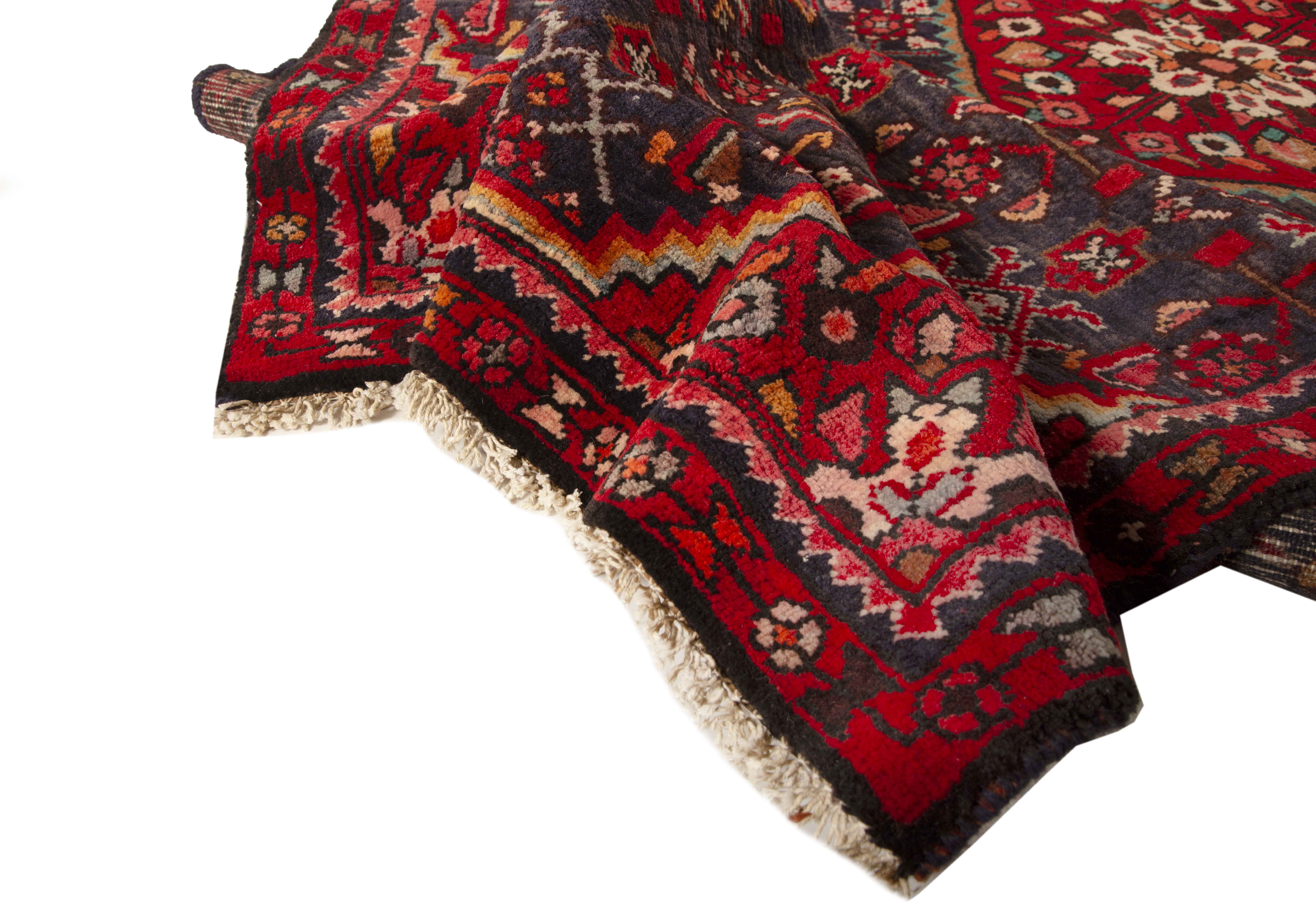 The sophisticated color palette speaks to the weaver's understanding of natural dye traditions, where dark red symbolizes courage and vitality, navy blue represents wisdom and depth, while crimson adds warmth and passion to the overall composition. These colors, achieved through traditional dyeing methods using natural materials, have mellowed beautifully over the decades, creating the subtle variations and lustrous patina that distinguish authentic vintage Persian textiles from contemporary reproductions.