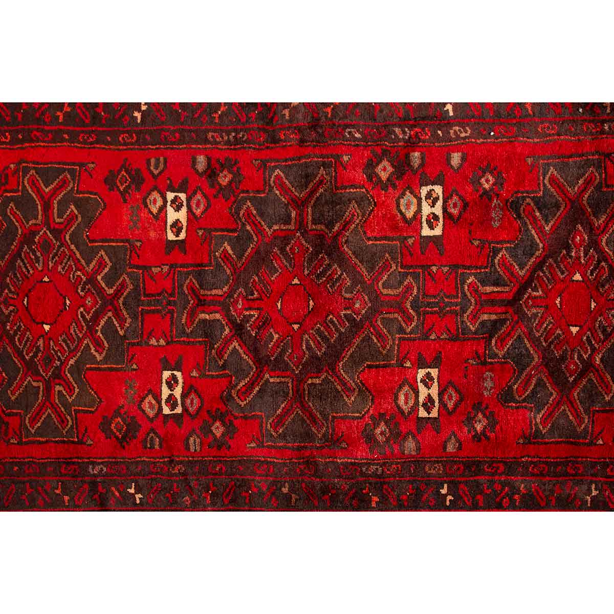 This exceptional 9'6" x 3'7" Khamseh Persian rug showcases the masterful artistry of semi-antique weaving, displaying rich crimson and dark red tones that flow seamlessly into deep burgundy accents. The classic medallion (Toranj) centerpiece commands attention with its intricate geometric framework, while delicate Herati motifs dance throughout the cream-colored field, creating a sophisticated visual narrative that speaks to 40-60 years of careful preservation.
