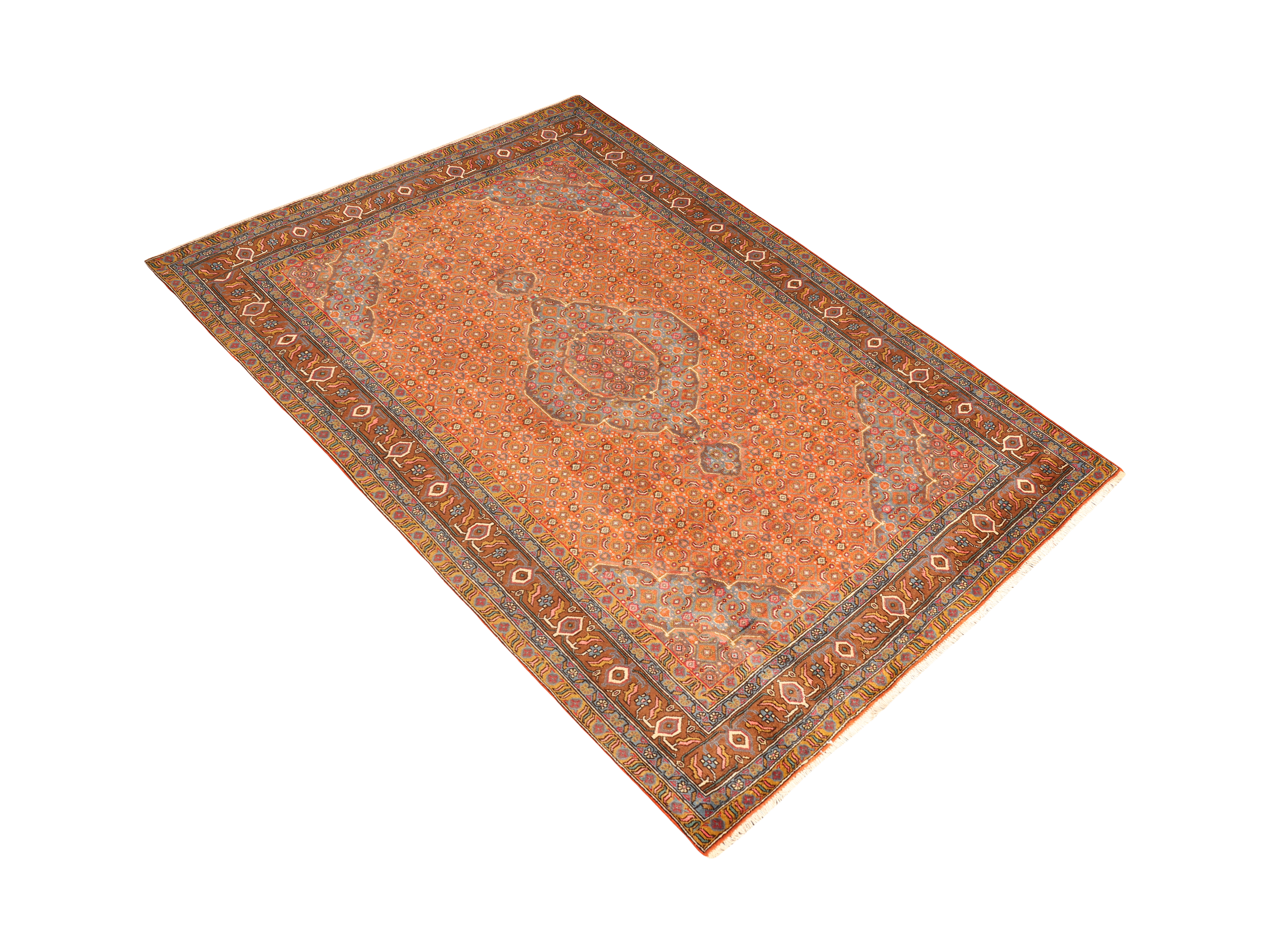 At Los Angeles Home of Rugs, we recognize this as more than mere floor covering-it's a one-of-a-kind hand-knotted masterpiece that elevates any living space into a gallery of Persian artistry. The 9'6" x 6'8" foot dimensions make it perfect for defining conversation areas in larger rooms, anchoring dining spaces, or creating an elegant focal point in master bedrooms. The warm rust and orange palette complements both traditional and contemporary interiors, while the navy and cream accents provide sophisticated contrast that works beautifully with wooden furniture, leather seating, or modern minimalist décor.