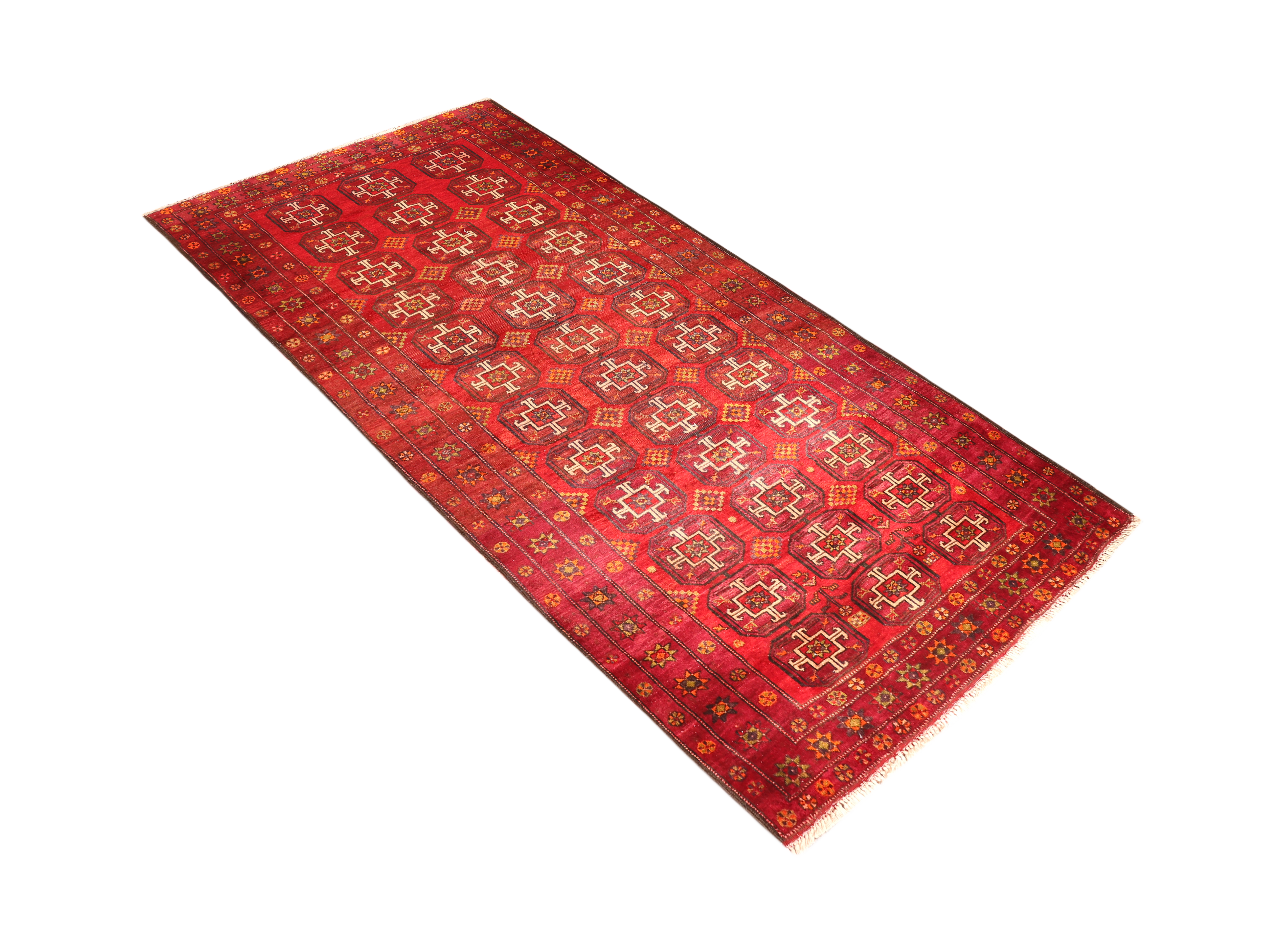 This magnificent semi antique Baluch Persian rug measuring 9'7" x 5'1" showcases the remarkable artistry of nomadic weavers from the Sistan and Baluchestan province. With its rich palette of red, crimson, and dark red beautifully contrasted by cream, ivory, and black accents, this exceptional piece features the iconic Turkmen gul motifs that have adorned Baluch textiles for centuries. The subtle gold and brown undertones add depth and warmth to the geometric compositions, creating a tapestry that speaks of ancient tribal traditions and masterful craftsmanship.