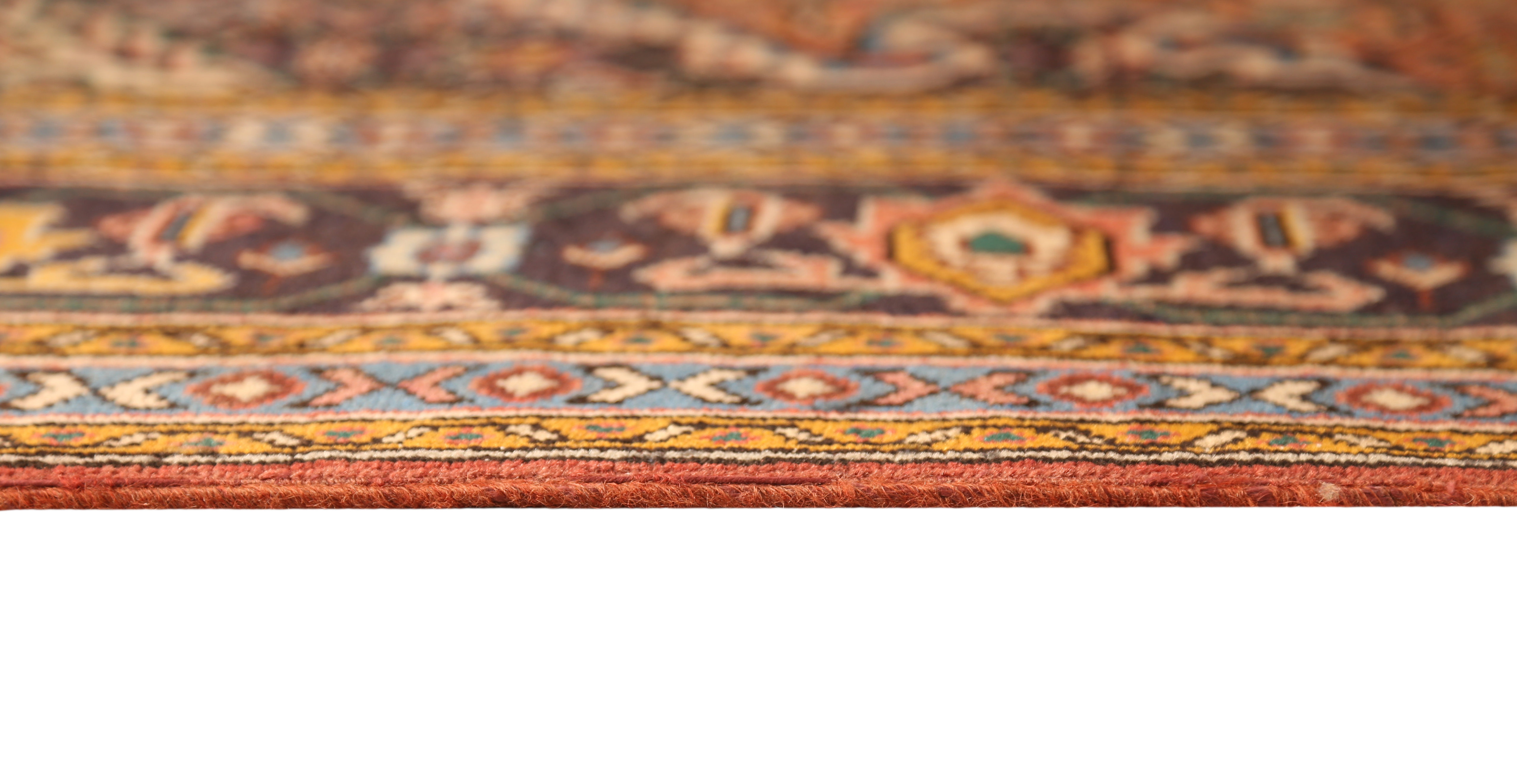 This magnificent semi antique Ardabil Persian rug measuring 9'7" x 6'8" showcases the timeless elegance that has made these weavings legendary throughout Persia for over four centuries. The striking rust red field creates a warm foundation for the intricate medallion (Toranj) centerpiece, while complementary tones of cream, navy blue, and ivory dance throughout the composition. Los Angeles Home of Rugs presents this exceptional piece as a testament to the enduring artistry of Persian craftsmen who have passed down their techniques through countless generations.