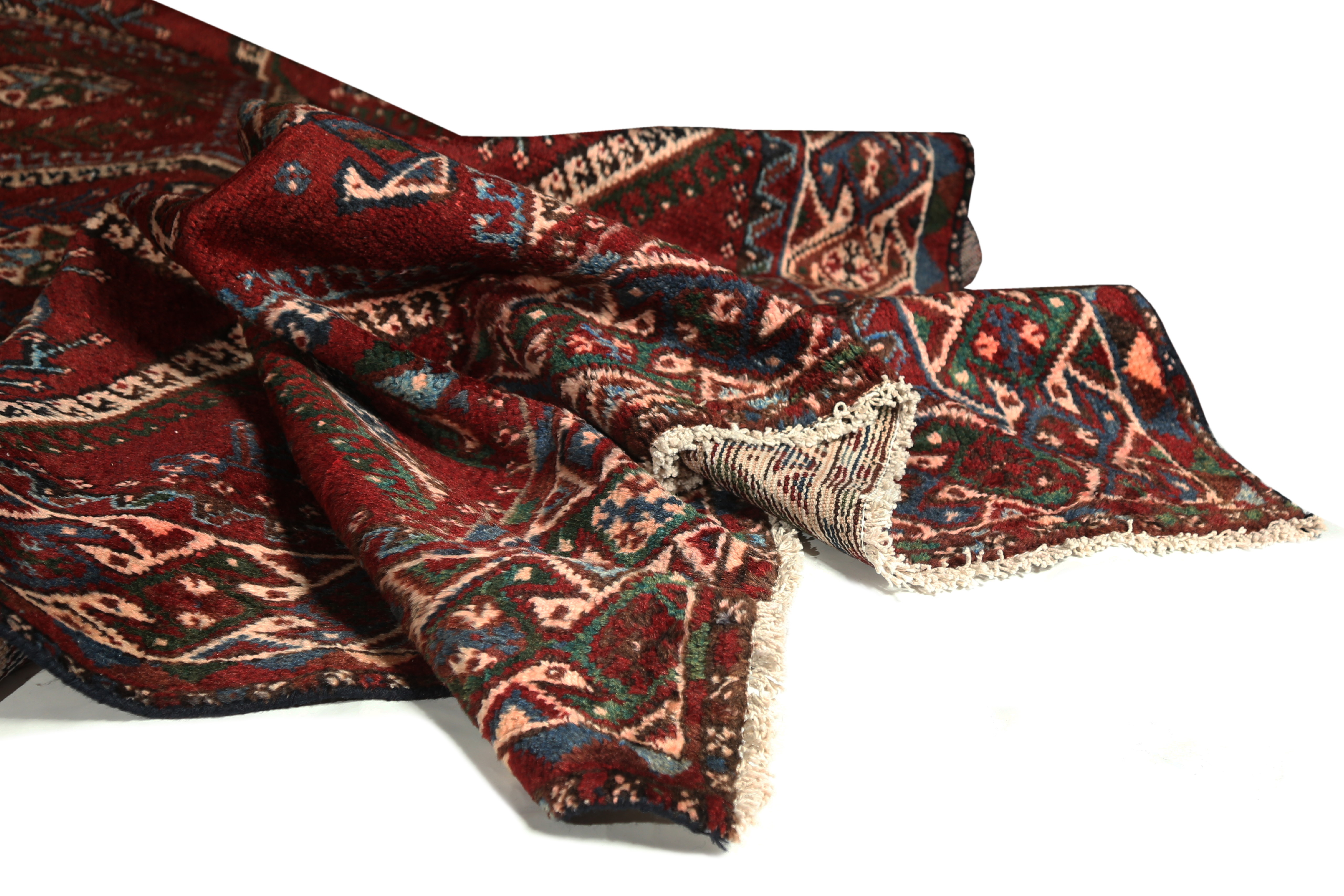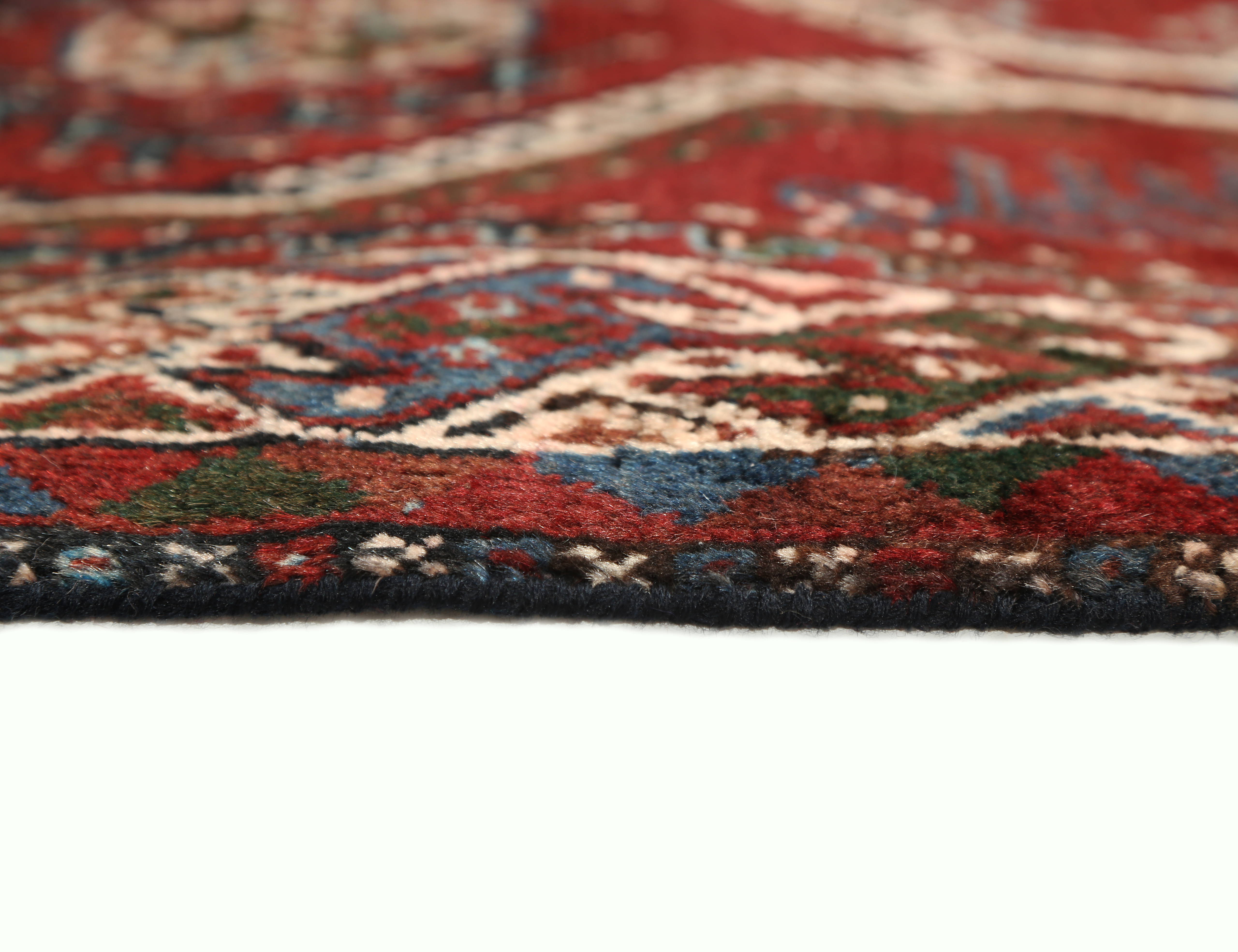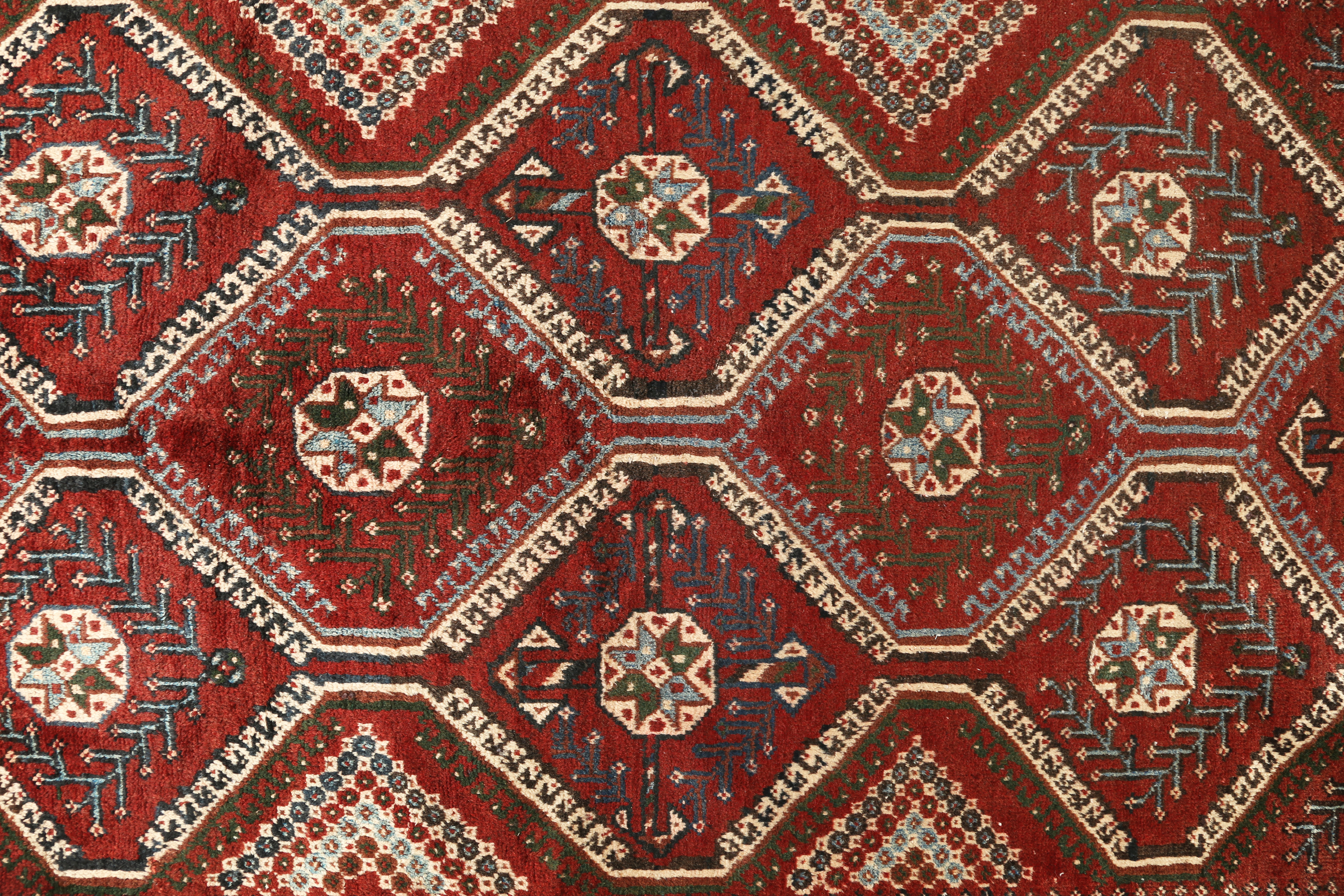 The Shiraz weaving tradition emerged from the nomadic Qashqai and Khamseh tribes who migrated through the Fars region surrounding the ancient city of Shiraz. These masterful weavers developed their geometric vocabulary over centuries, creating rugs that served both practical and ceremonial purposes in their mobile lifestyle. The diamond lattice pattern symbolizes protection and continuity, with each geometric form representing elements from the natural world that sustained these pastoral communities. This particular rug demonstrates the sophisticated color sensibilities of Shiraz weavers, who achieved their signature madder red through natural dyes extracted from rubia tinctorum roots.