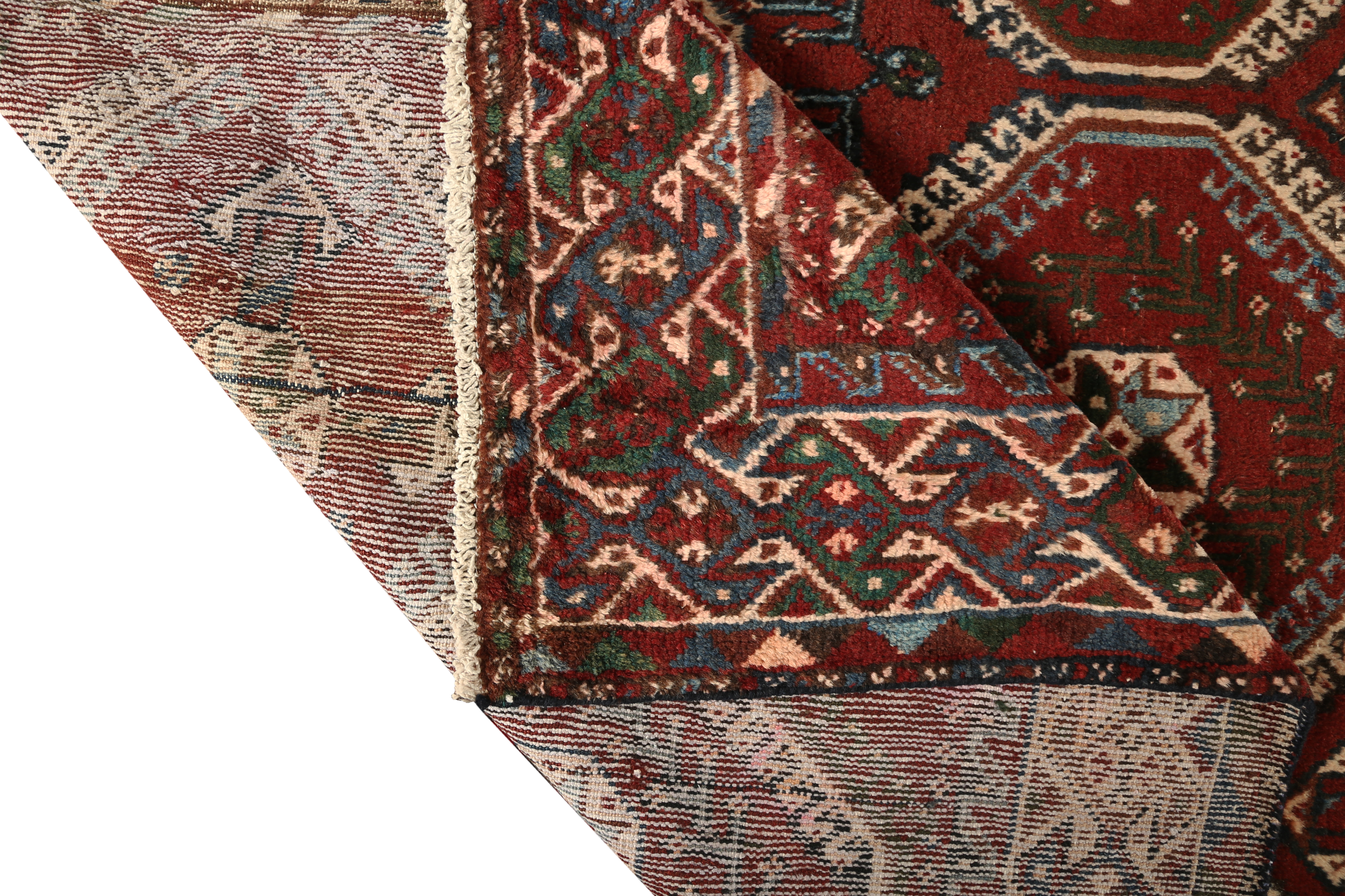 This exceptional semi antique Shiraz Persian rug measures 9'8" x 5'3", showcasing the distinctive diamond lattice motifs that define the tribal heritage of Fars Province. The commanding madder red foundation creates a bold canvas for intricate geometric patterns rendered in cream, rich brown, warm camel, deep navy blue, and striking black accents. Dating to the mid-20th century, this 40-60 year old treasure carries the authentic character and noble patina that only comes with decades of careful use and aging.