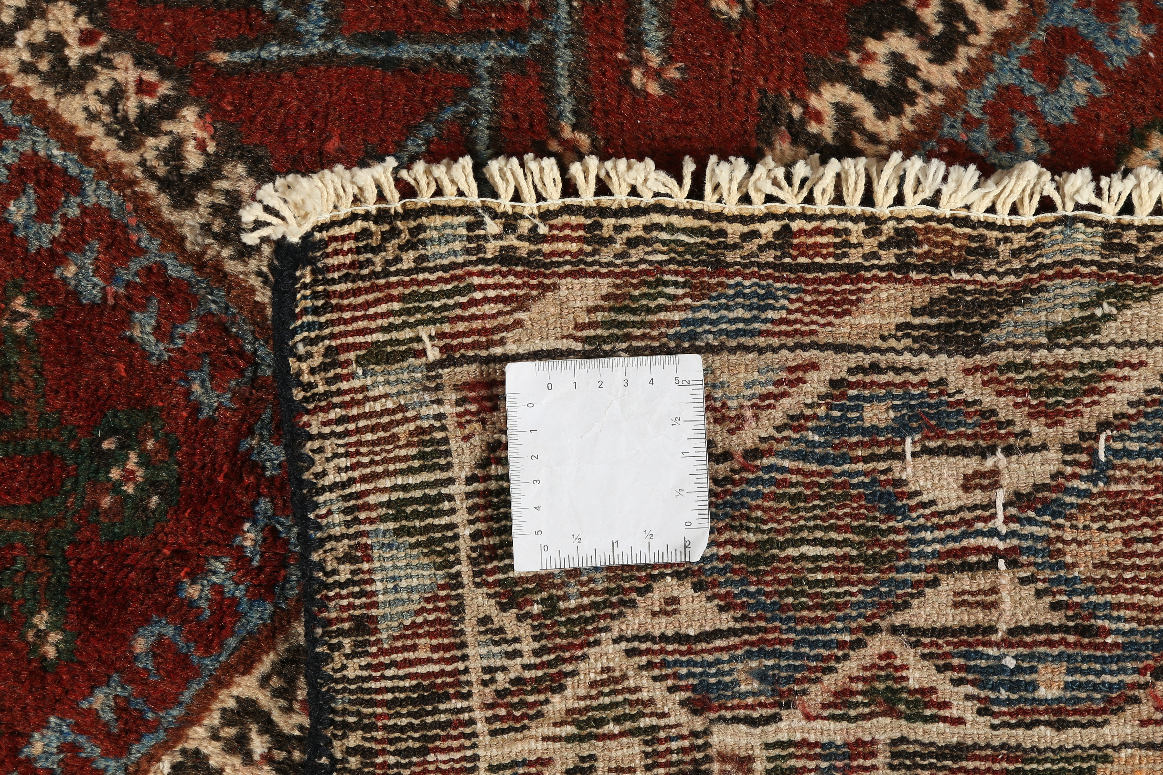 The harmonious interplay of madder red, cream, and brown creates a grounding presence perfect for both traditional and contemporary interiors. The geometric diamond motifs provide visual structure while the varied tonal depths add sophistication to any room setting. Navy blue accents introduce cool balance against the warm earth tones, while strategic black details provide crisp definition to the overall composition. This versatile 9'8" x 5'3" foot size works beautifully as a statement piece in dining rooms, studies, or bedroom settings where its tribal character can be fully appreciated.