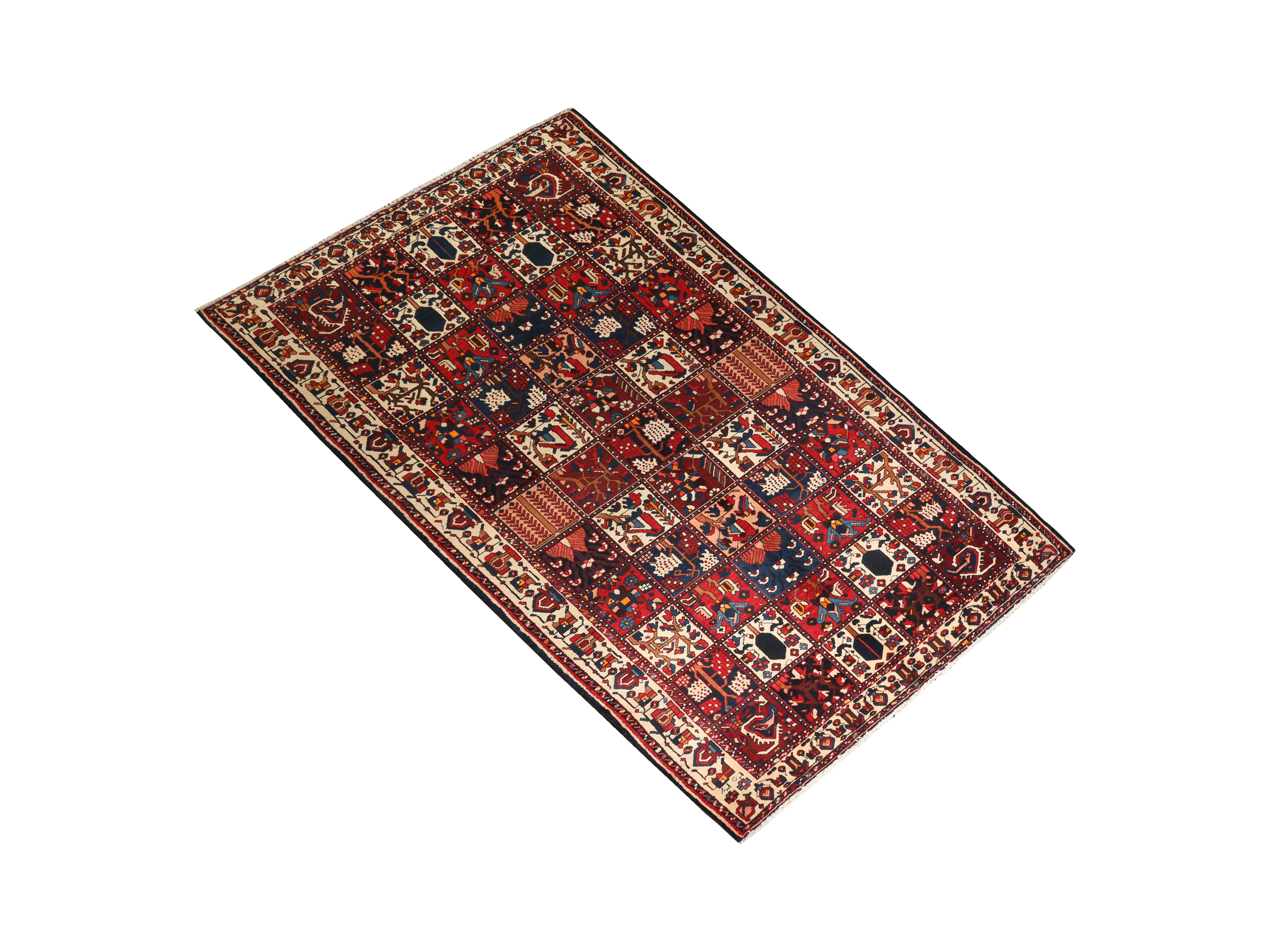 The signature design vocabulary of Bakhtiari rugs centers on the garden panel or compartment layout - one of the most distinctive compositional formats in all of Persian weaving. The field is divided into a regular grid of squares, diamonds, or hexagons, each containing its own botanical vignette: a towering cypress tree, a vase overflowing with flowers, a pomegranate branch heavy with fruit, a flowering shrub drawn with botanical affection. This compartmentalized garden represents the Persian paradise - the walled garden of earthly perfection.